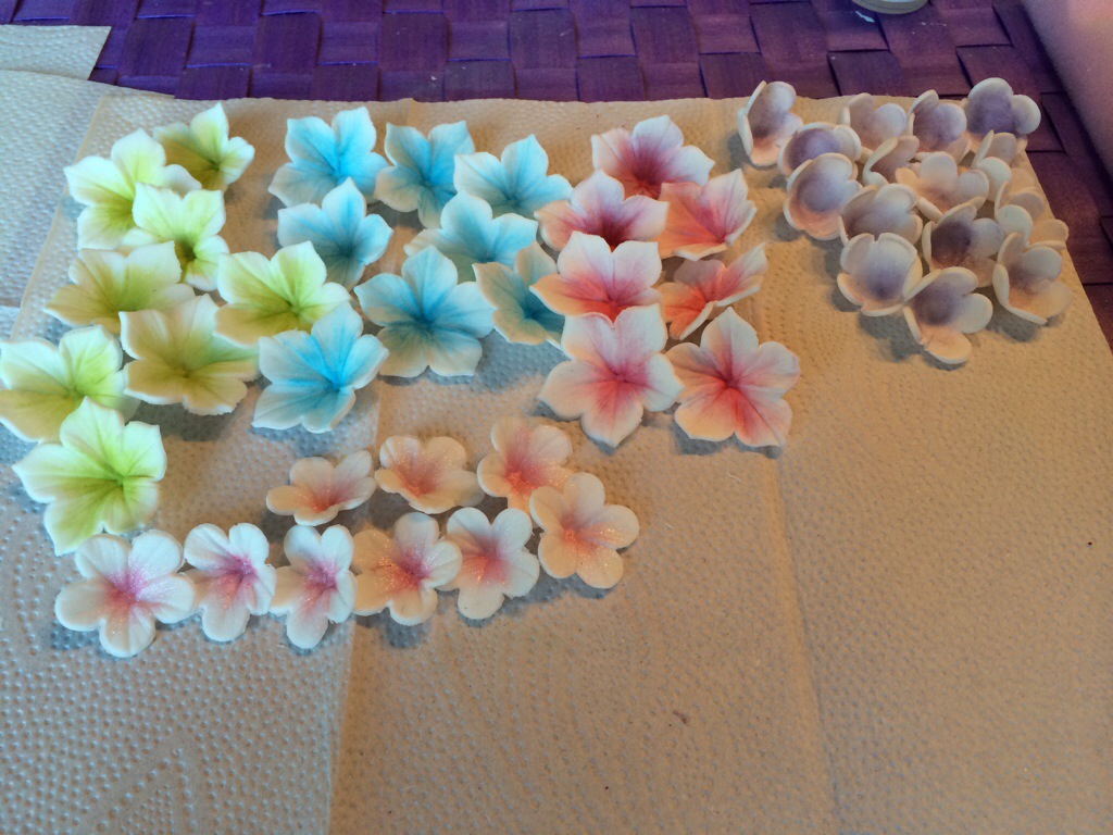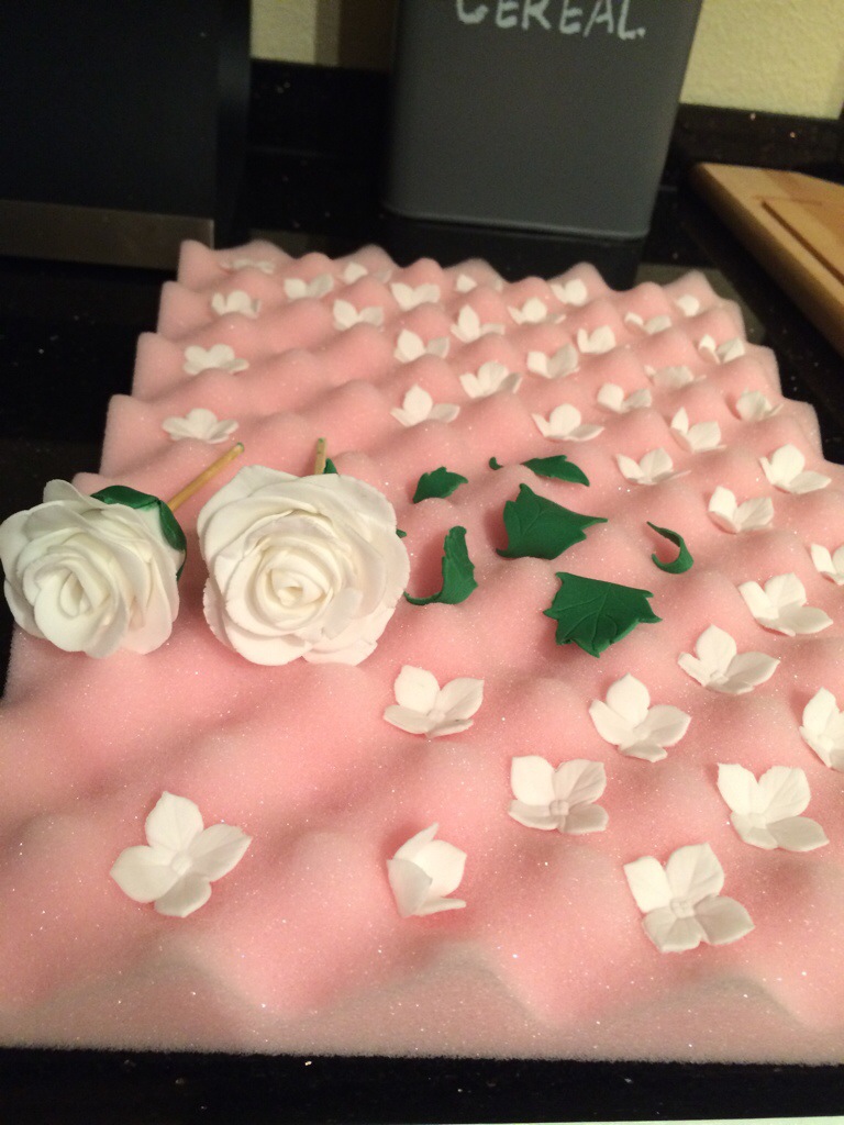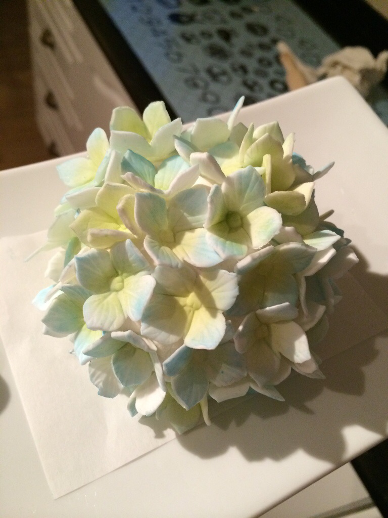 Jeg har fått noen spørsmål om hvordan jeg laget hortensiaballen, så tenkte jeg skulle legge til en forklaring på det. Jeg tok litt kakeavskjær fra jeg jevnet ut kaken, en klatt smørkrem og laget rett og slett en stor cakepop. Denne trakk jeg med hvit marsipan, og festet blomstene med spiselig lim , funket kanon og jeg følte meg kjempekreativ;)