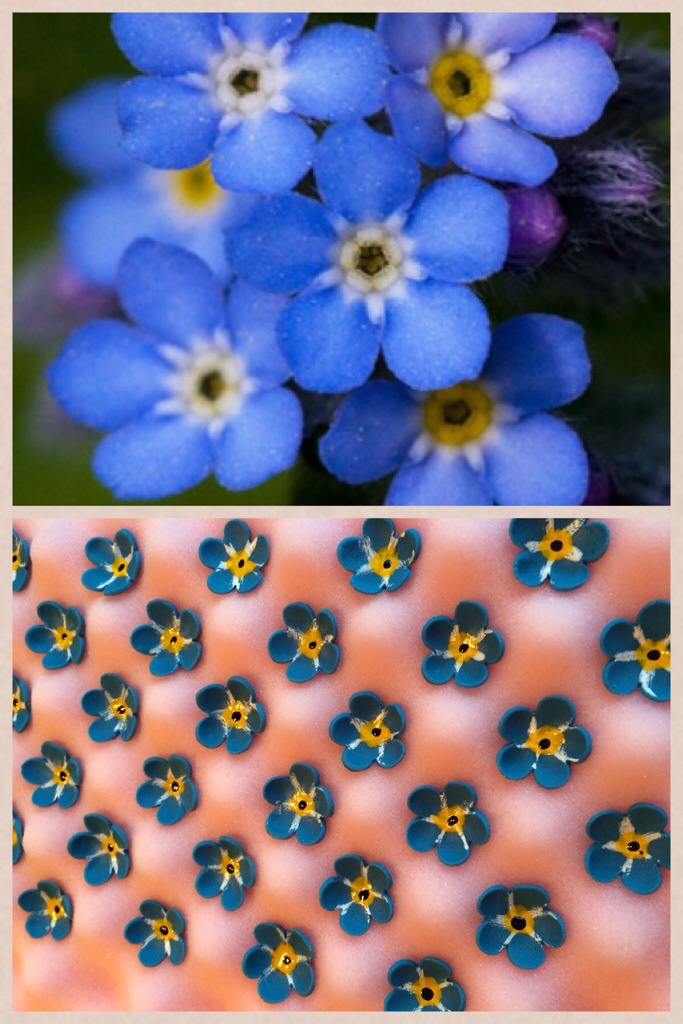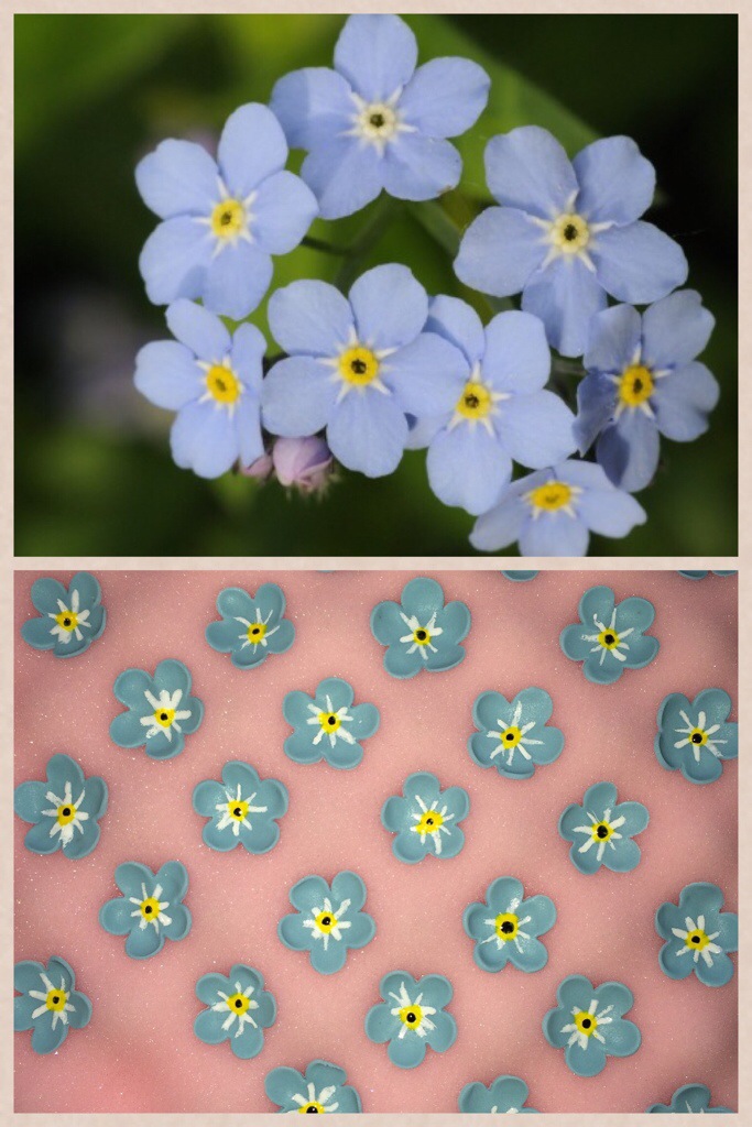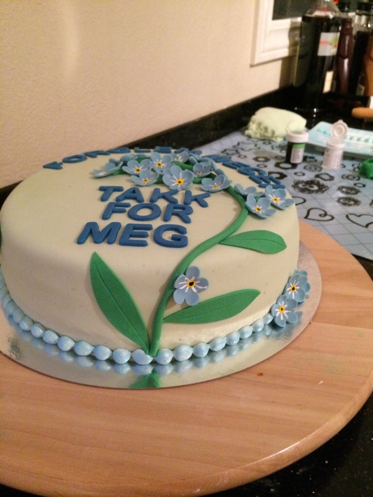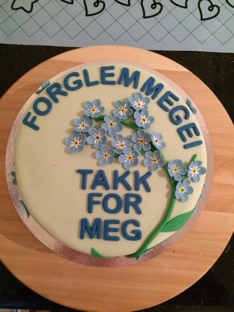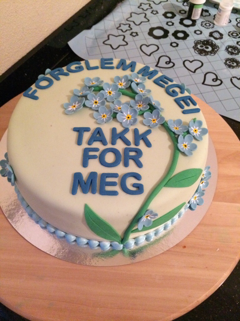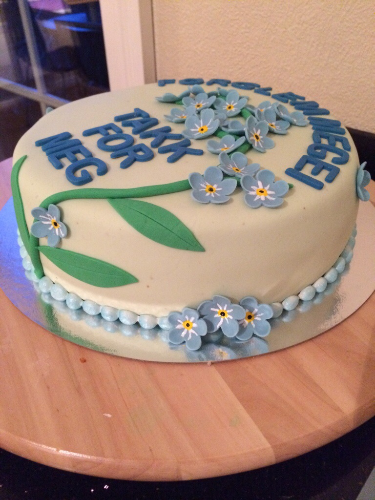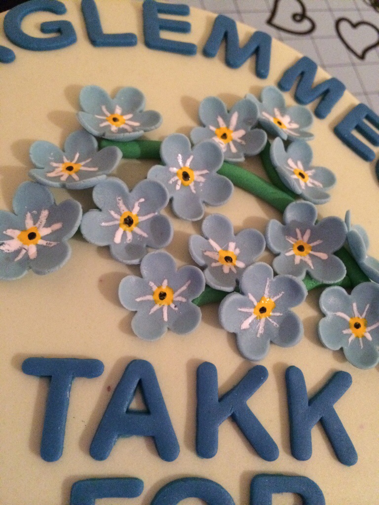 Når det gjelder pynten på denne kaken tok jeg utgangspunkt i navnet på avdelingen hennes: Forglemmegei. Jeg laget derfor masse små forglemmegei-blomster i marsipan. Men noen ganger, sånn som i dag, er det ikke bare-bare å være perfeksjonist. Jeg fant først et bilde av en ganske mørk blå utgave, og laget denne i går kveld. Penslene jeg brukte til å male det hvite, gule og svarte i midten var ikke helt små nok heller, så jeg ble ikke helt fornøyd med resultatet, men tenkte at det sikkert ble bra når jeg satt det sammen. Men jo mer jeg tenkte på det, så på blomstene jeg hadde laget, og flere bilder på nett, desto mer overbevist ble jeg om at jeg ikke ville levere kaken med sånne blomster på. Så i formiddag tok jeg turen på Traktøren og skaffet mindre pensler. Så begynte jeg på nytt: farget marsipan i en lysere blåfarge, malte med mindre og langt bedre pensler og ble i alt mye mer fornøyd.