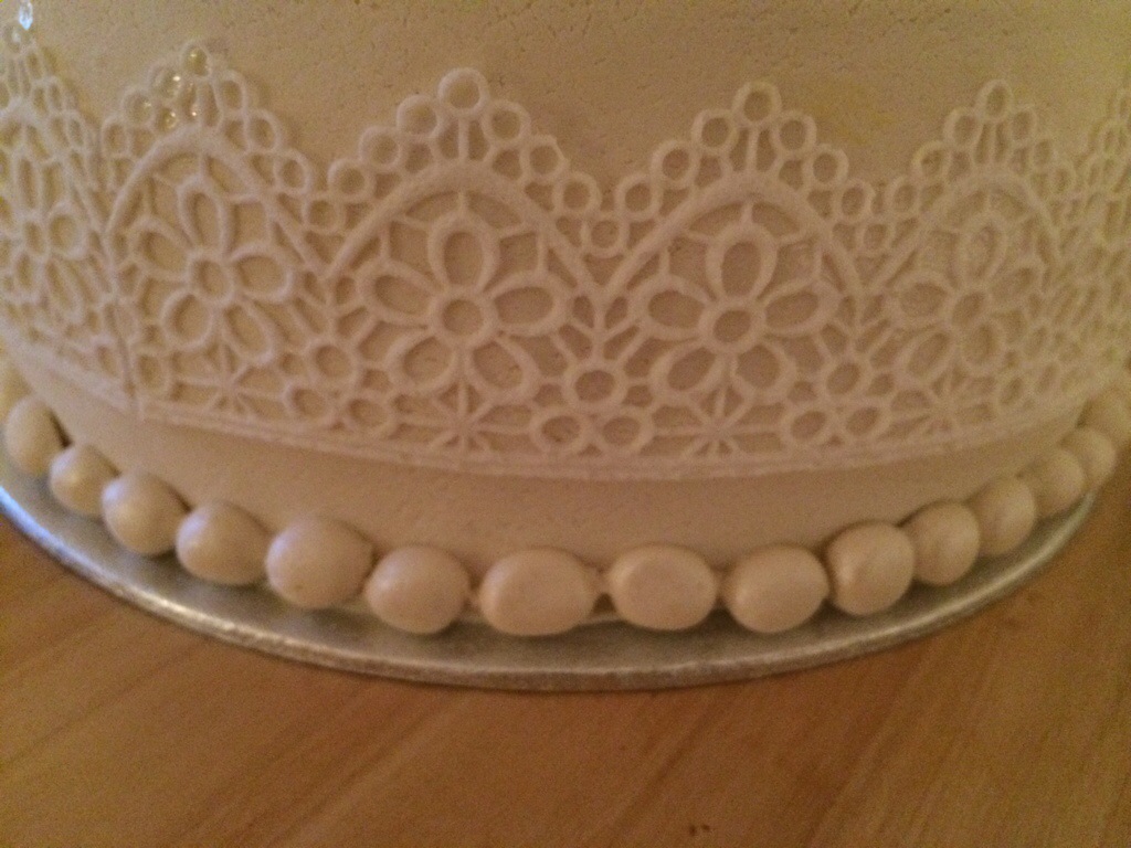 Når det gjelder pynten på denne kaken har jeg testet noe nytt: blonder! Kjempeartig, og det funket som bare det. Brukte silikonmatter og tricotmiks, og tørket 10 minutter i ovnen. Resultatet ble skikkelig stilig og dette kommer definitivt til å brukes mye.