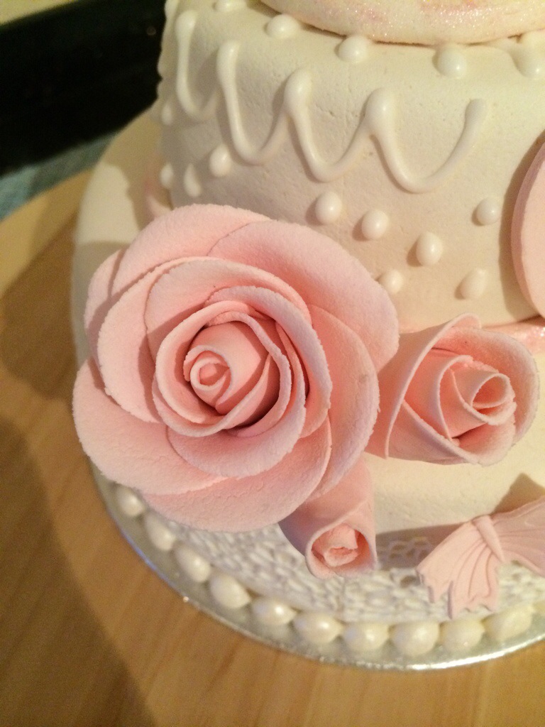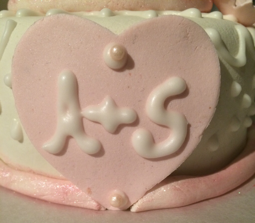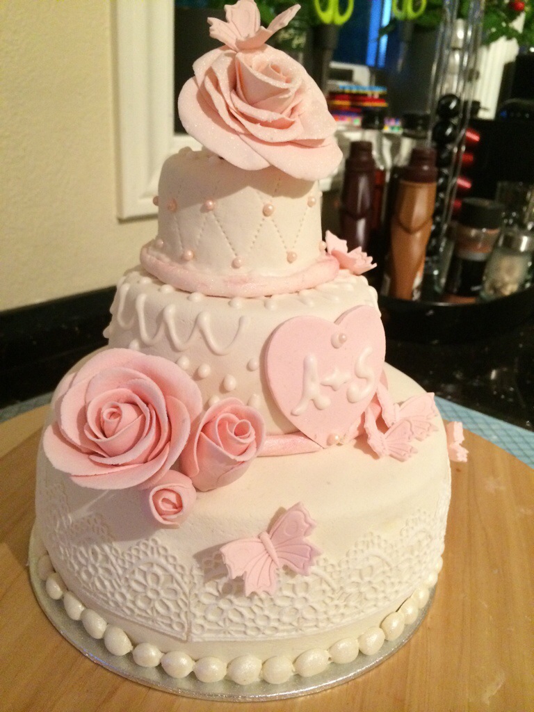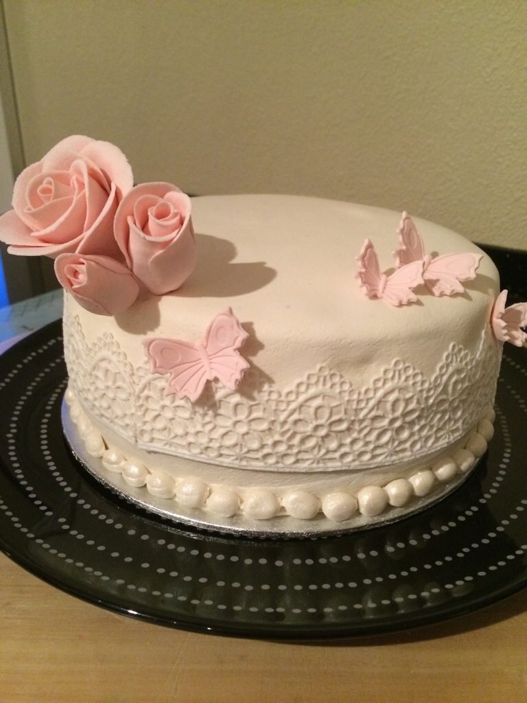 Hadde jeg visst at det ble så bra hadde jeg brukt det på hele kaken, som i stedet er et sammensurium av ulik romantisk pynt; roser, sommerfugler, hjerte med bokstavene våre på, rutemønster med sukkerperler og royal icing (jeg ville bare teste om sånne drop-lines er så enkelt som det ser ut når Cakeboss gjør det på TLC. Det er det ikke, men det ble nå sånn tålig bra til slutt).