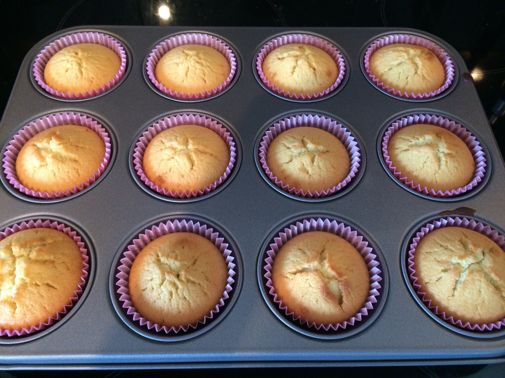 Fyll muffinsformer 3/4 fulle, og stek på 200 grader i ca 20 minutter midt i ovnen. Sjekk med kakenål at de er gjennomstekt før de tas ut. Avkjøl på rist.