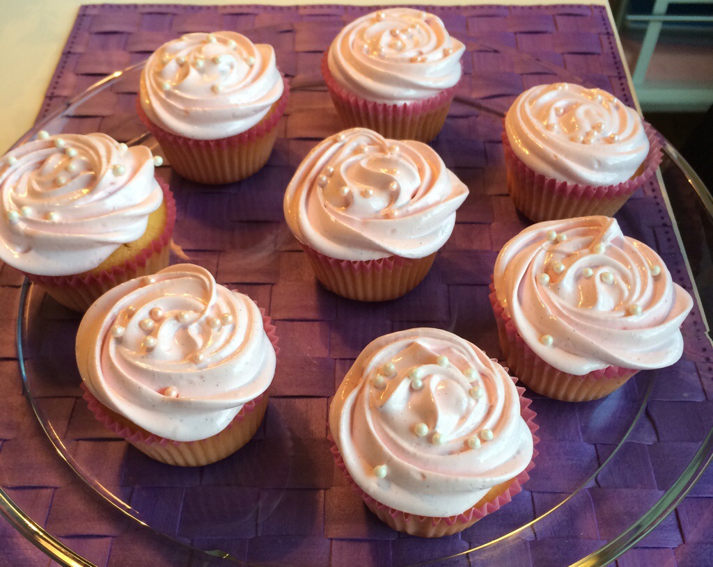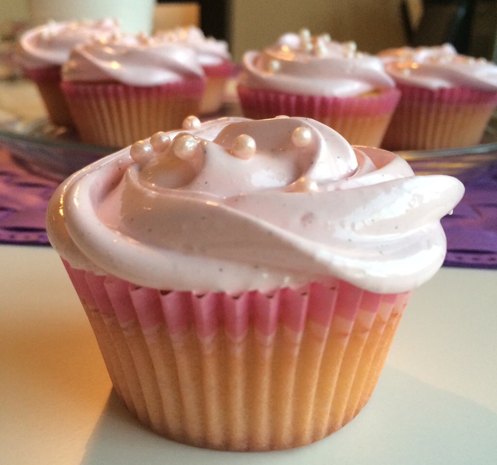 En runde cupcakes snek visst litt i køen av planlagte bakverk. Cupcakes er så koselig å lage! Også så kjapt og enkelt. Denne typen baking drev jeg mye med før jeg fikk øynene opp for store kaker og dekorering, har ikke tall på hvor mange runder med cupcakes og makroner som har kommet ut av ovnen min 🙂 I dag har jeg laget vaniljecupcakes med vanillabeanfrosting. Jeg har tatt utgangspunkt i oppskrifter fra bloggen Passion4baking, men jeg har gjort noen endringer for tilpasse dem til egen smak, har blandt annet tilsatt litt salt i røren, og salt og sitron i frostingen, noe jeg nesten alltid gjør når jeg baker for å unngå at det blir for søtt. Tro meg, cupcakes’ene ble mer enn søte nok likevel 😉 Jeg eksperimenterte også med å tilsette en god klatt vaniljekrem i røren, og det ble veldig saftig og godt! Oppskrift kommer her: