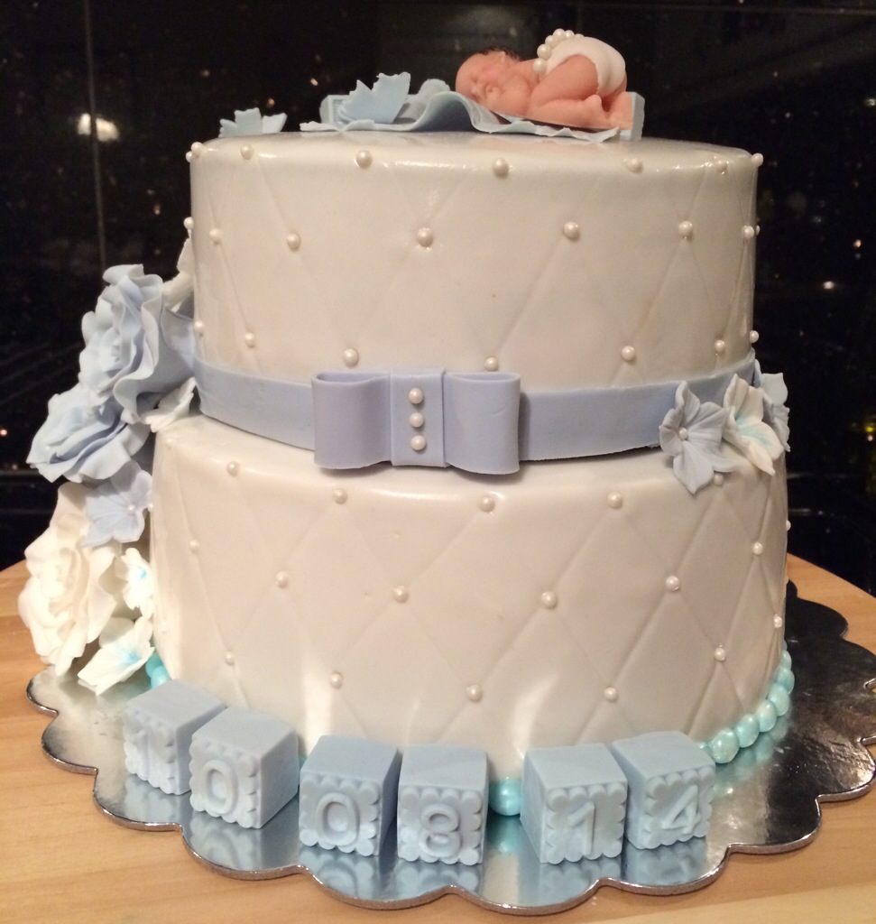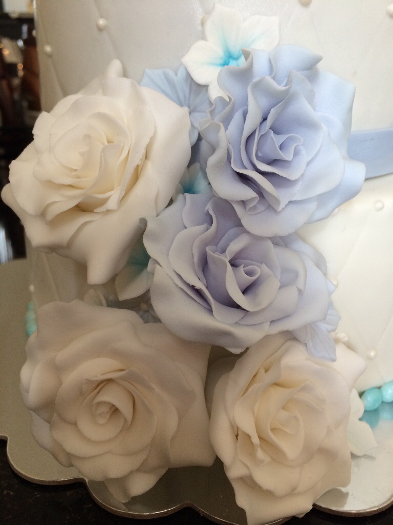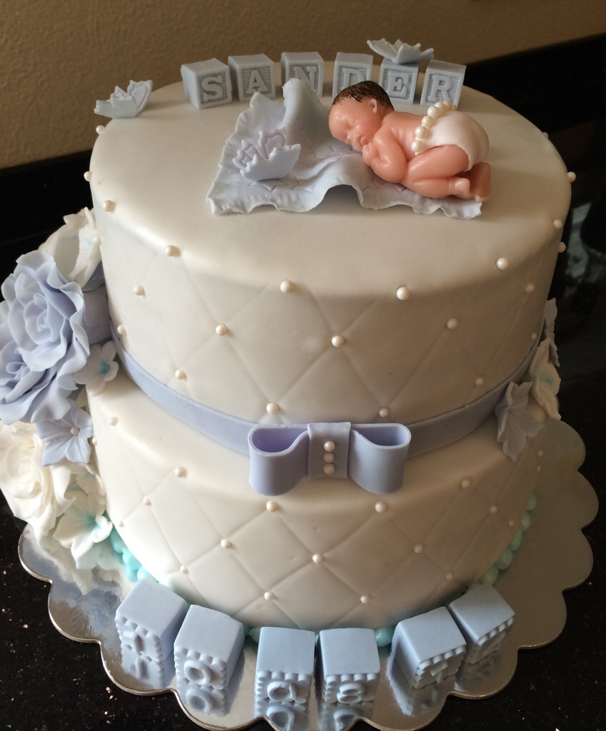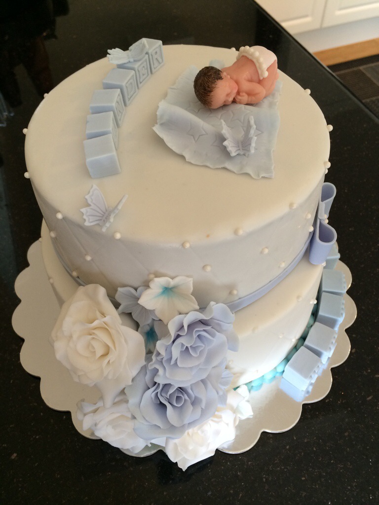Mammaen til Sander ville ha en kake som gikk i hvitt og duse blåtoner, med roser på siden og mørkhåret baby på toppen 🙂 Her kommer noen bilder av kaken, samt noen detaljbilder: