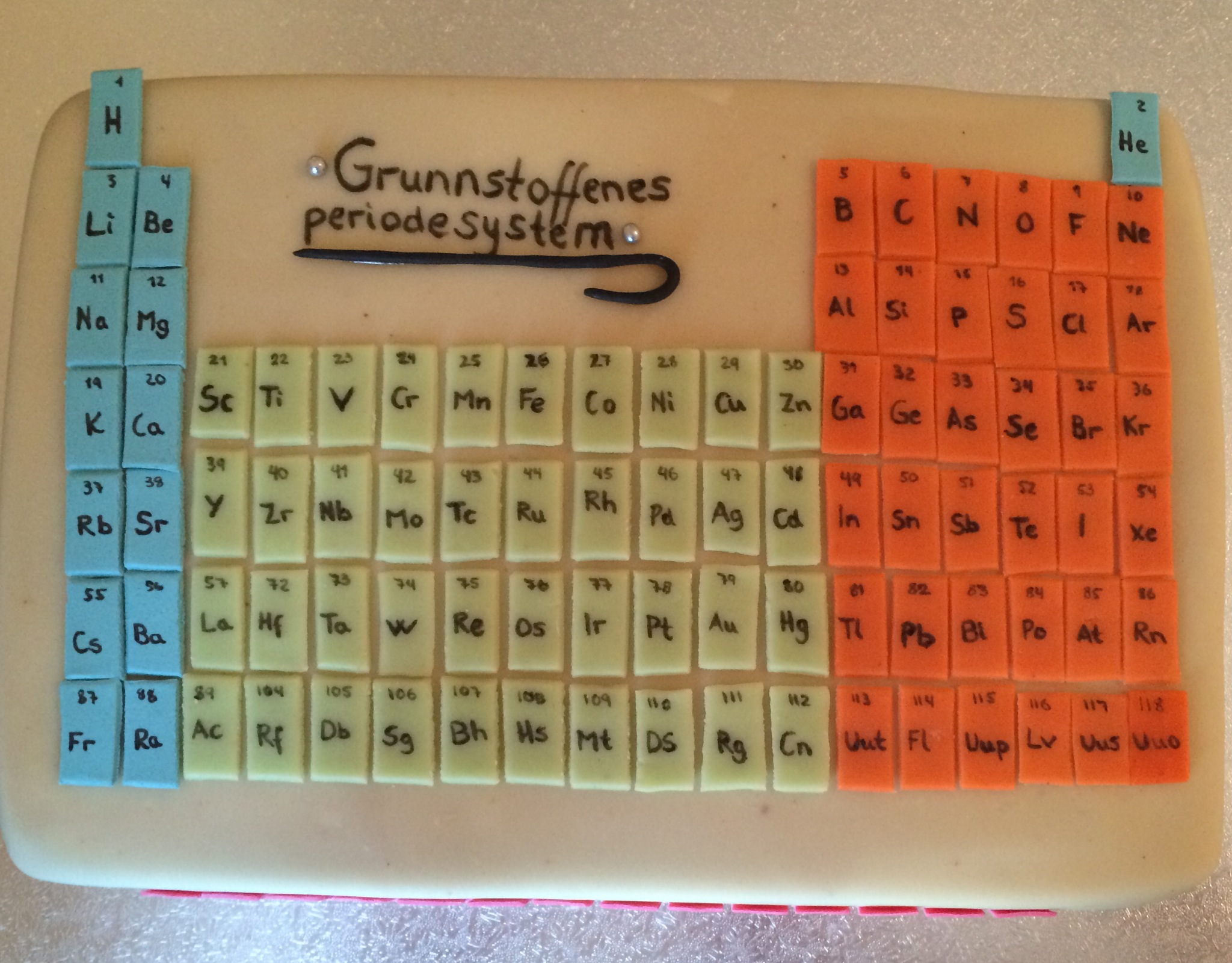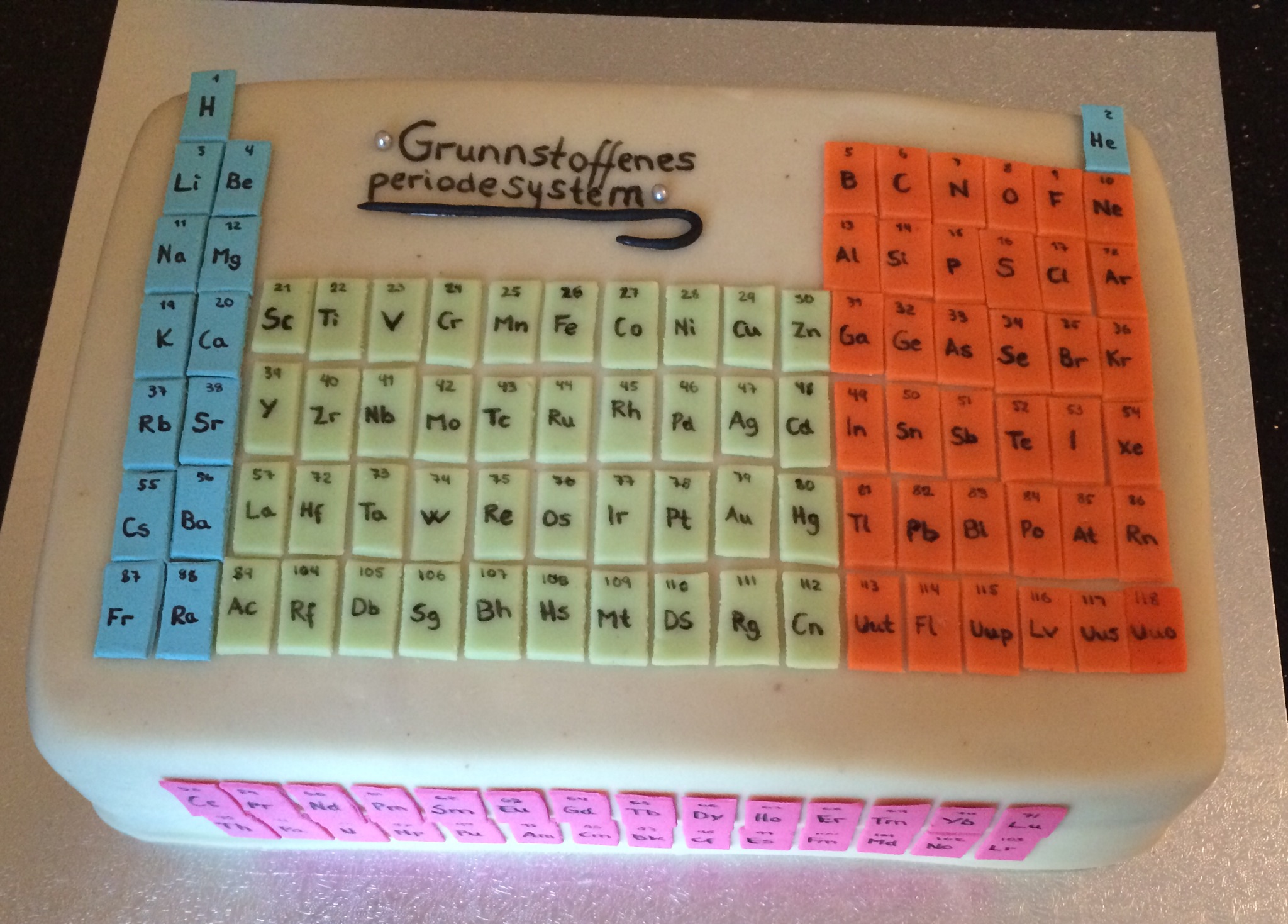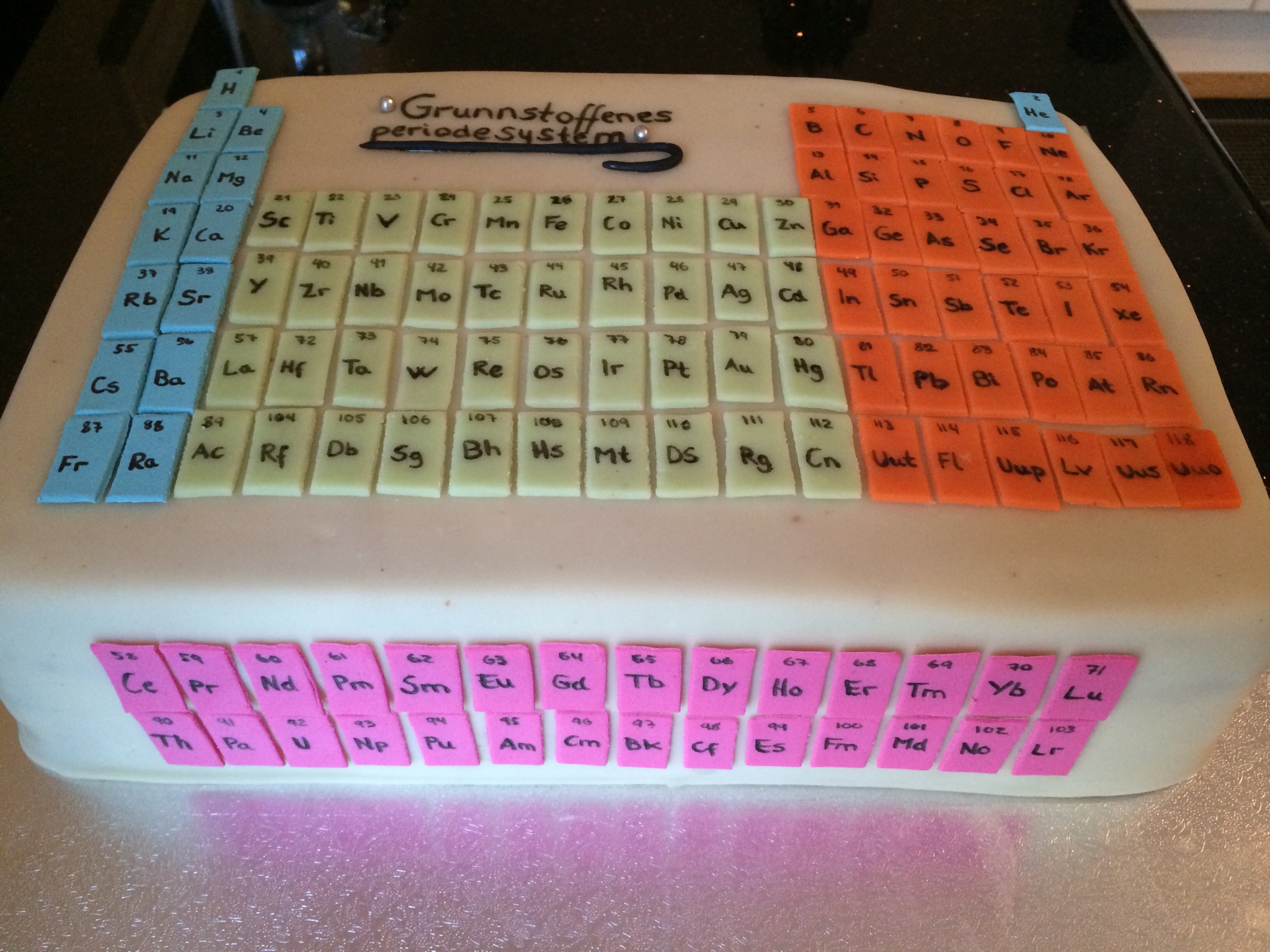 Ok, dette er en kake for spesielt interesserte. I dag har jeg bakt til min lillesøster og hennes studiekamerater, som hun har invitert på kakefest i morgen. Siden de studerer realfag ble vi enig om at et tema som reflekterte dette kunne være kult. Etter å ha forkastet en del idéer om molekyler, bucky balls (?) og litt diverse jeg ikke aner hva betyr, landet vi på noe ganske elementært (haha): det periodiske system.