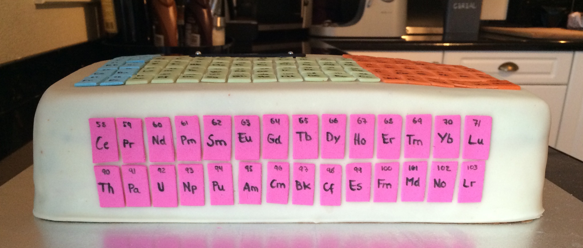 Tilbake til dagens kake. Denne er ganske enkelt dekorert med periodesystemet. Altså 118 små marsipanfirkanter som jeg har skrevet med spiselig tusj på. Også teksten øverst er skrevet med spiselig tusj. Jeg kjente det kriblet litt i fingrene etter å hive på sommerfugler, skimmer og blomster, men nøyde meg med to Ag-perler *smart-poeng*. Det enkleste er ofte det beste, og ryddigheten i denne kaken appellerer til meg. Her er noen bilder: