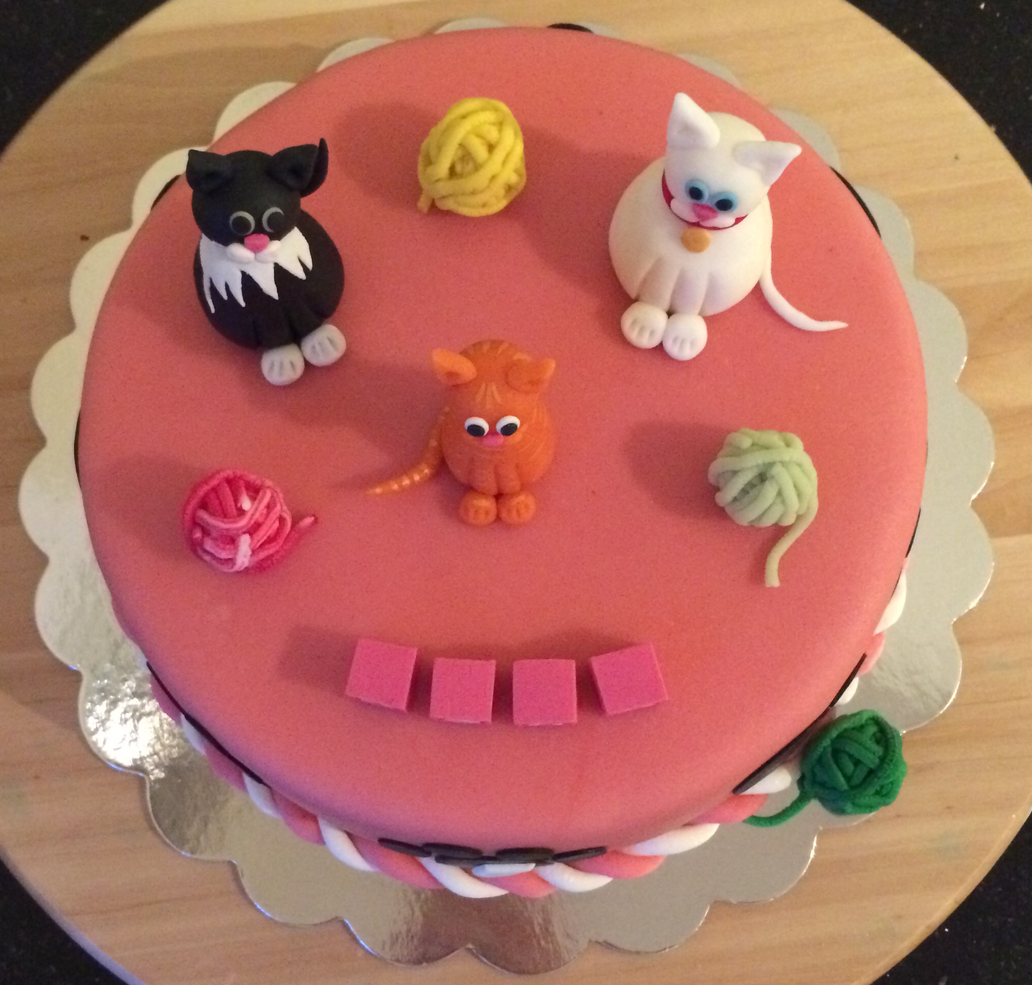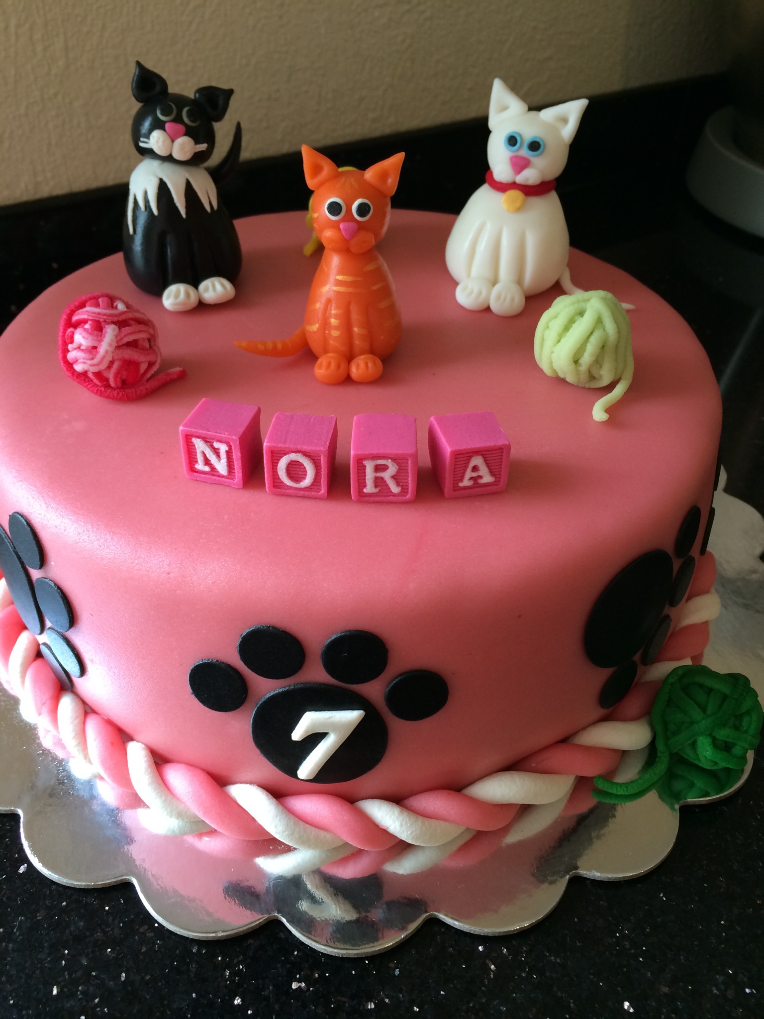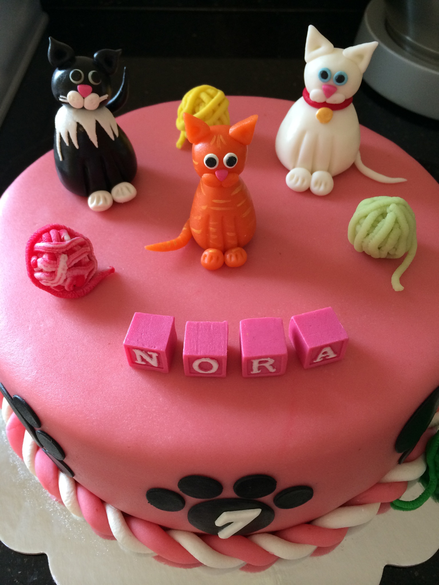 Når jeg fikk vite at temaet skulle være katter fikk jeg umiddelbart en tanke hodet om fotspor rundt kaken, modellerte kattefigurer og garnnøster. Og som tenkt så gjort, her er kaken til Noras syvårsdag: