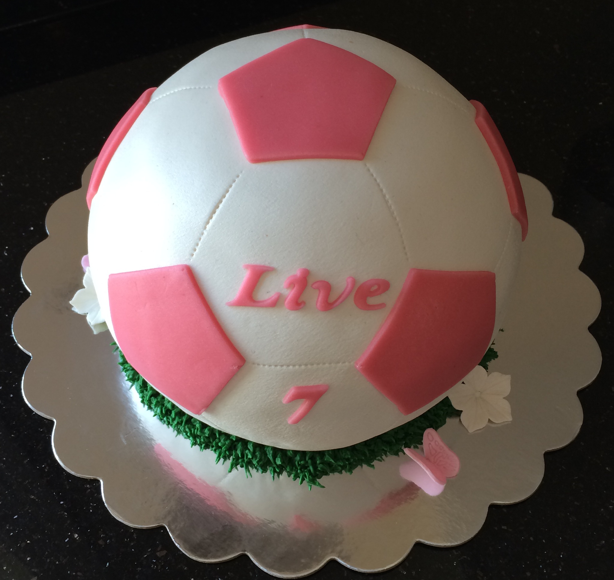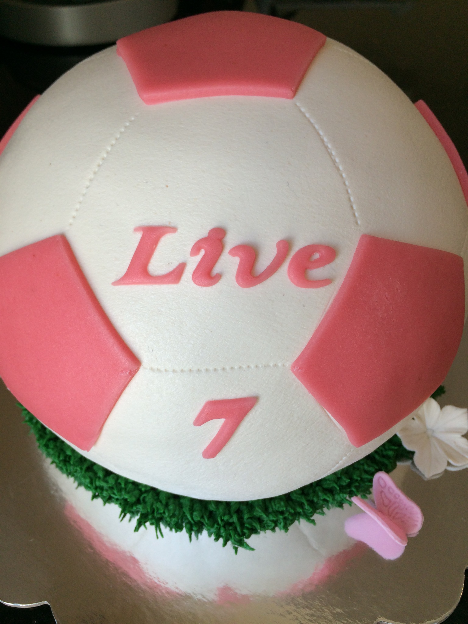 Fotballen er laget av sjokoladekake med sjokoladesmørkrem, trukket og pyntet med marsipan. For å få den runde formen har jeg stekt bunnene i runde stålboller, også skåret til litt ekstra for å få den akkurat som jeg ville ha dem. Har brukt en femkantet utstikker for å lage de rosa rutene, og bursdagsbarnets navn og alder måtte selvsagt være med. Gresset rundt fotballen er grønnfarget smørkrem, og siden kaken skulle være litt jentete har jeg tatt med et par blomster og en sommerfugl.