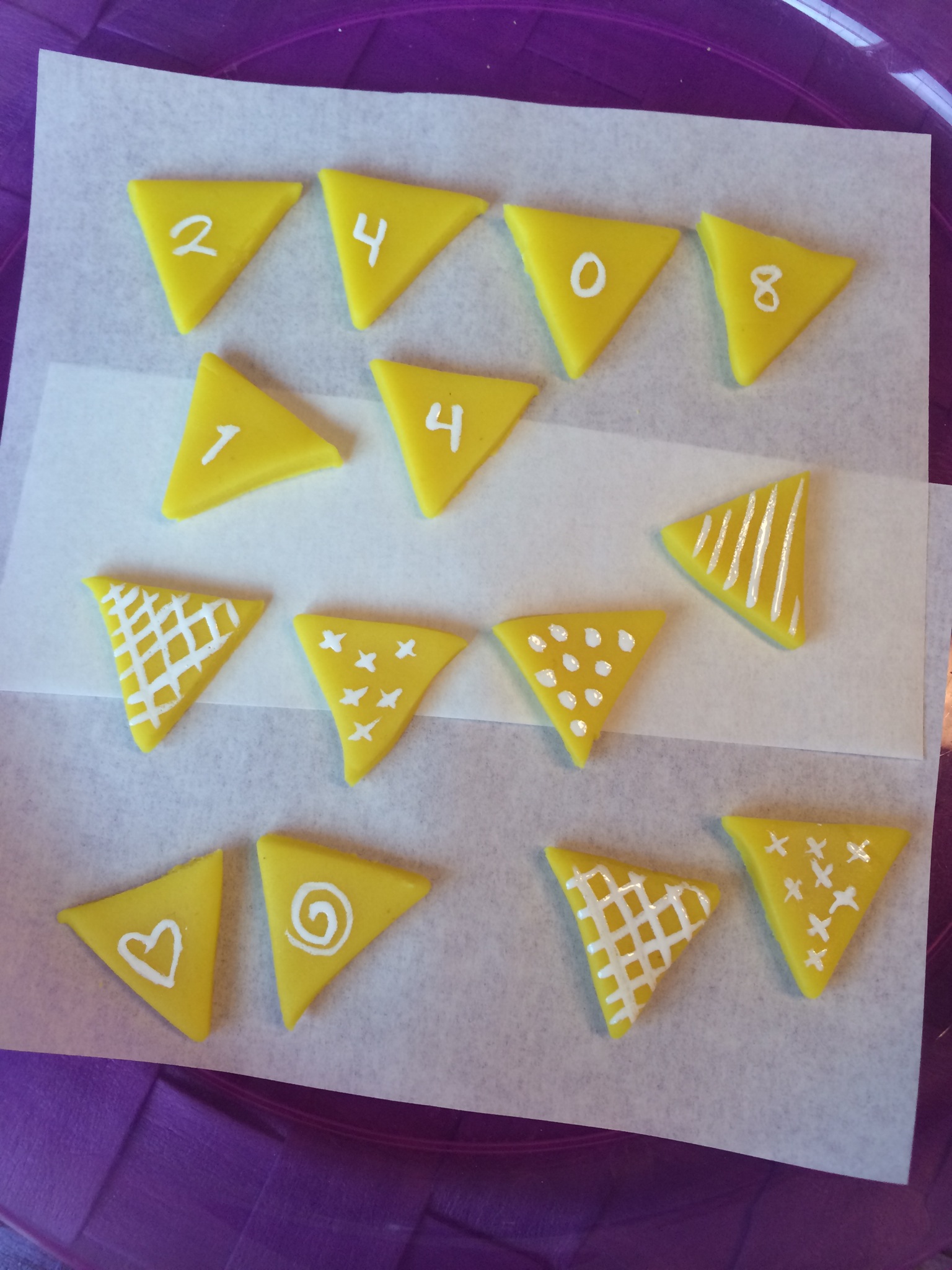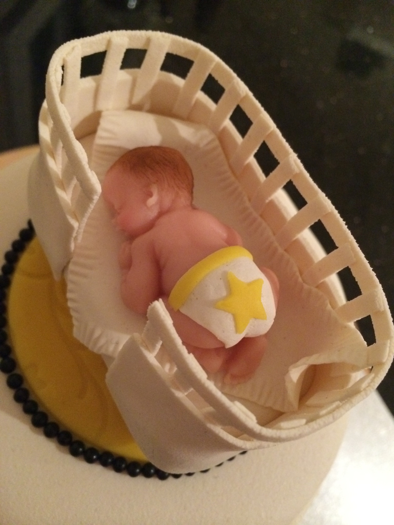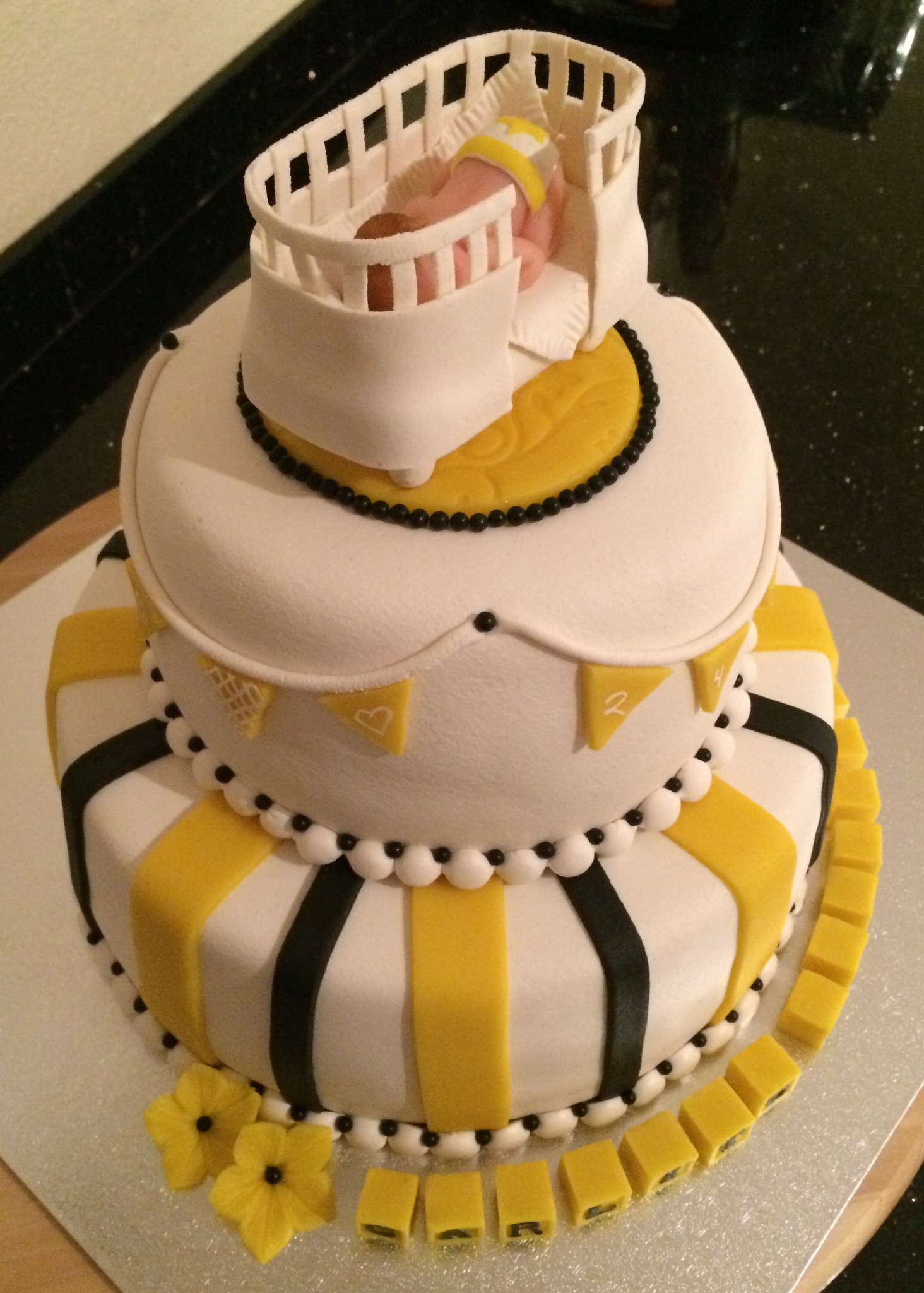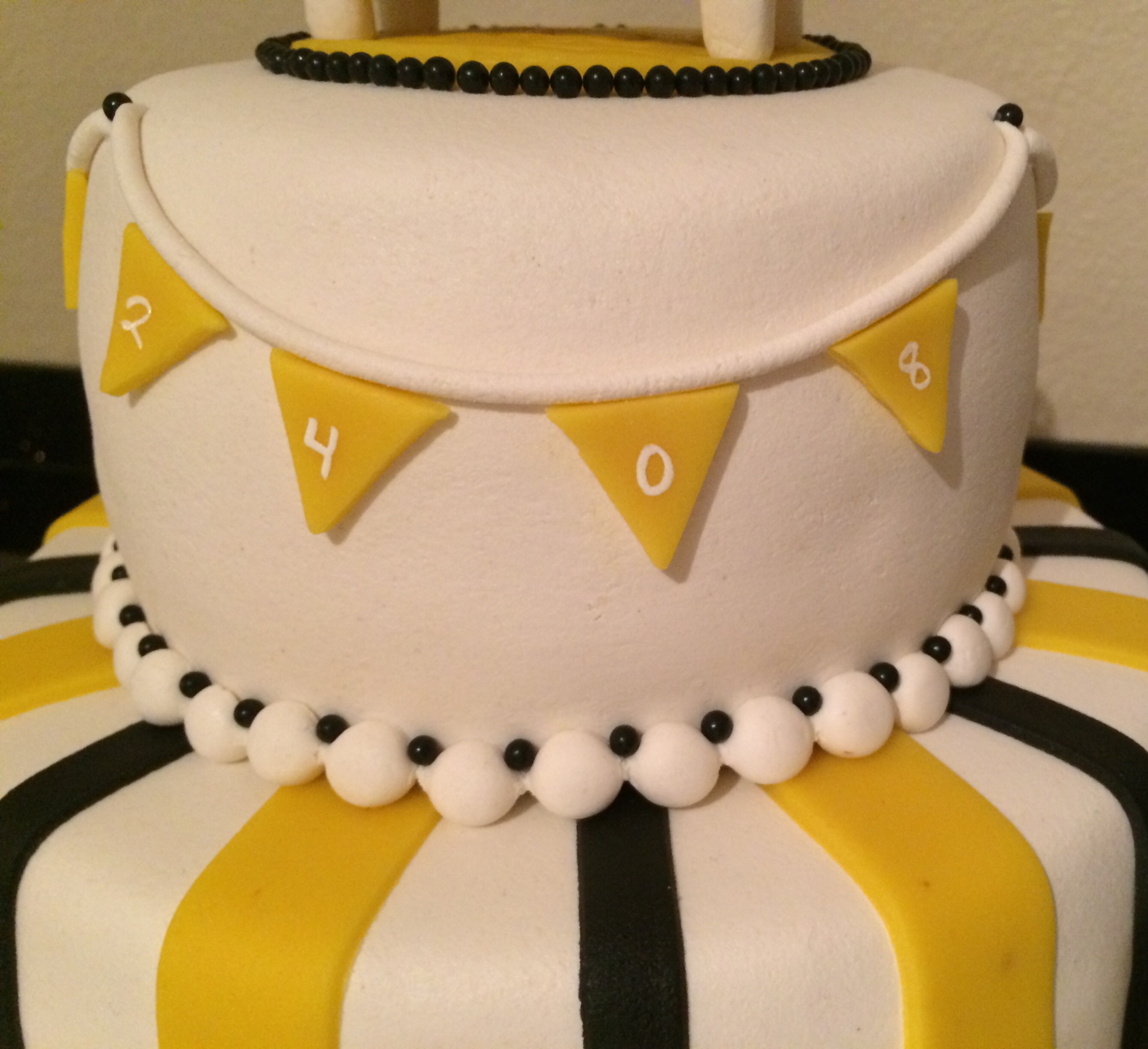 Resten av pynten har jeg primært laget i gult, brukt svarte perler både rundt kantene og langs «teppet» på toppen, bokstavklossene med navn er markert ekstra med svart, spiselig maling, og på de gule vimplene har jeg malt datoen for navnefesten og ellers bare små detaljer i hvitt. På den nederste etasjen har jeg laget striper i ulik bredde i svart og gult. Alt i alt ble jeg veldig fornøyd med kaken, og det var skikkelig artig å se den ta form på kjøkkenbenken i går kveld. Her kommer et lite bildedryss: