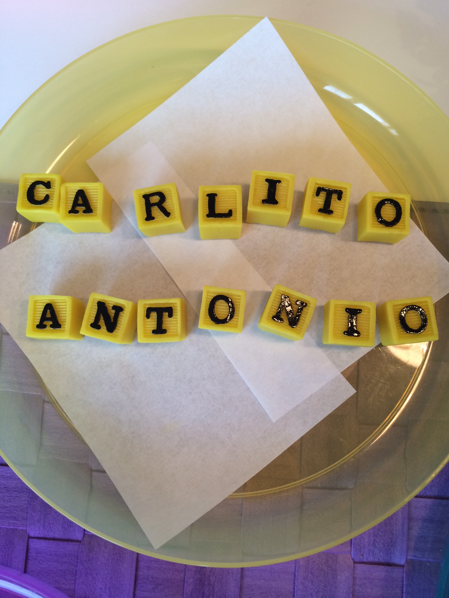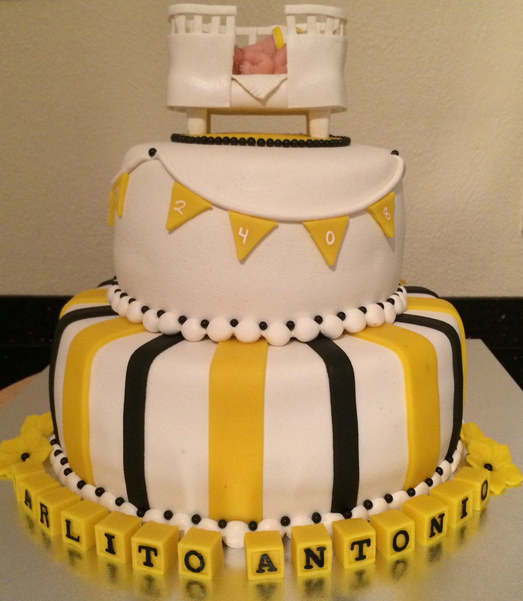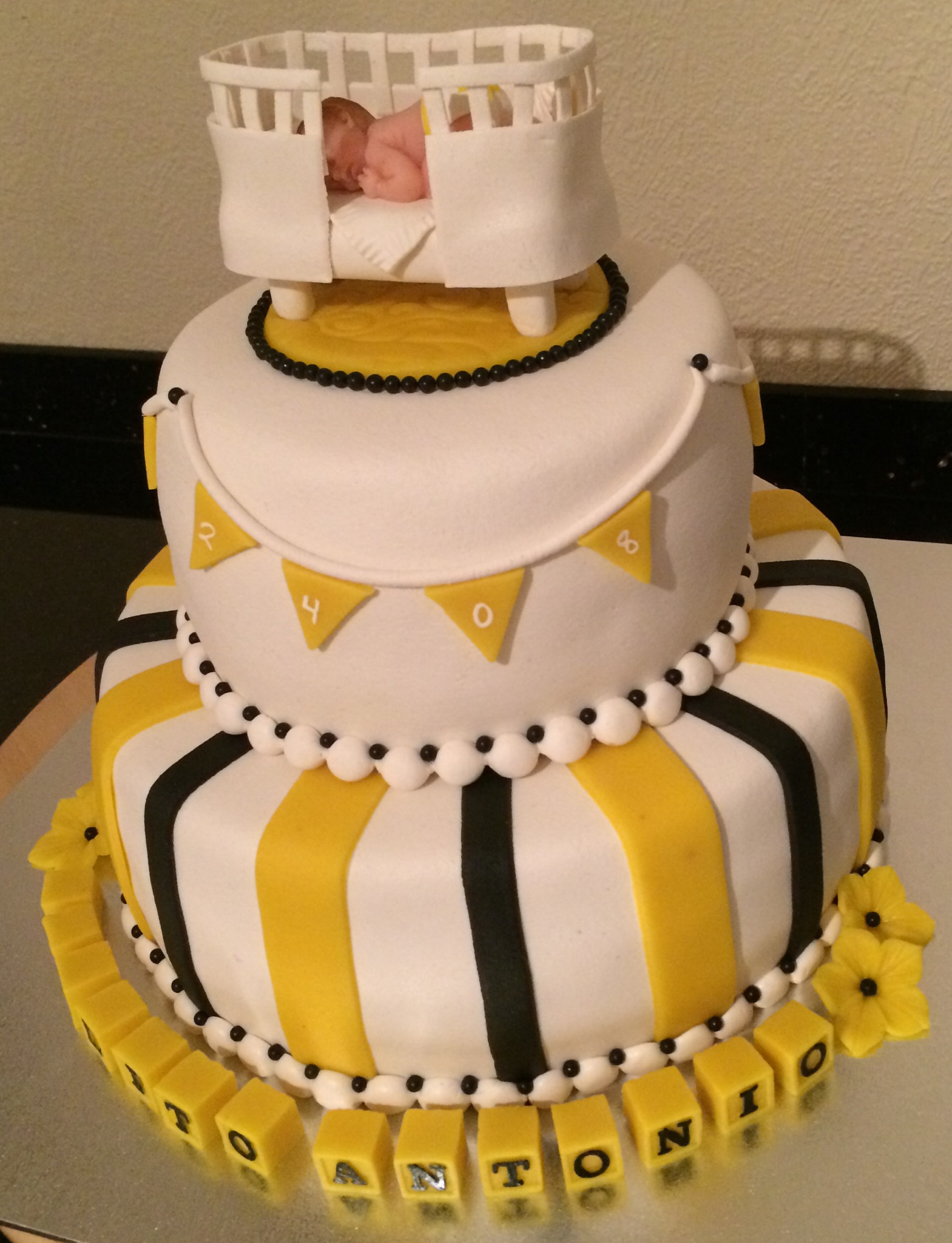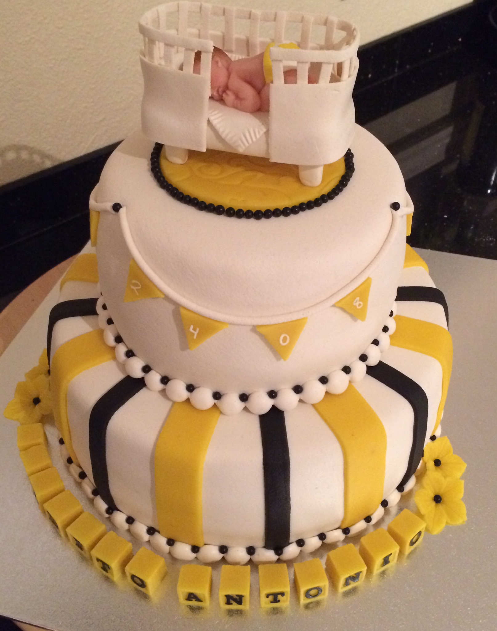 Dagens kake var noe utenom det vanlige. Først var planen en babyblå nusselig kake, men så fikk jeg melding fra mammaen til Carlito Antonio for et par uker siden om det var mulig å lage kaken i gult og svart i stedet, for å matche dekoren i lokalet. Og klart jeg kunne gjøre det. Det er alltid spennende å prøve noe nytt 🙂