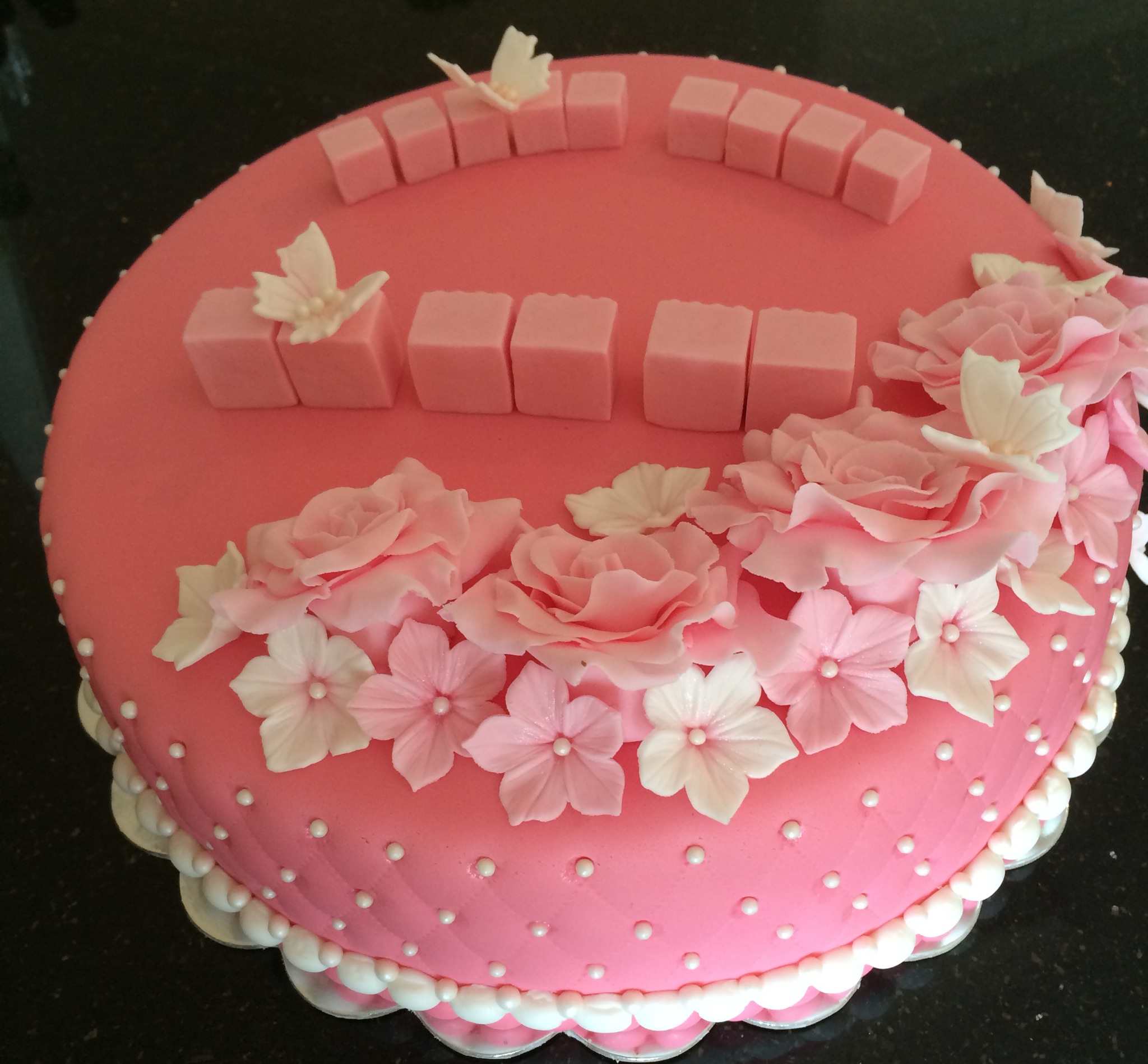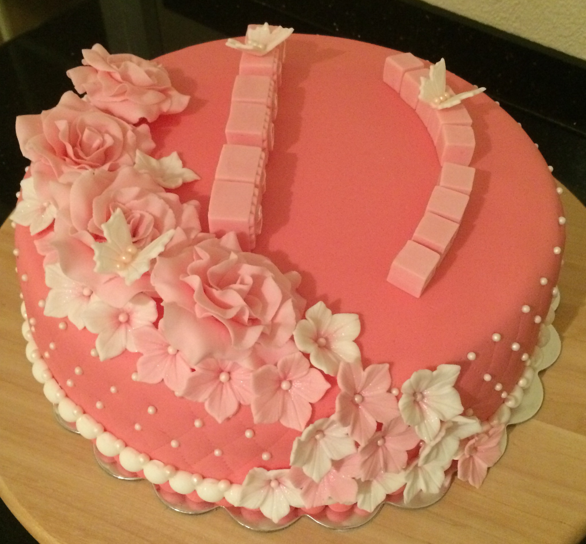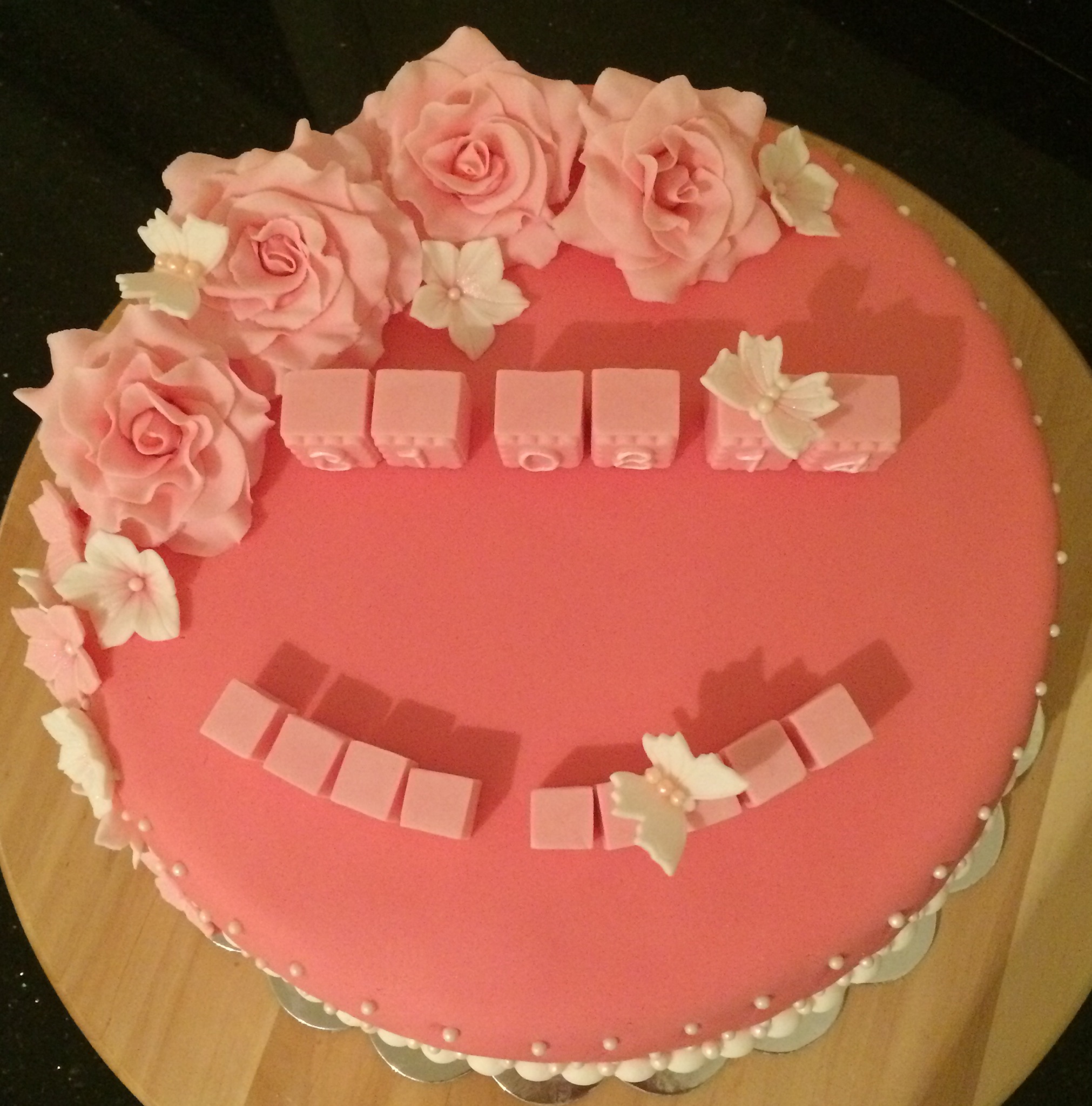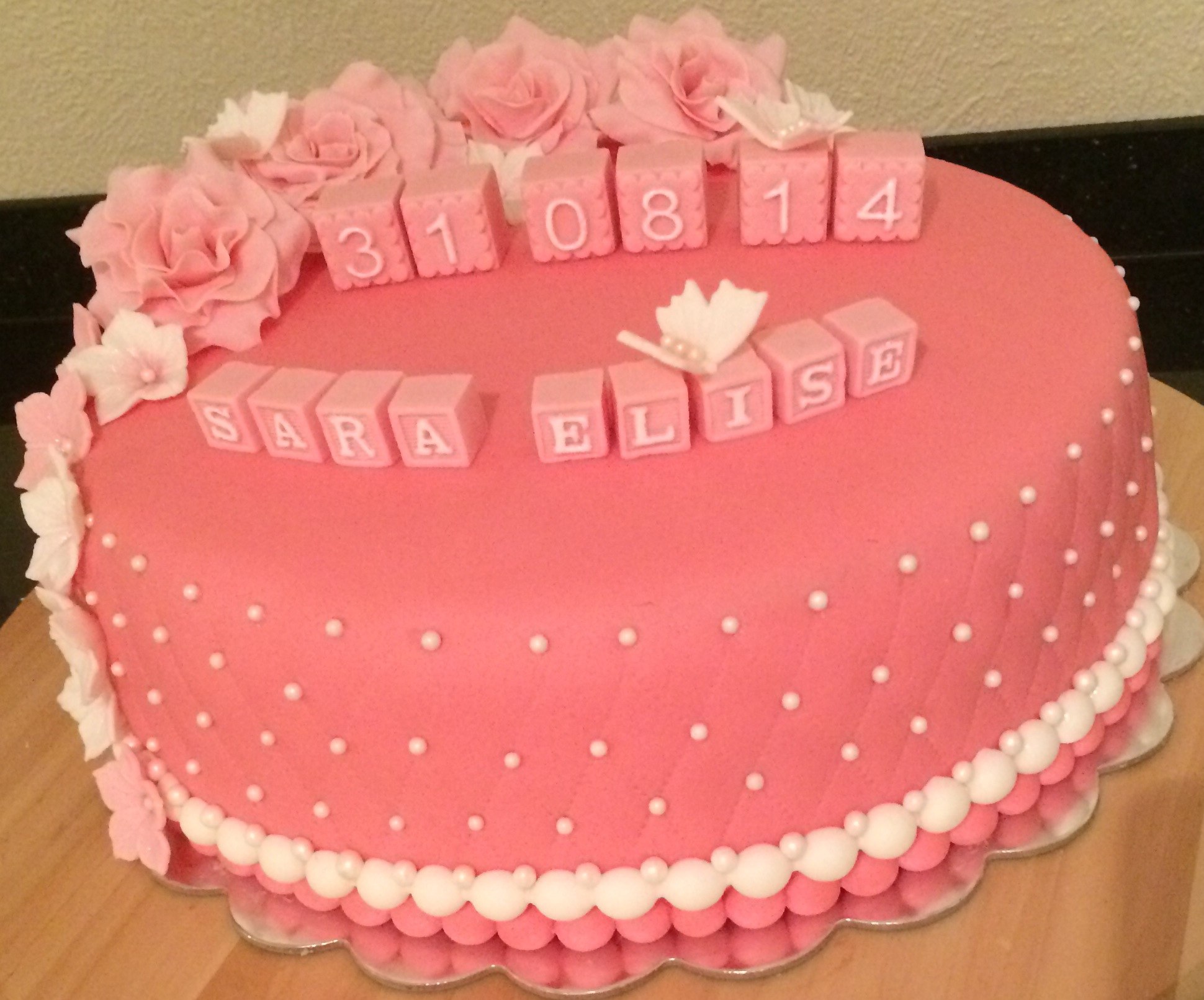 Utseendemessig er dette en skikkelig jentete og søt kake. Medium rosa farge på trekket, tett rutemønster med perler rundt kanten, to perlerader nederst ved brettet, lyserosa roser, og lyserosa og hvite småblomster innimellom. Navnet og dåpsdatoen er klosser i ulik utforming. Her kommer noen bilder: