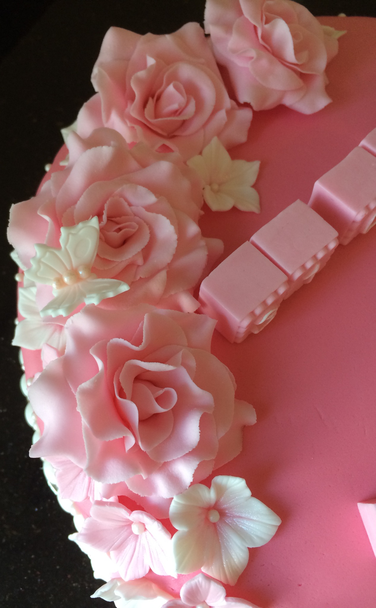 Helgens første dåpskake var en skikkelig rosa jentekake med masse roser og småblomster til pynt. Mammaen til Sara Elise ønsket seg en kake med rosa trekk av sukkerpasta, og hun ville ikke ha sjokoladekake.