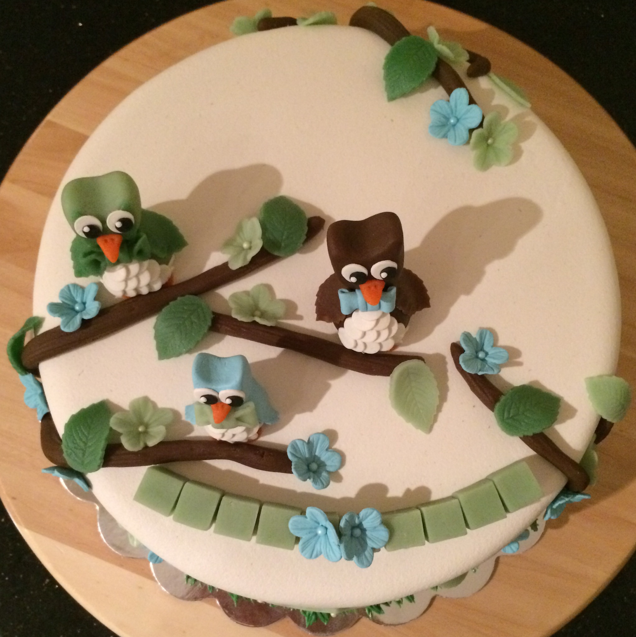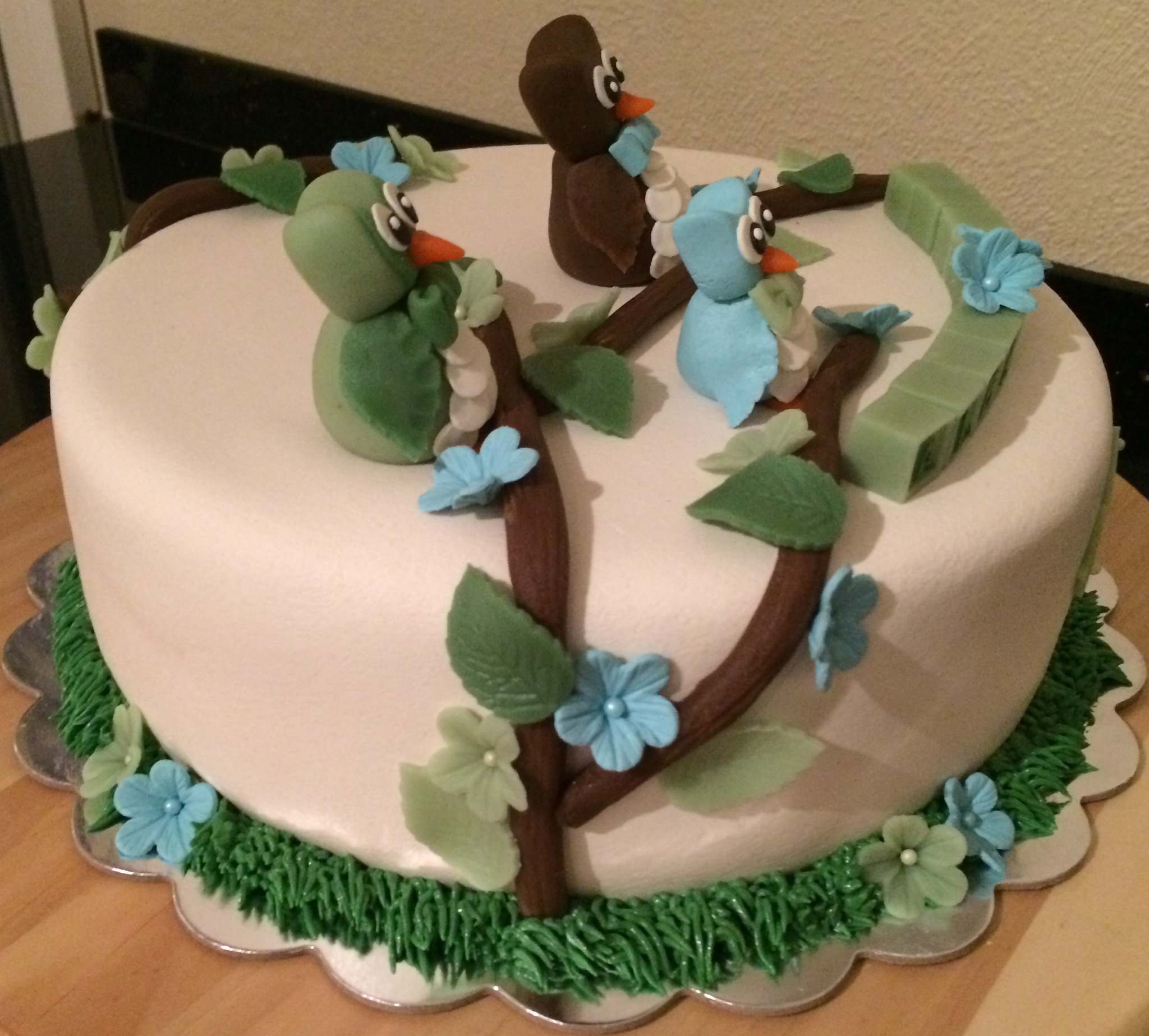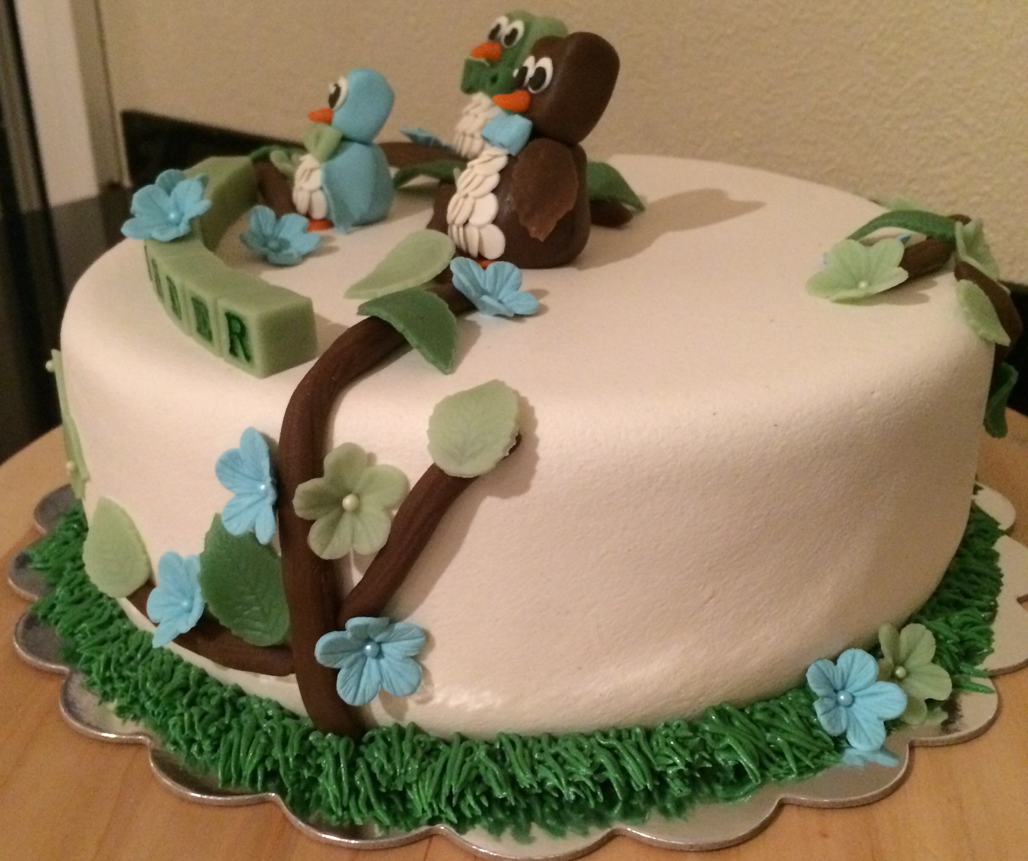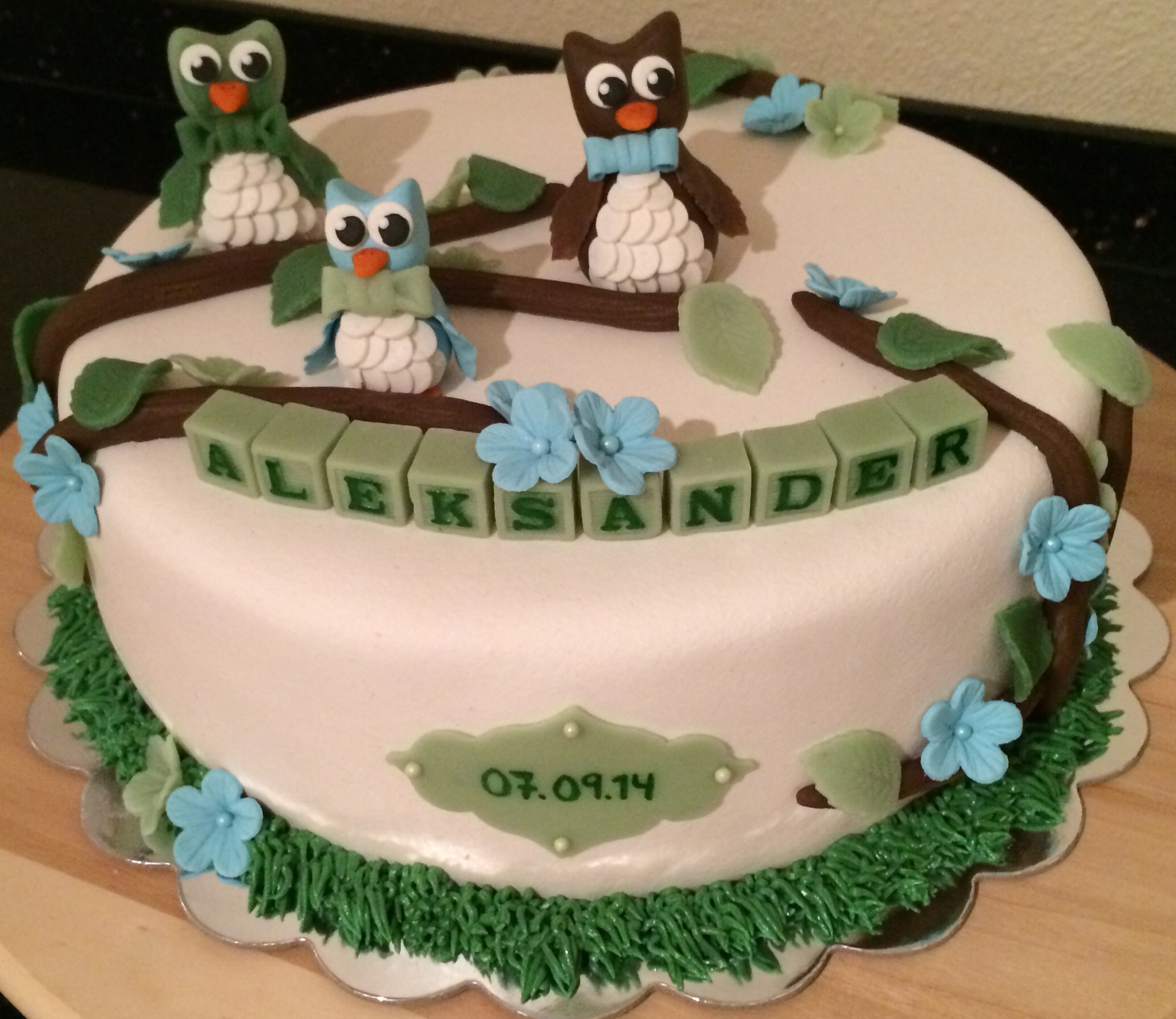 Når det gjelder design har jeg brukt hvitt trekk som grunnlag, laget noen trær og grener med blader og blomster oppover siden av kaken, litt gress nede på brettet, navneklosser og et skilt med datoen for navnefesten. Og ikke minst en liten uglefamilie 🙂 Fargene er det mammaen til Aleksander som har valgt, og jeg synes de ble veldig fine sammen. Jeg har ikke laget ugler før, så jeg fant et bilde på nett jeg kunne jobbe ut fra, inspirasjonen ble La Torta, som lager kjempesøte uglefigurer 🙂