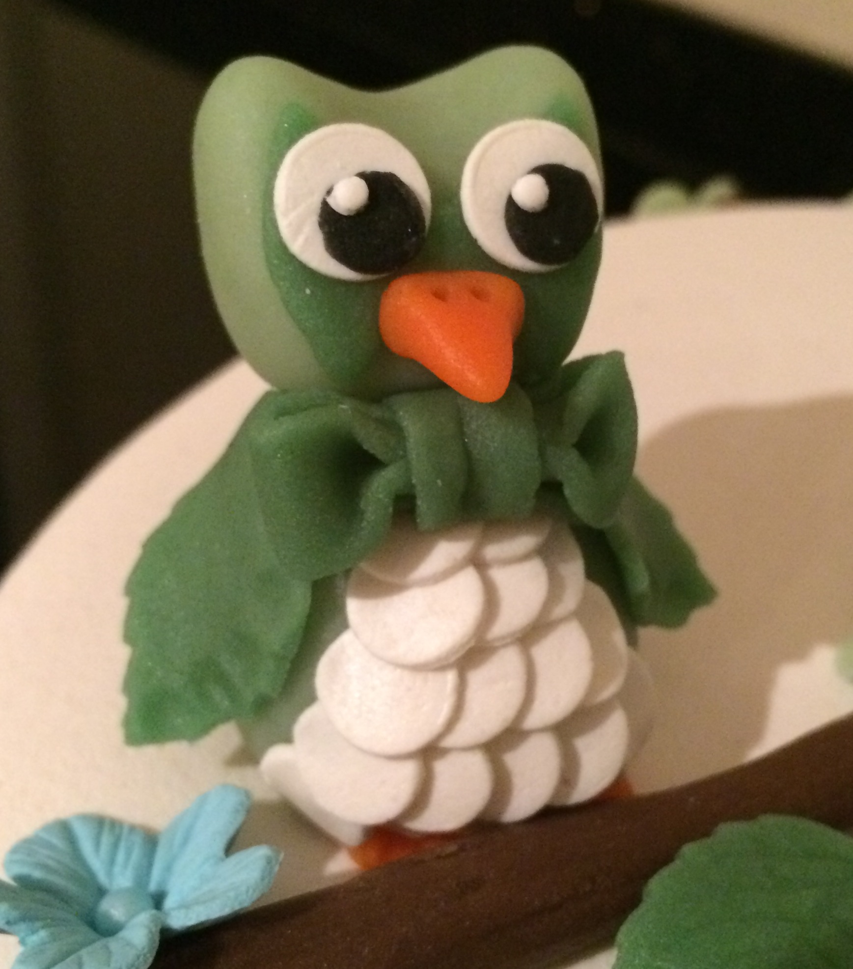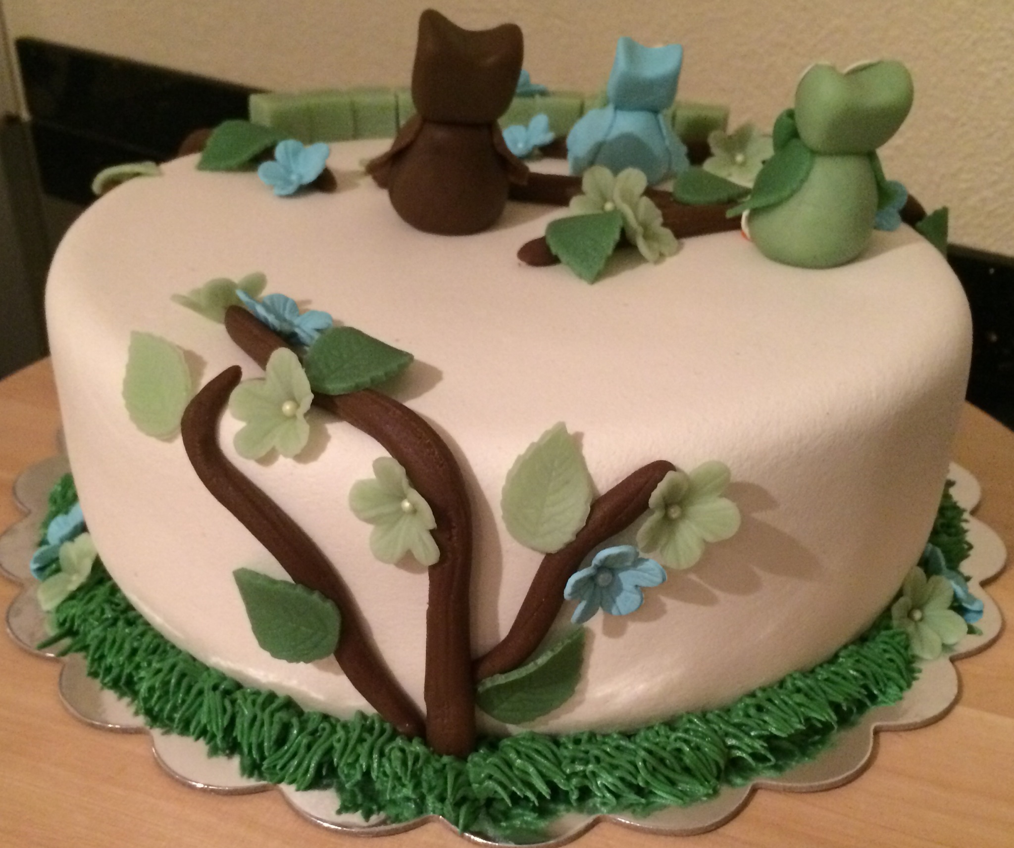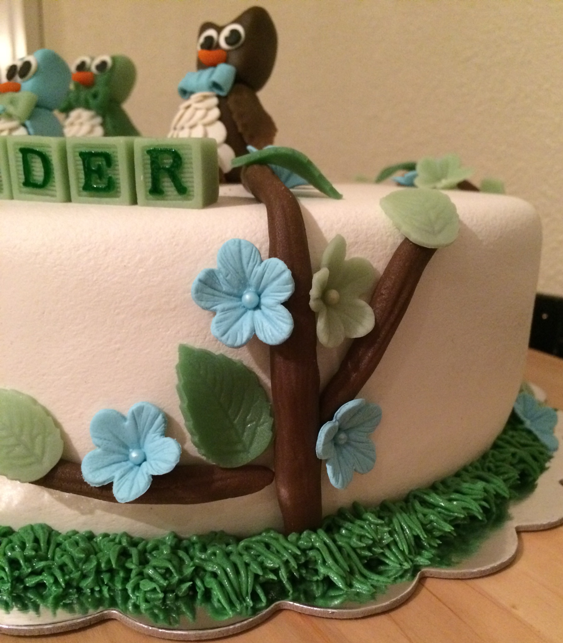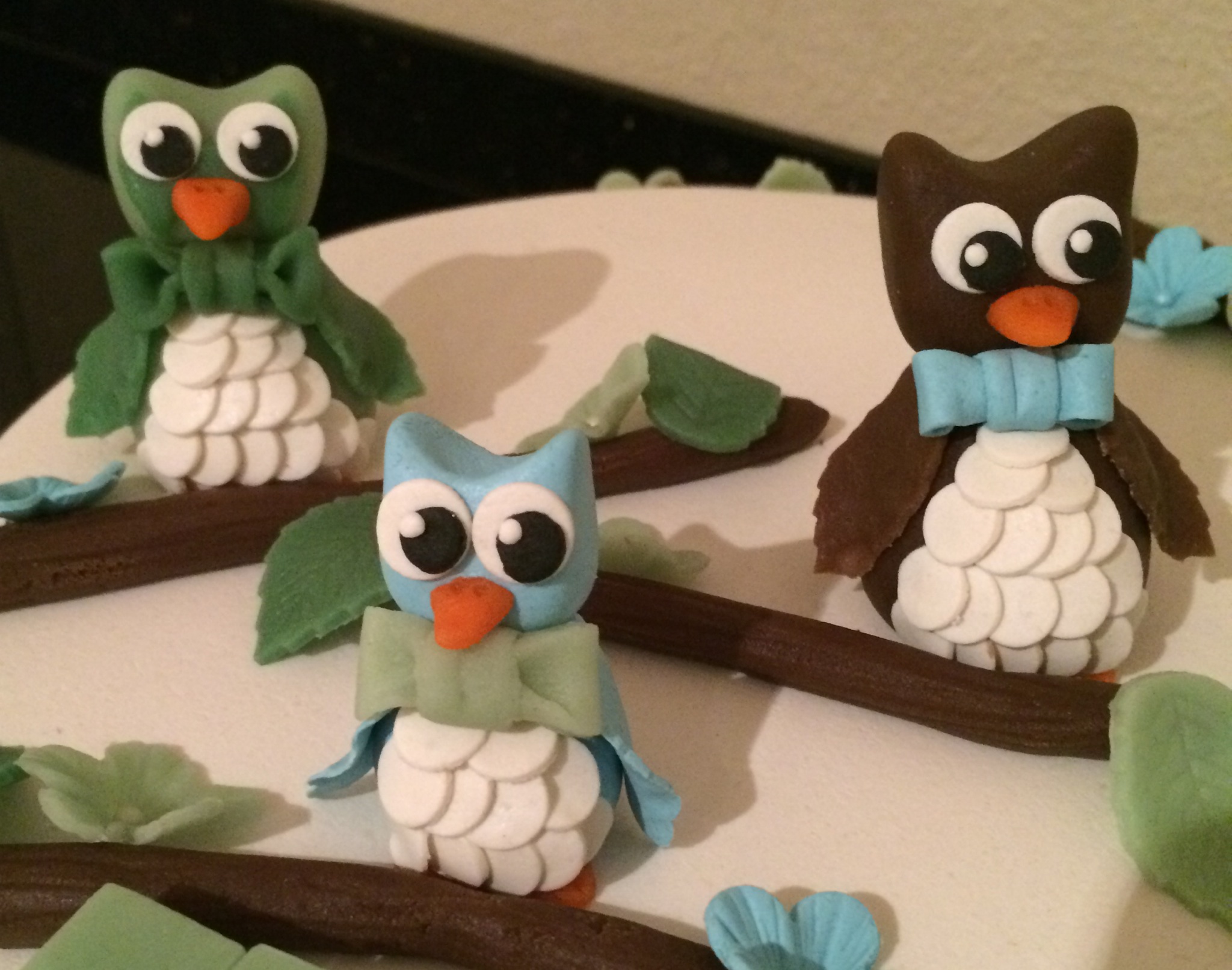 Når det gjelder design har jeg brukt hvitt trekk som grunnlag, laget noen trær og grener med blader og blomster oppover siden av kaken, litt gress nede på brettet, navneklosser og et skilt med datoen for navnefesten. Og ikke minst en liten uglefamilie 🙂 Fargene er det mammaen til Aleksander som har valgt, og jeg synes de ble veldig fine sammen. Jeg har ikke laget ugler før, så jeg fant et bilde på nett jeg kunne jobbe ut fra, inspirasjonen ble La Torta, som lager kjempesøte uglefigurer 🙂