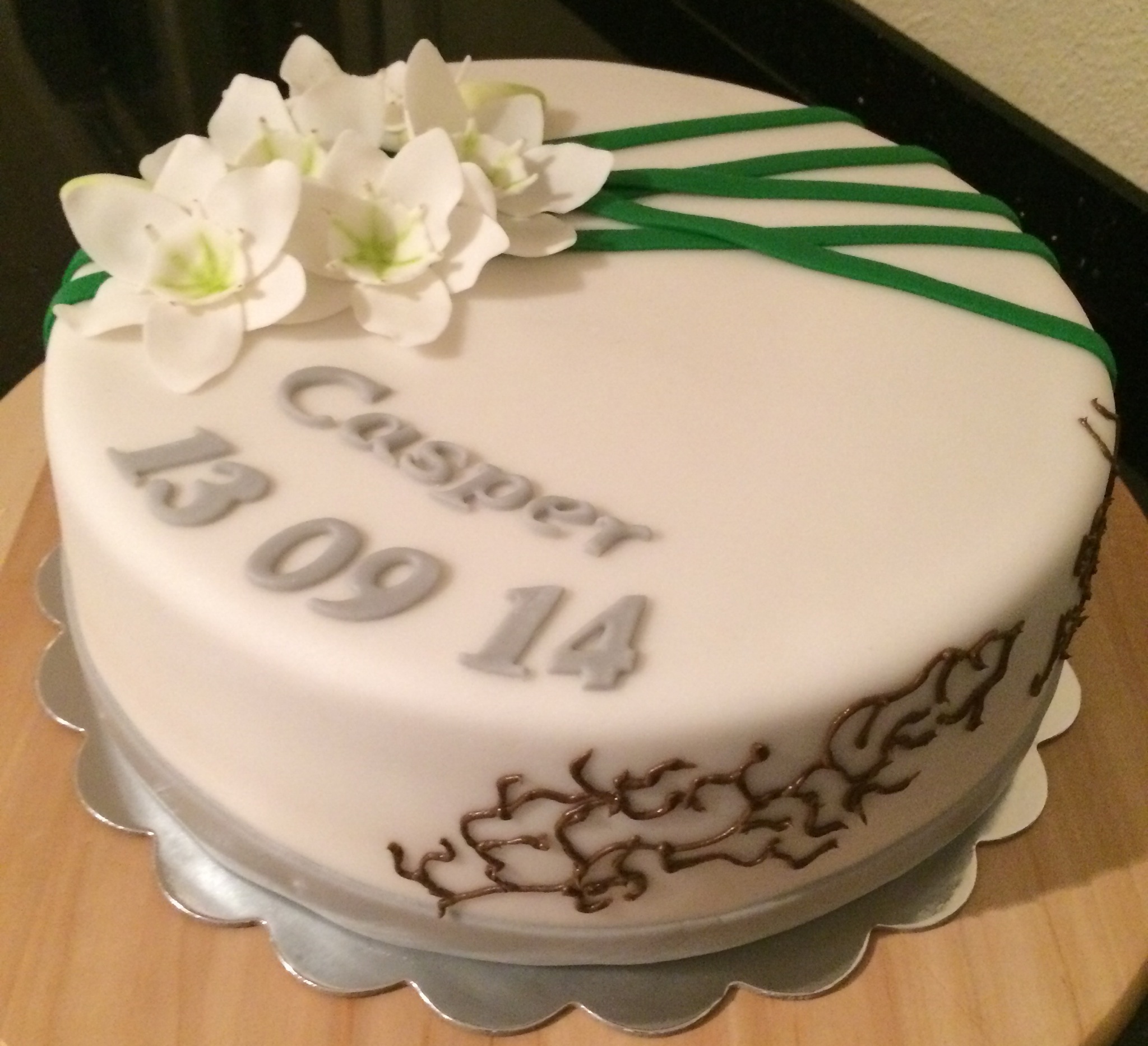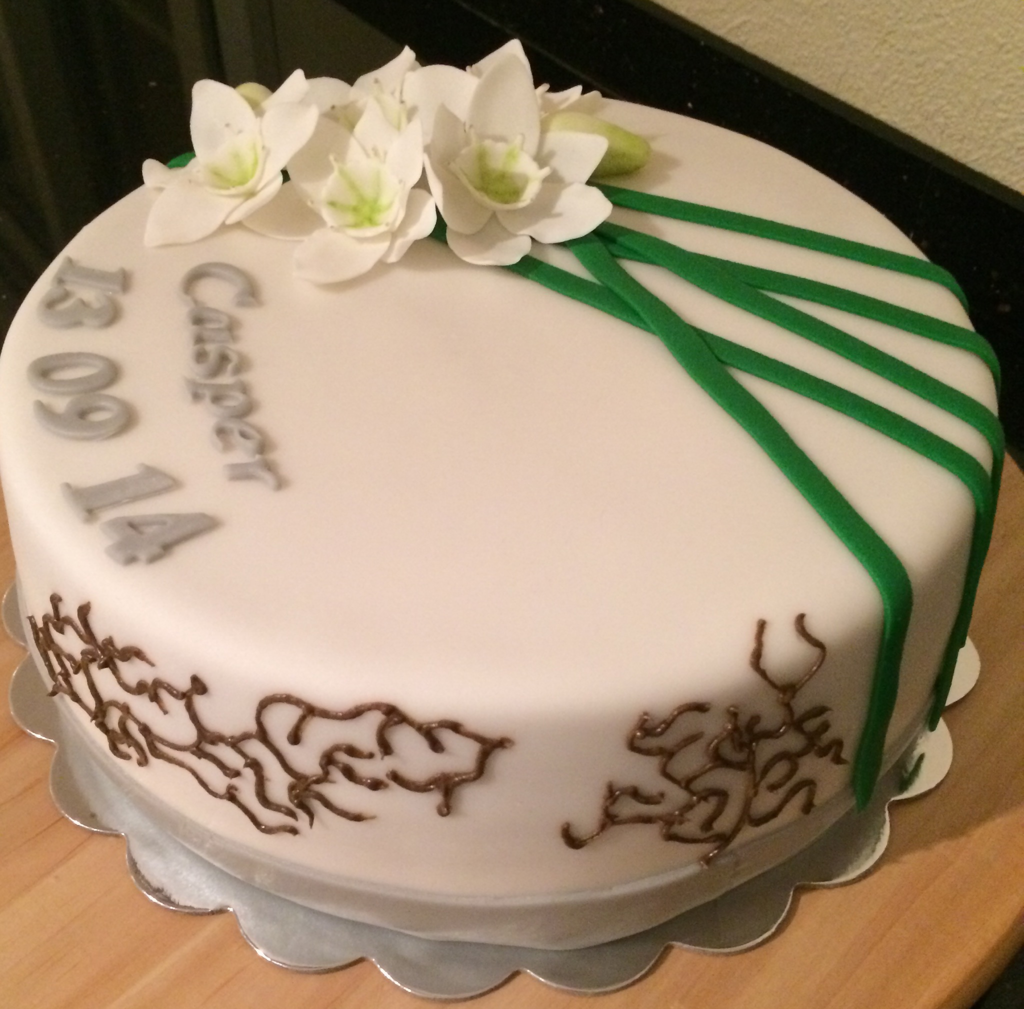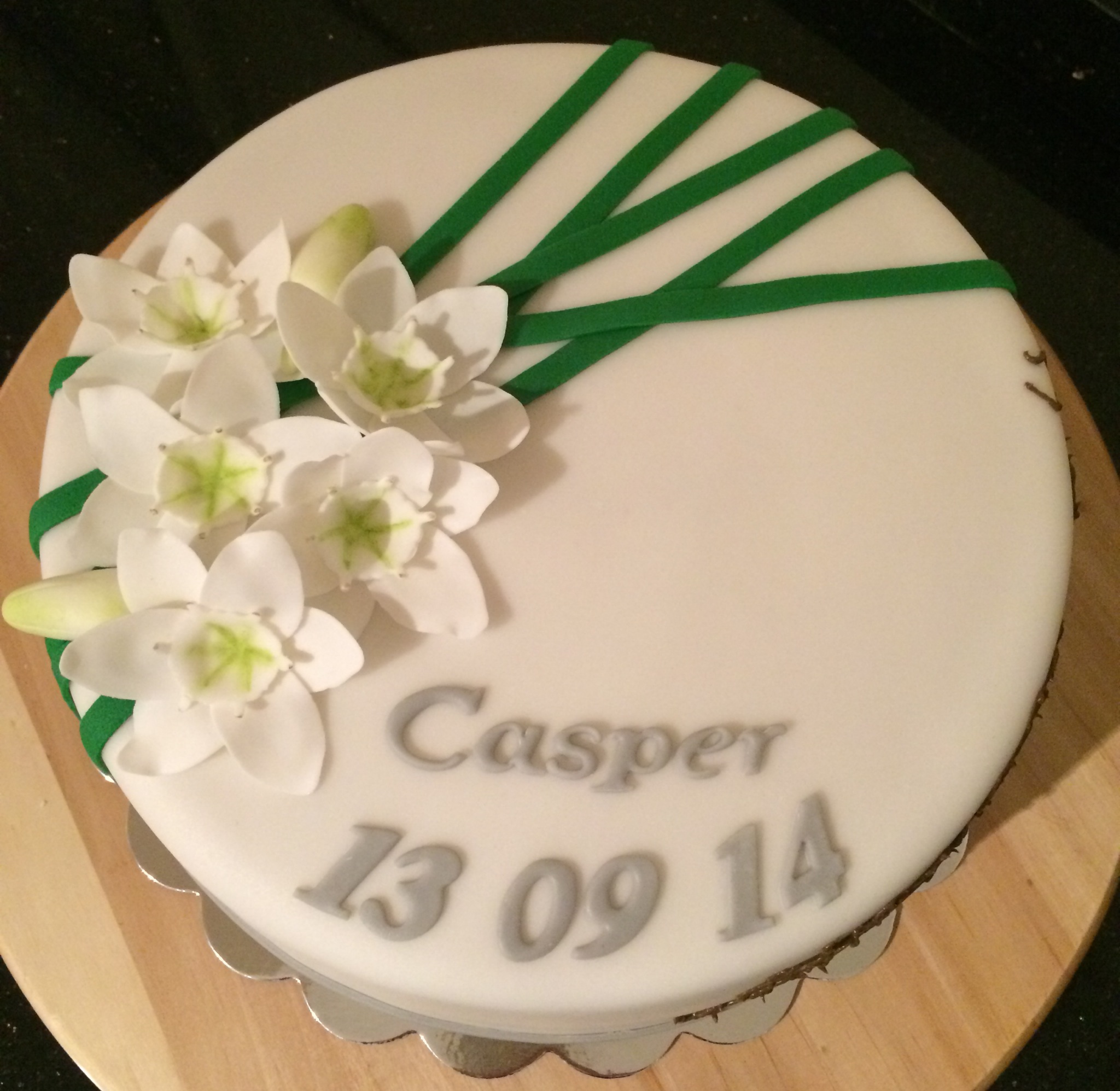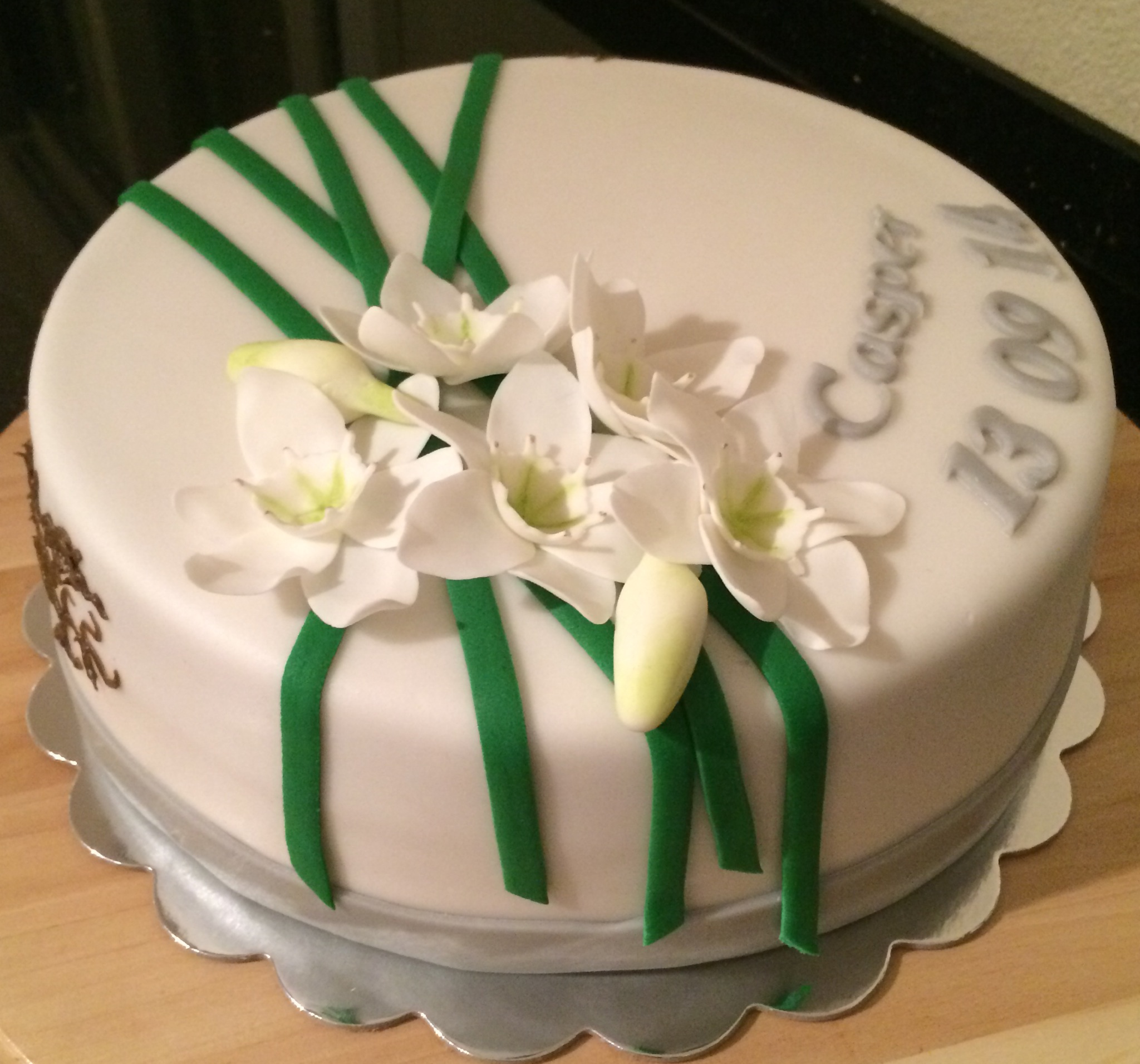 Dekoren her er ganske enkel og stilren, et lysegrått bånd nederst rundt kaken siden dette er en av fargene de skulle pynte med i dag, navn og dato i samme farge. Jeg har laget noen lange «strå» som jeg har dandert over den ene siden av kaken og oppå disse har jeg plassert eucharis-blomstene (laget av sukkerpasta og dustet og malt med limefarget pulverfarge) og et par knopper. Trollhasselen er tegnet på siden av kaken med en tynn sprøyetipp. Her kommer noen bilder: