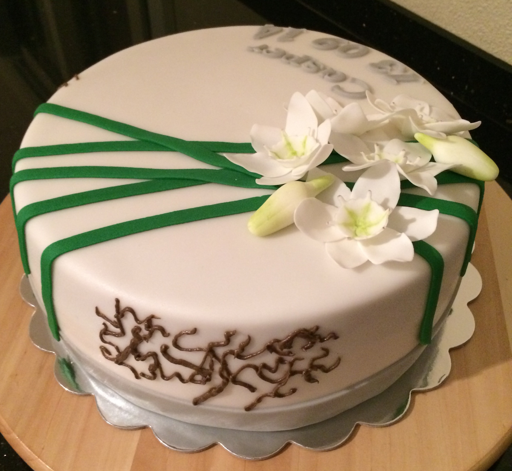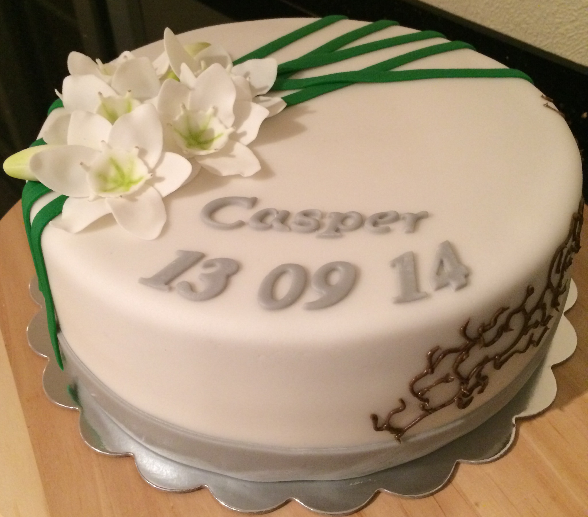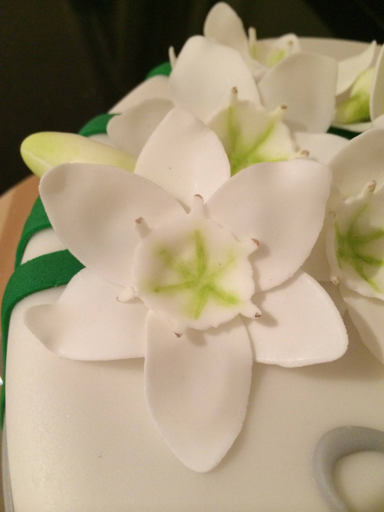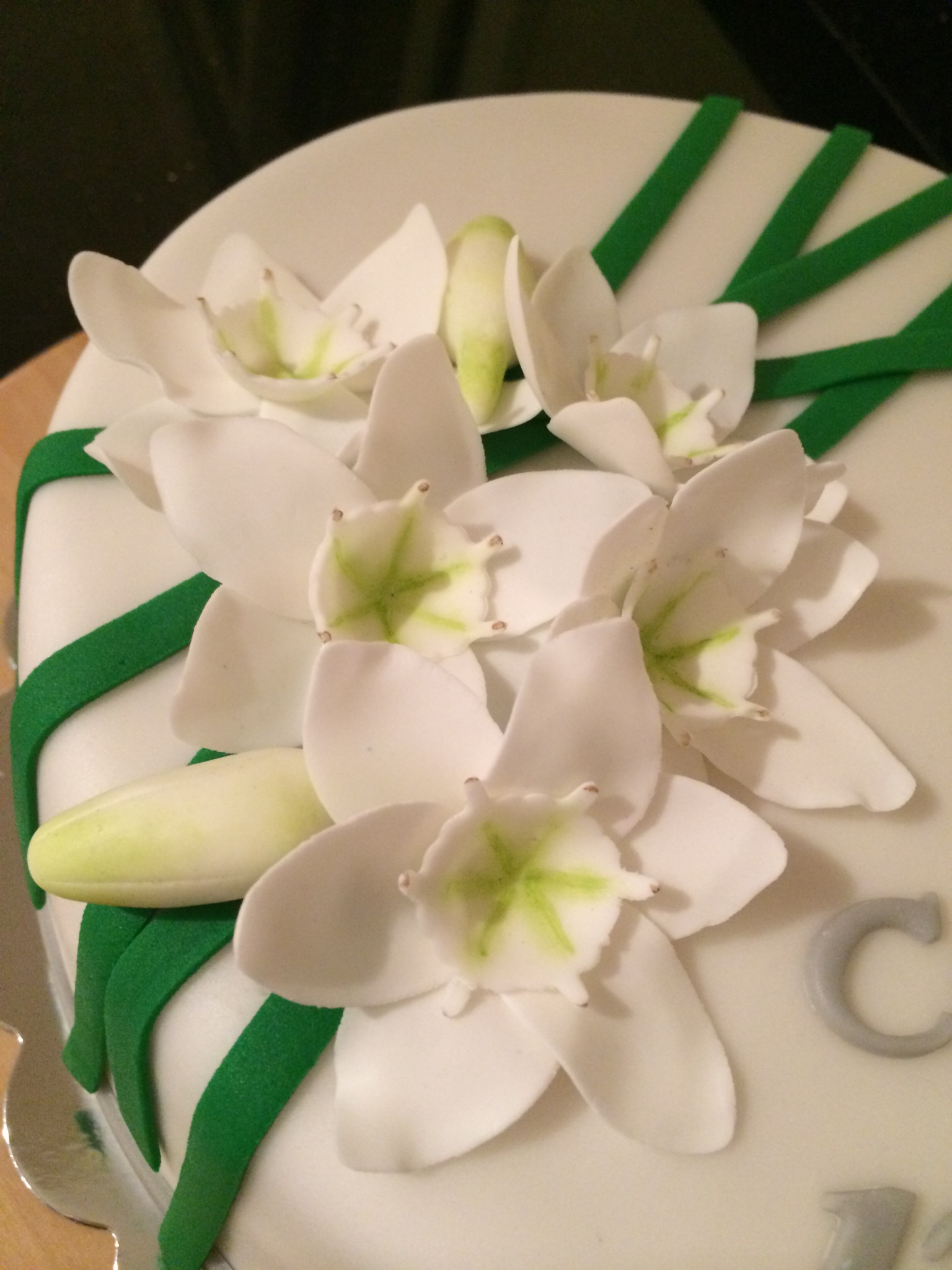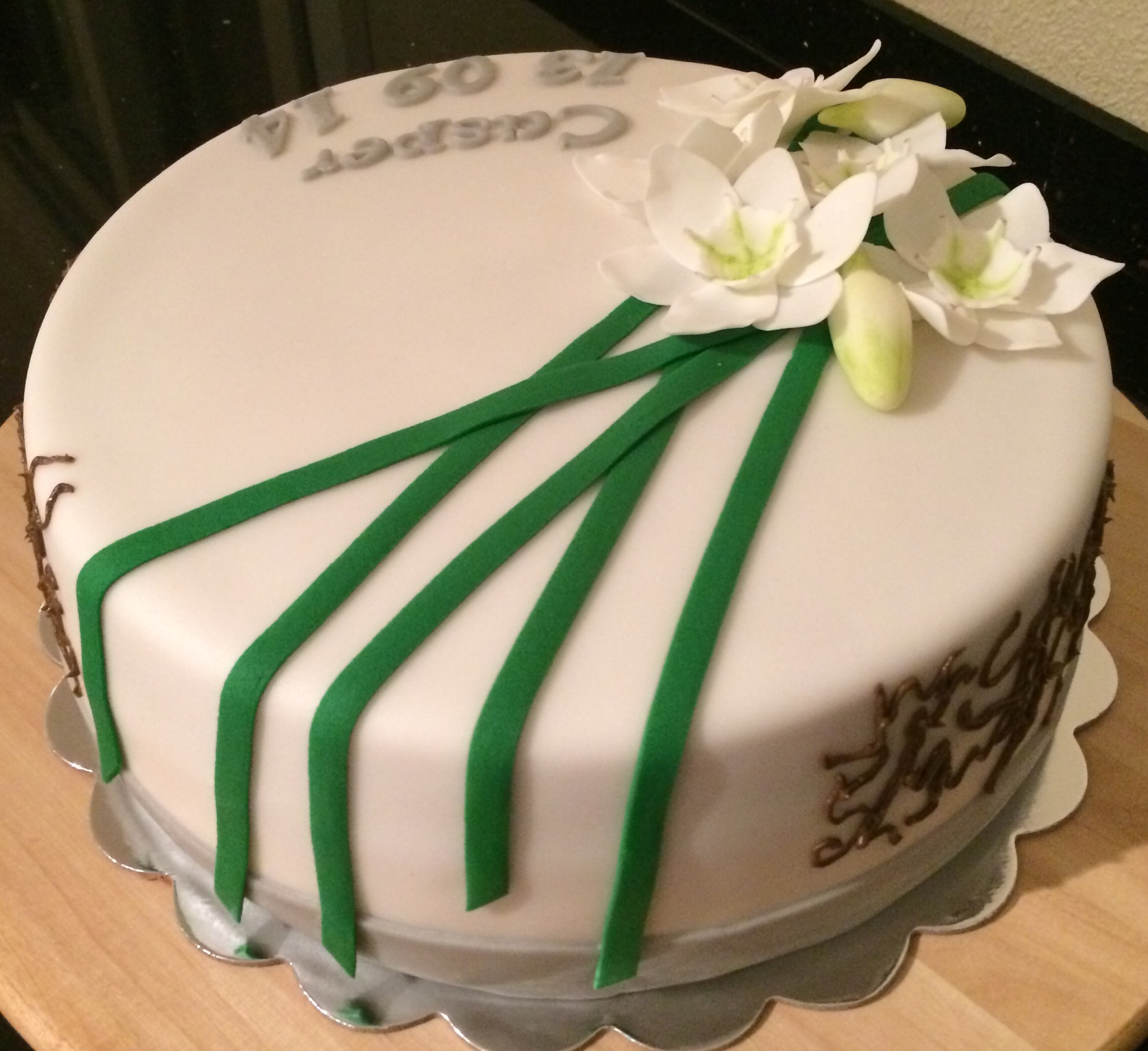 Dekoren her er ganske enkel og stilren, et lysegrått bånd nederst rundt kaken siden dette er en av fargene de skulle pynte med i dag, navn og dato i samme farge. Jeg har laget noen lange «strå» som jeg har dandert over den ene siden av kaken og oppå disse har jeg plassert eucharis-blomstene (laget av sukkerpasta og dustet og malt med limefarget pulverfarge) og et par knopper. Trollhasselen er tegnet på siden av kaken med en tynn sprøyetipp. Her kommer noen bilder: