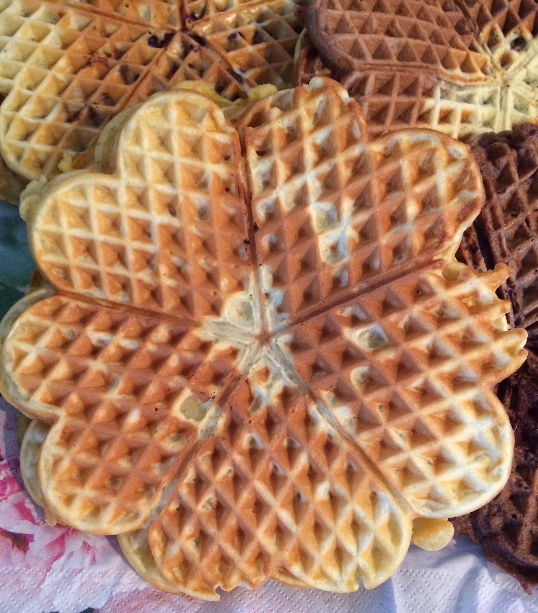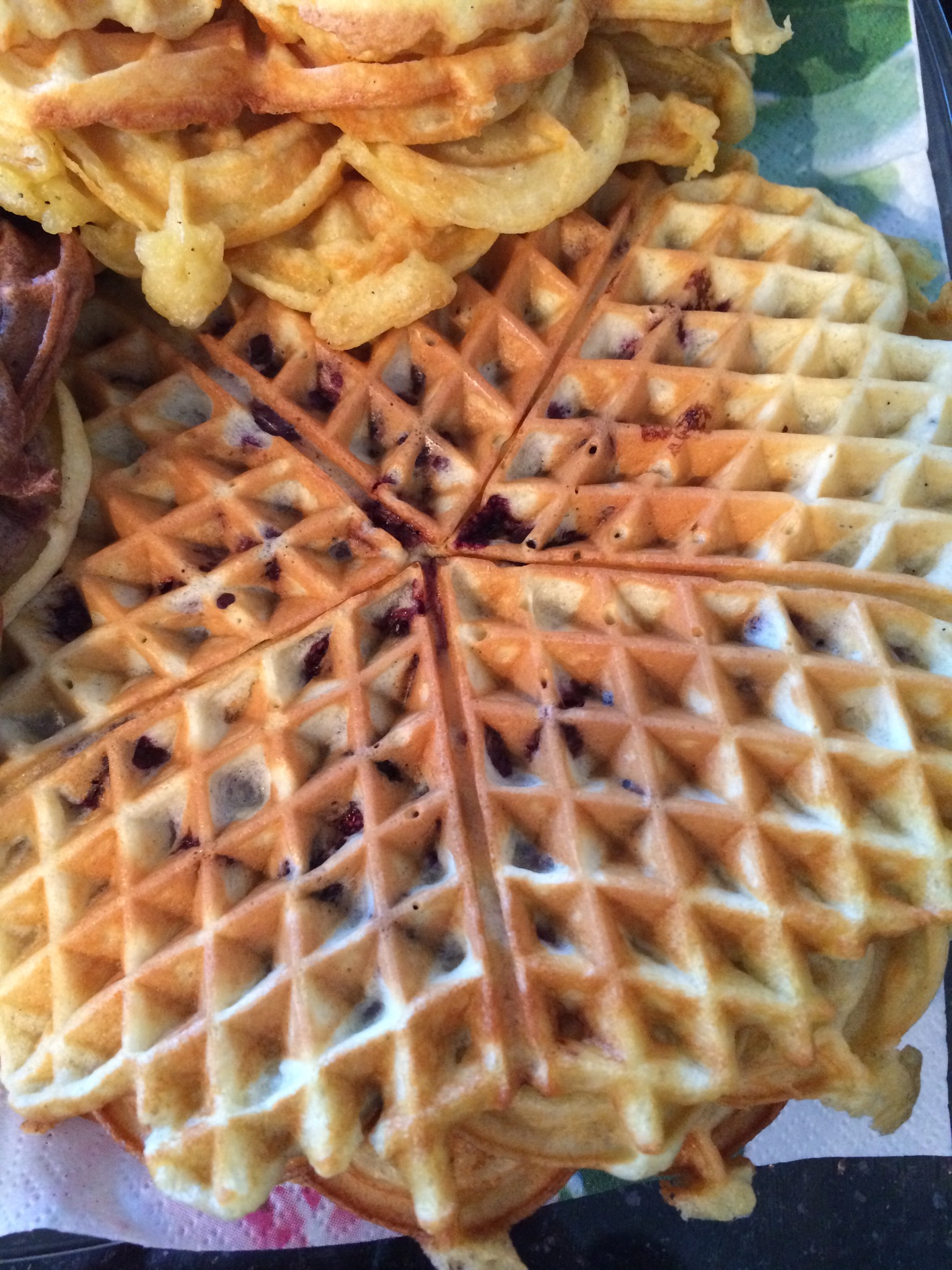 Rør sammen det tørre, tilsett melken gradvis og rør nøye for å bli kvitt klumper. Tilsett eggene (visp dem gjerne sammen på forhånd), og ha i det smeltede smøret til slutt. La svelle i 20-30 minutter. Røren tåler også godt å stå i kjøleskapet om man vil lage den god tid i forveien, eller har røre til overs. OBS! Dette blir en stor porsjon (ca 22 vafler fikk vi, men dette er avhengig av vaffeljernets størrelse), kan med fordel halveres om dere ikke er mange. Smaker aller best nystekt og litt sprø i kantene 🙂 Jeg gjorde en liten vri på noen av dem, tok til av litt røre i i to skåler og tilsatte en god ss kakaopulver og hakket melkesjokolade i den ene, og deilige skogsblåbær i den andre, så fikk vi flere typer vafler. Laget også noen hvor jeg tok litt vanlig røre og litt sjokoladerøre i jernet samtidig. Nam nam!