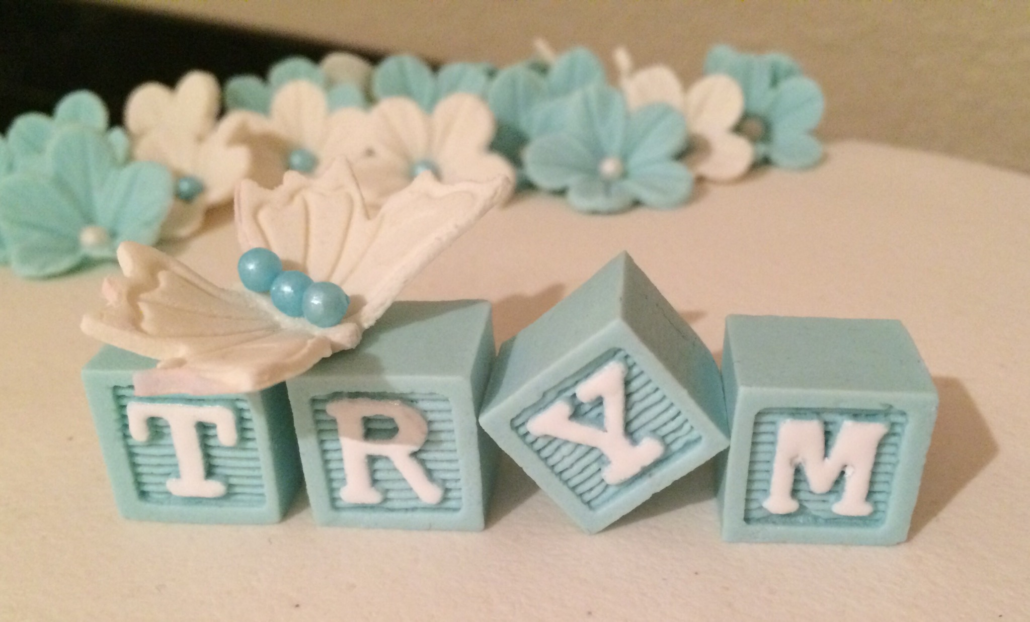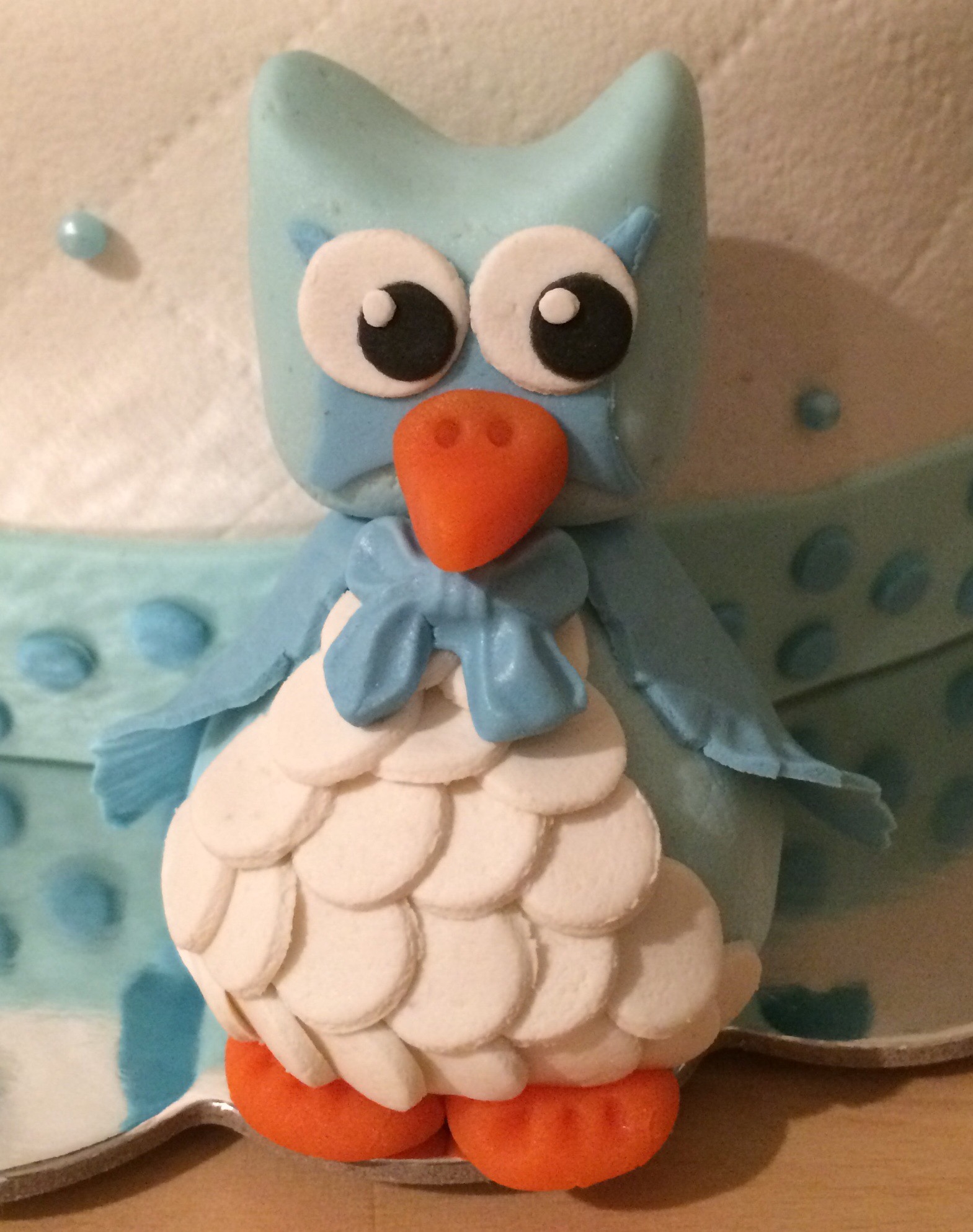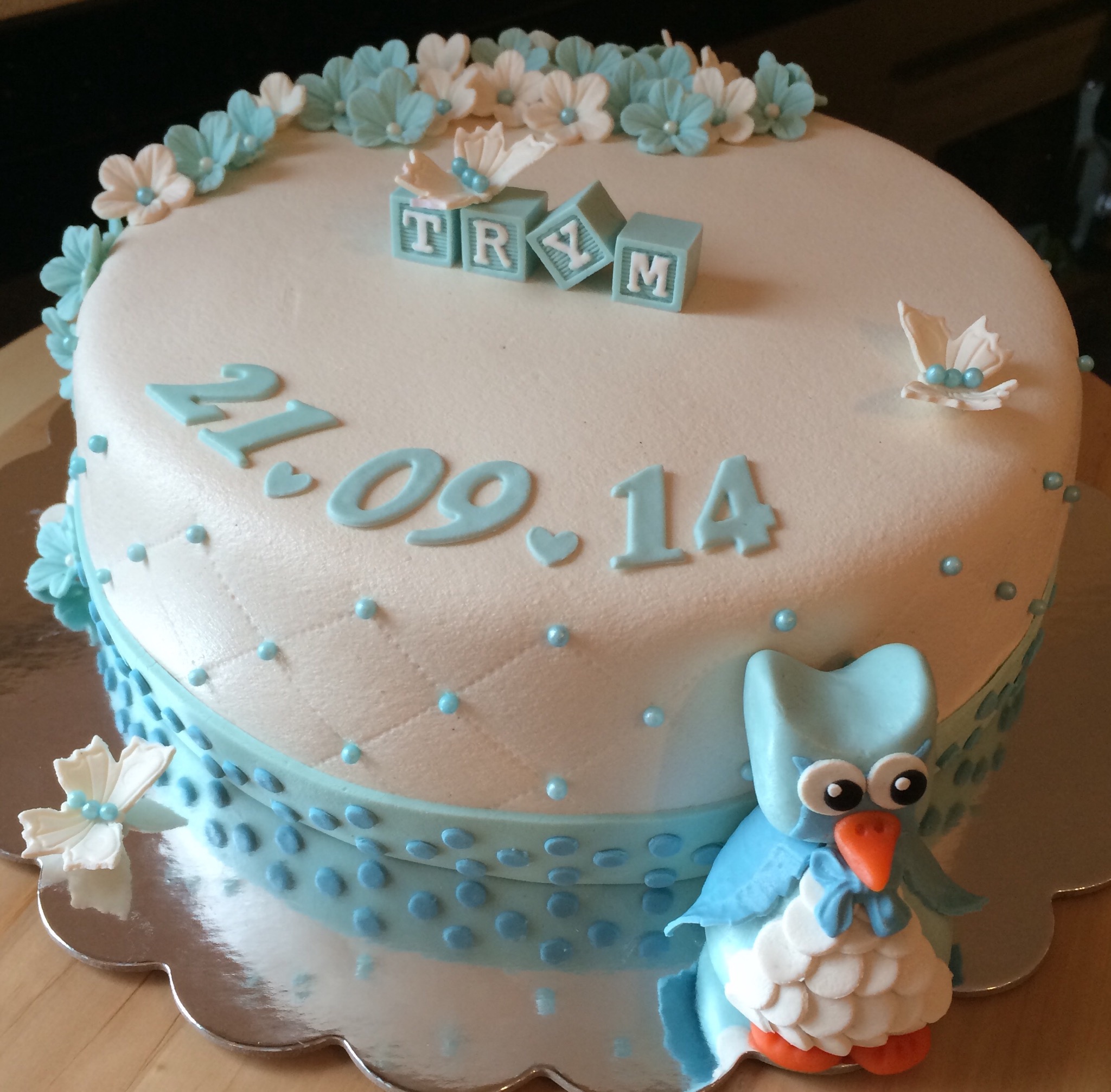 Søndagens dåpskake var til lille Trym. Mammaen til Trym ønsket en kake liknende kaken jeg bakte til Elliot for et par uker siden, men med en ugle og mer turkis fargetone. Hun sendte meg bilde av bordkortene som hadde mørkere turkis prikker, og jeg tenkte det kunne være stilig å ta dette opp igjen i kaken.