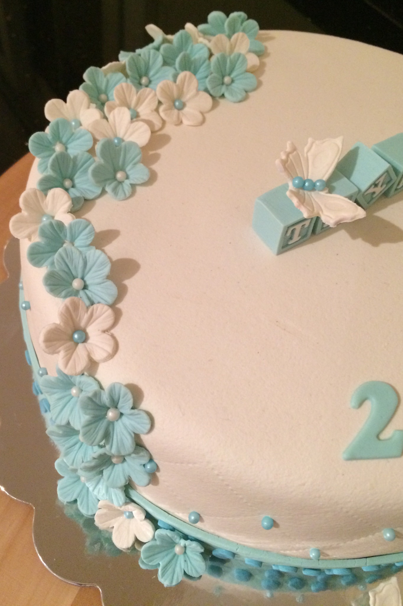 Dekoren på denne kaken består av rutemønster med perler, blomsterfall av småblomster, navneklosser, noen sommerfugler med perler på, et bånd med polkadots nederst rundt kaken, og en uglefigur. Slike figurer tar tid å lage, og må gjerne lages etappevis, men det er den delen av kakebakingen jeg liker best; å pusle med småting, lage blomster og figurer, og pynte 🙂