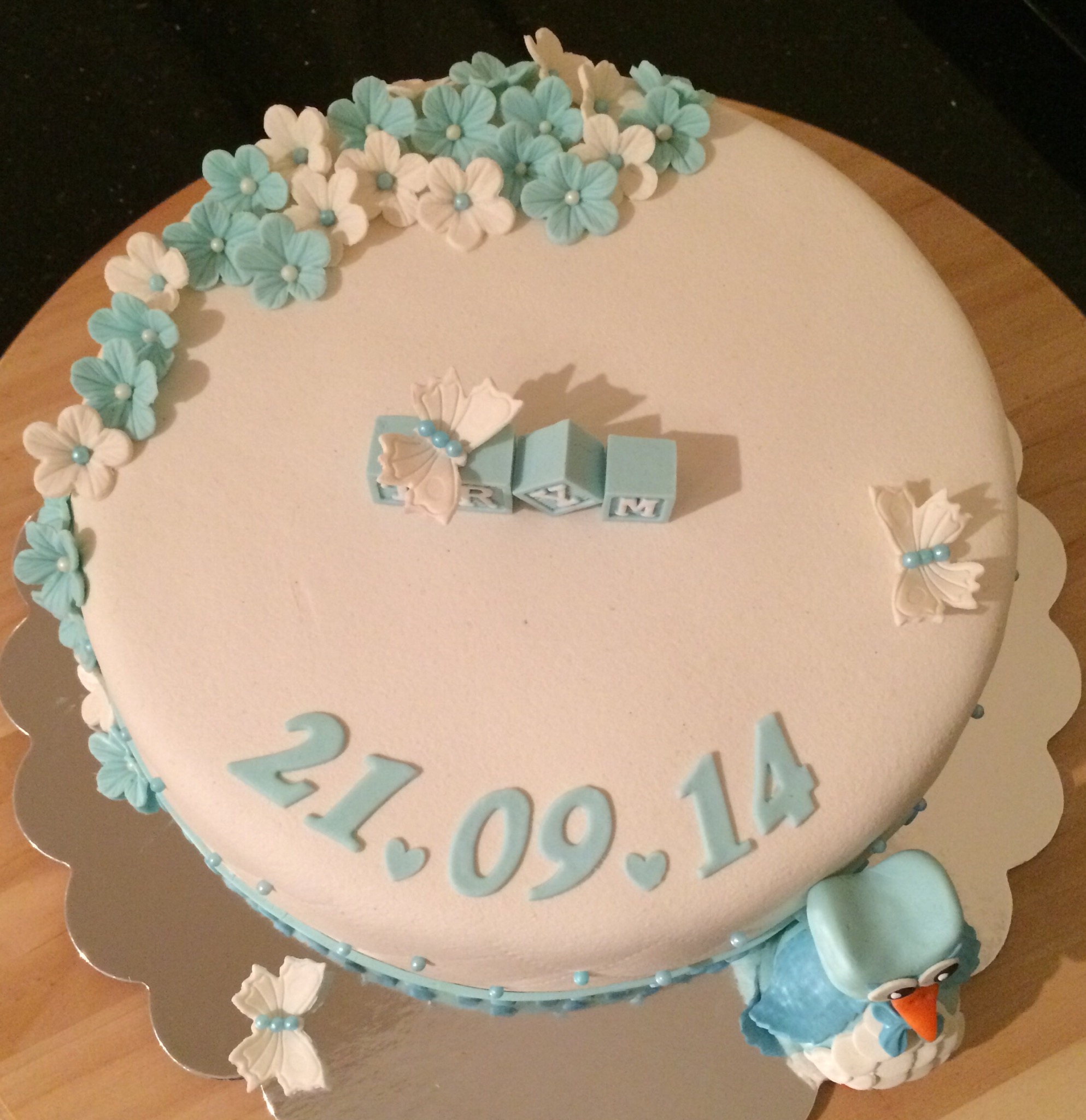 Hvit og lys turkis dåpskake med ugle og polkadots til Trym