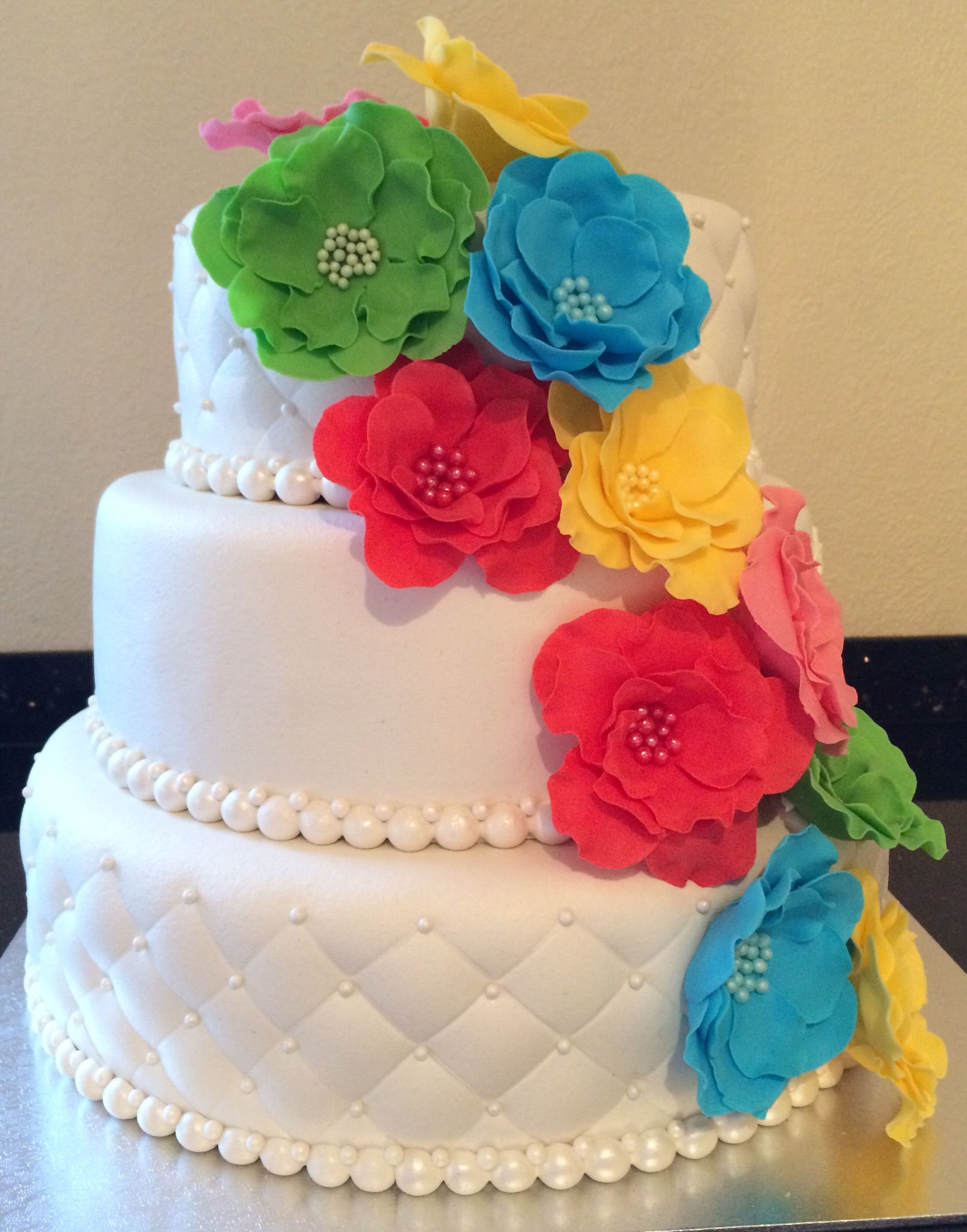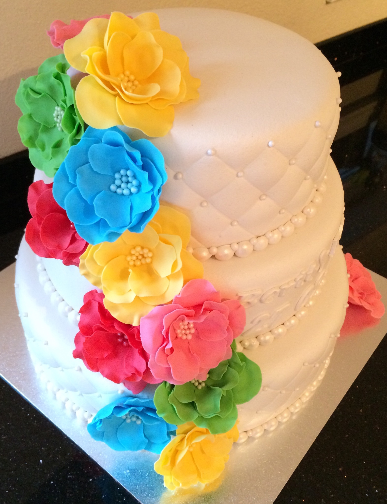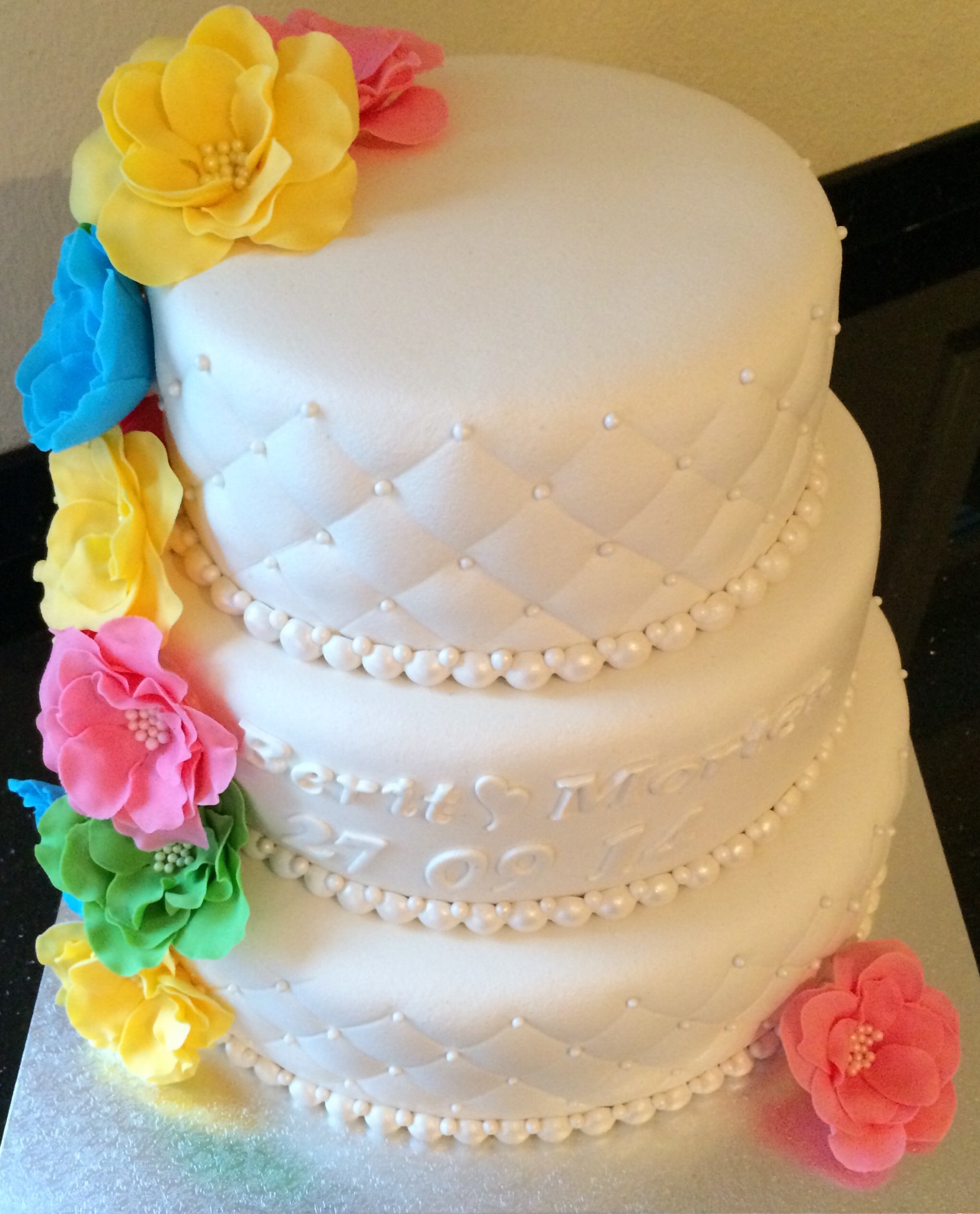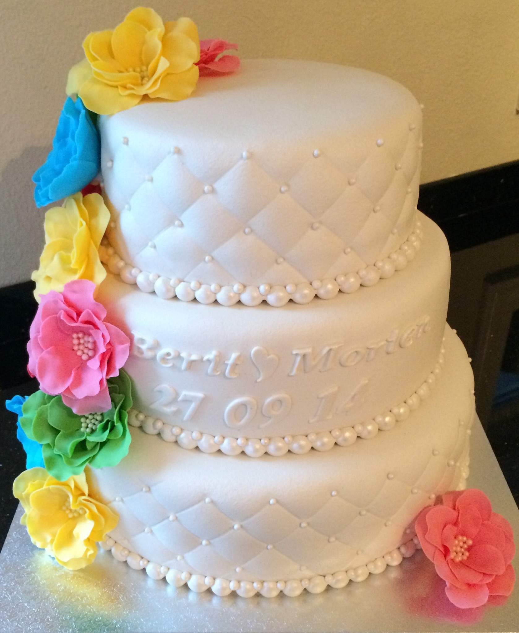 Pynten er som sagt dominert av store, lekne, fargerike fantasiblomster med fargede sukkerperler i midten på et hvitt grunnlag, jeg har kun brukt litt perlemorskimmer for å fremheve bokstaver, tall og perleborder. Kaken er nesten tom på toppen, dette er fordi paret selv hadde en kaketopp de skulle sette på 🙂