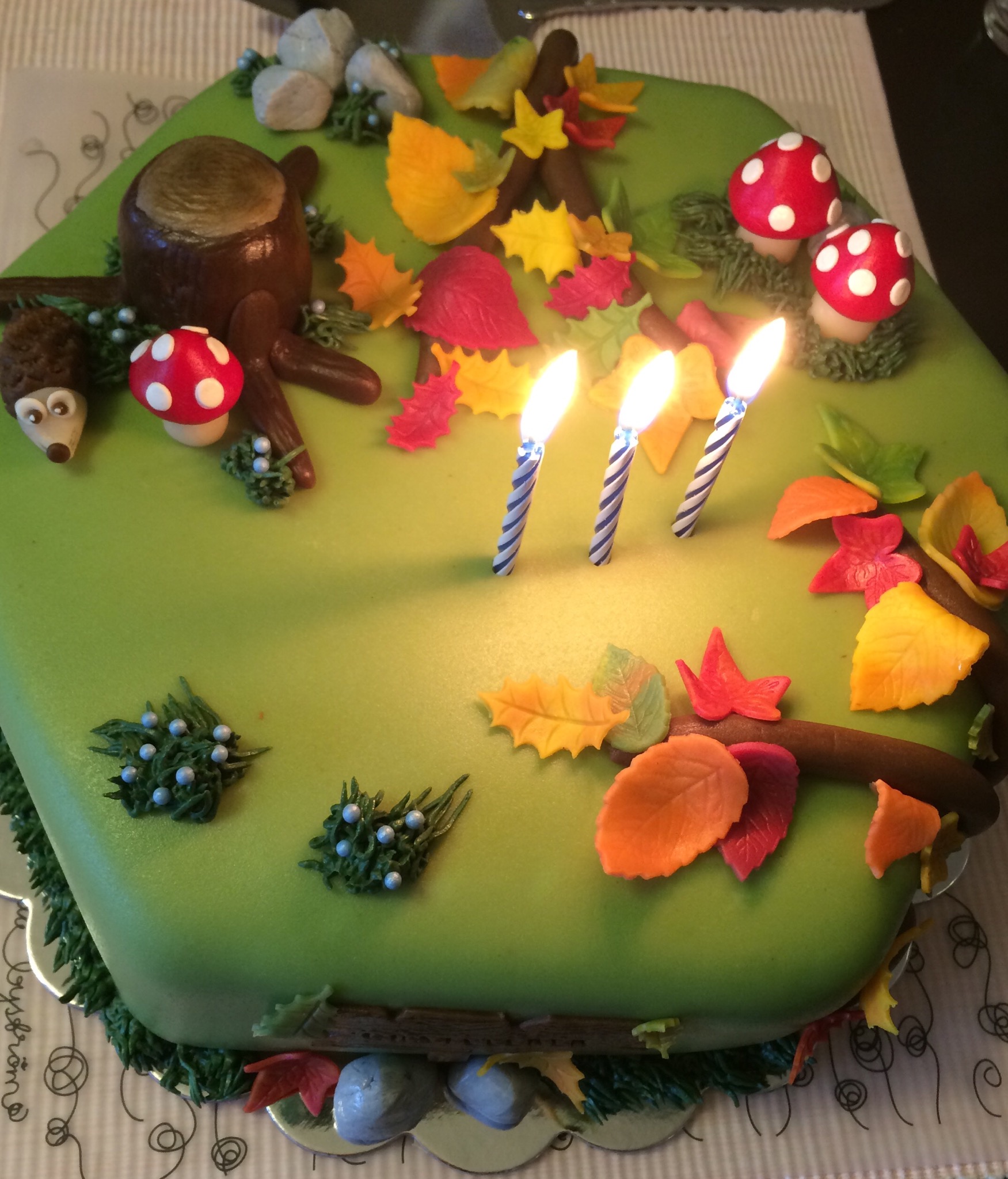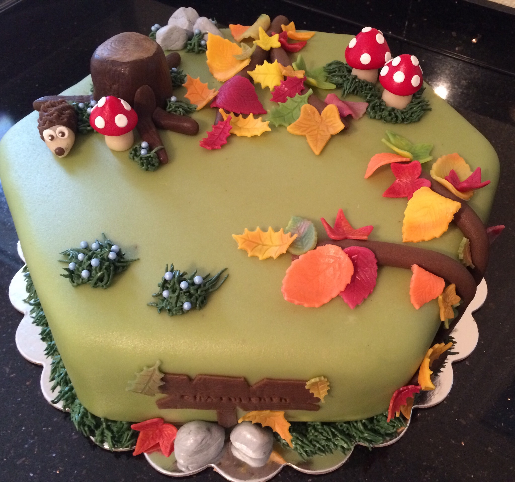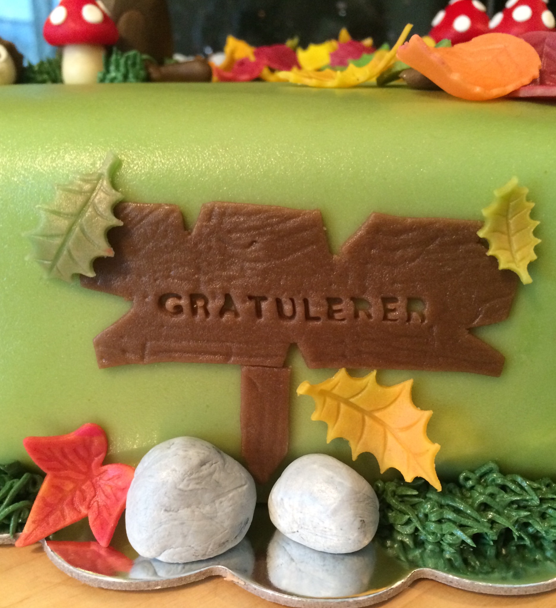 Jeg har laget masse fargerikt høstløv ved å delvis kna sammen oransje, gule, røde og grønne farger og stukket ut blader som er tørket i ulik fasong. Jeg har også laget noen sopp, stein, grener, en stubbe og et lite pinnsvin. Gresset rundt kaken er av smørkrem, og jeg har også brukt dette til å lage «blåbærlyng» med blå sukkerperler. Et slitt treskilt med «gratulerer» på foran på kaken.