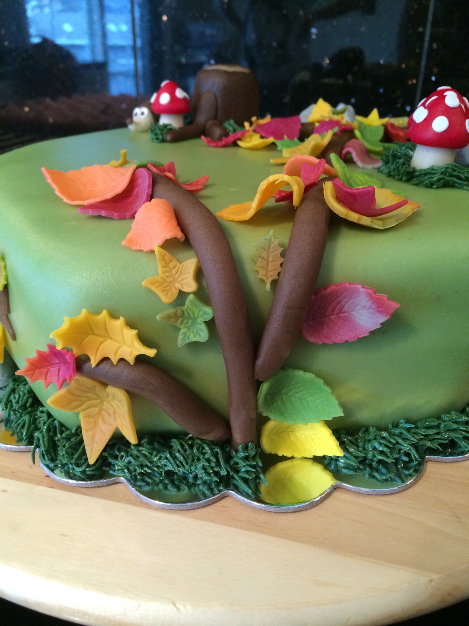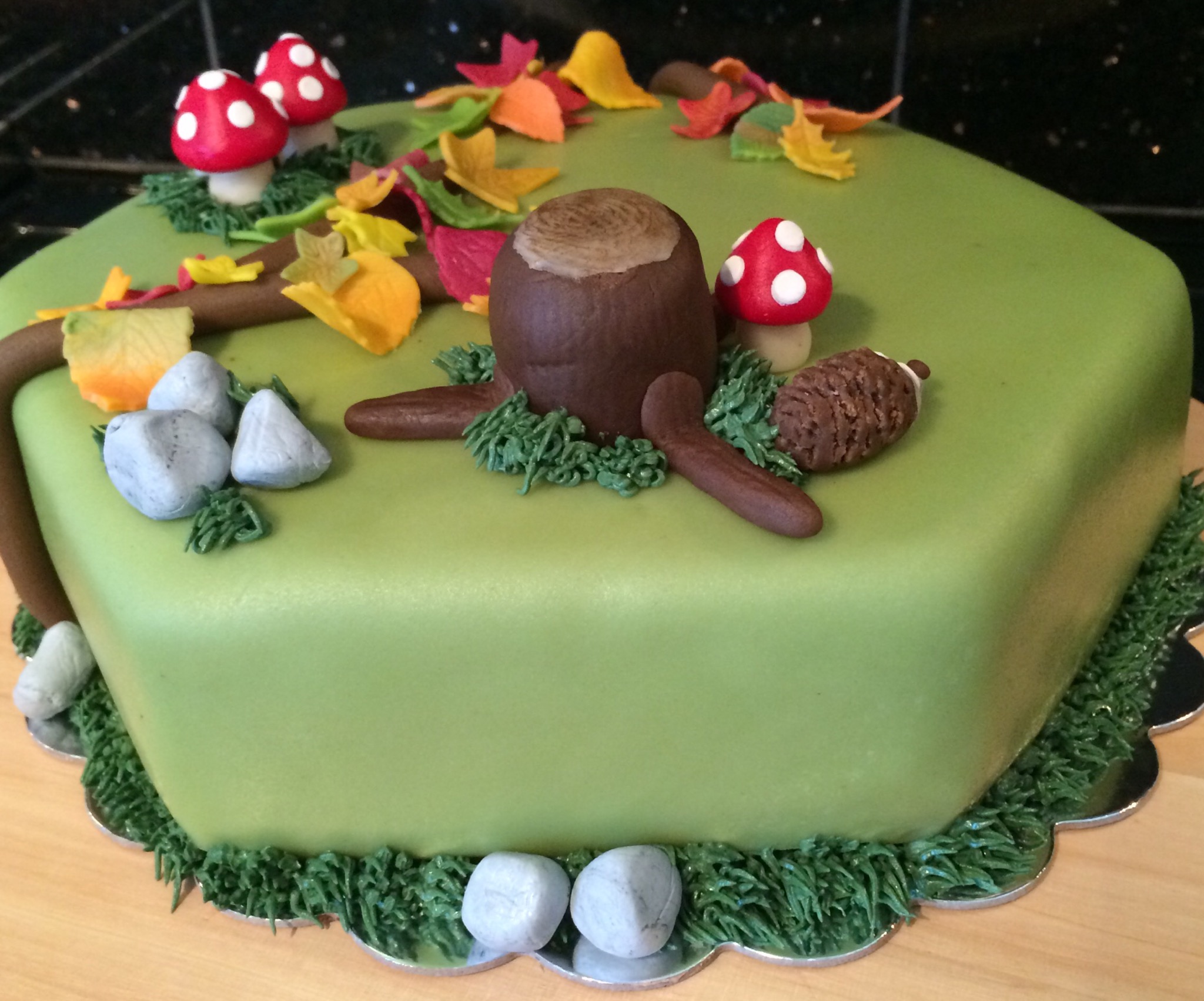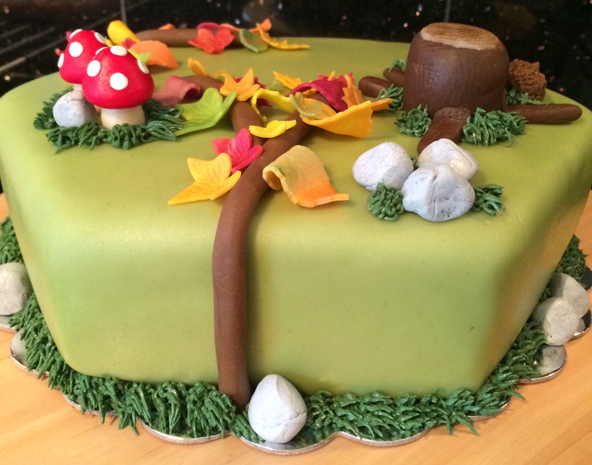 Jeg har laget masse fargerikt høstløv ved å delvis kna sammen oransje, gule, røde og grønne farger og stukket ut blader som er tørket i ulik fasong. Jeg har også laget noen sopp, stein, grener, en stubbe og et lite pinnsvin. Gresset rundt kaken er av smørkrem, og jeg har også brukt dette til å lage «blåbærlyng» med blå sukkerperler. Et slitt treskilt med «gratulerer» på foran på kaken.