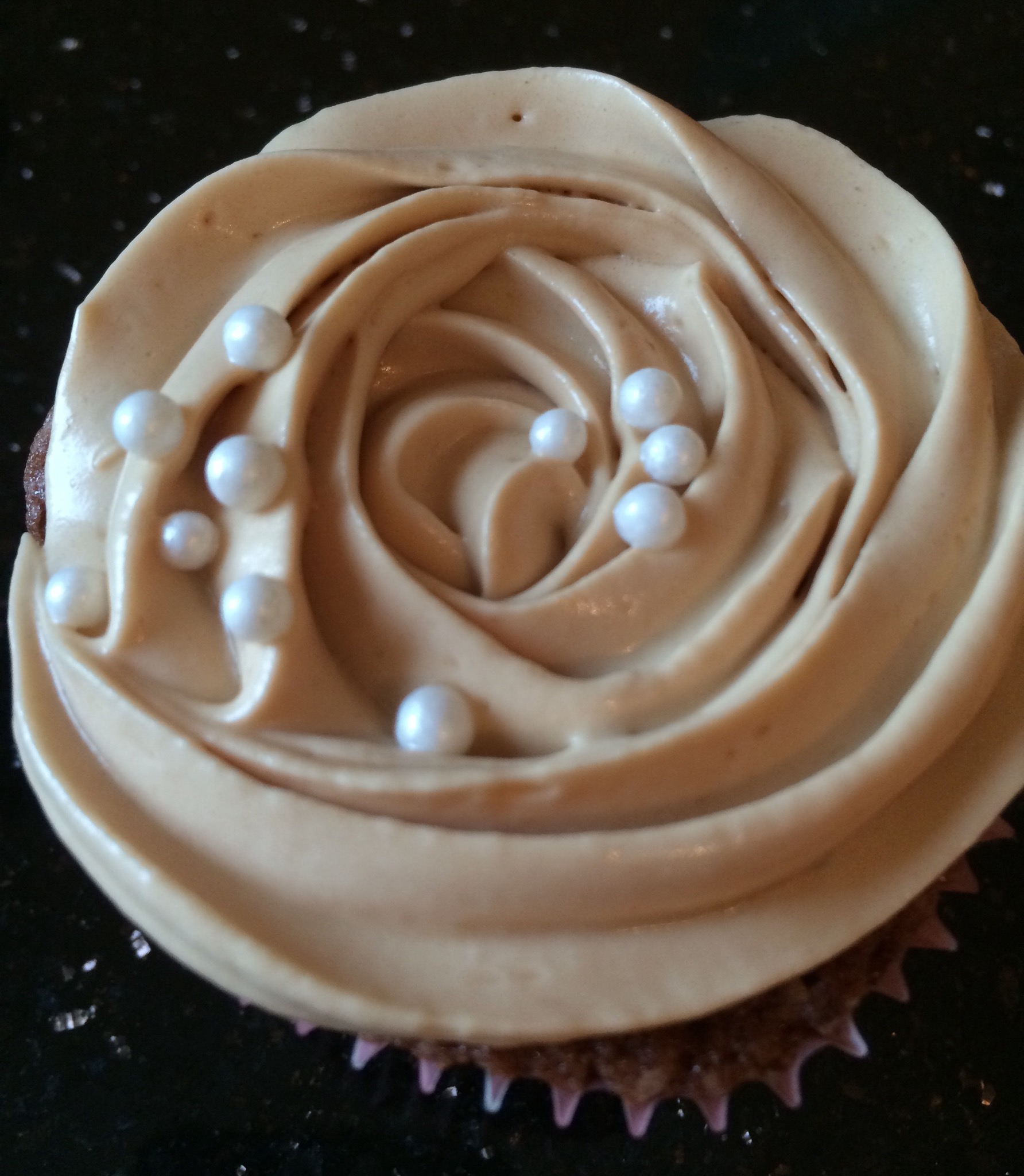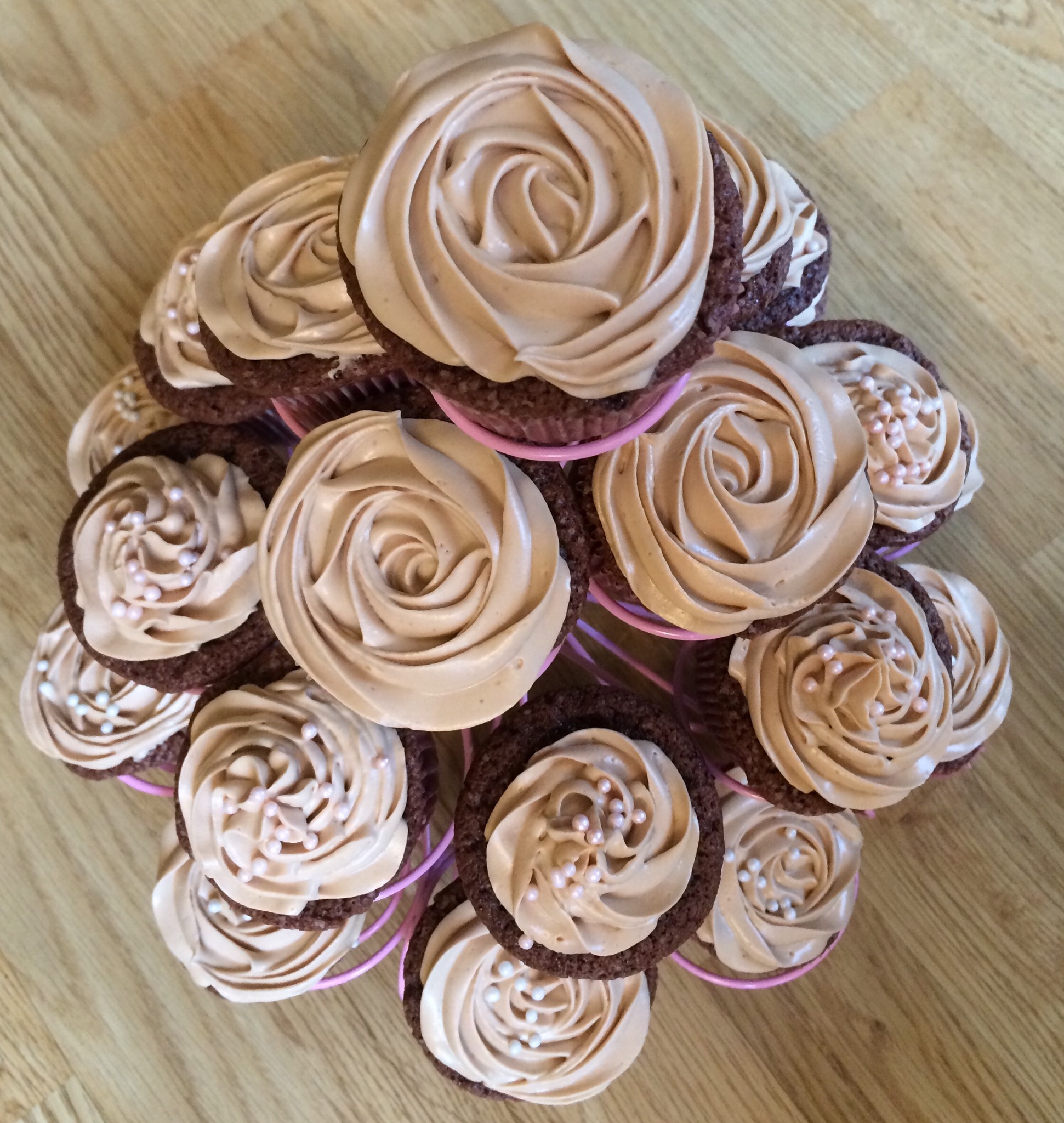 Cupcakesene er pyntet helt enkelt, noen med en liten kremtopp, noen med roseswirls. Og så klart noen sukkerperler 🙂