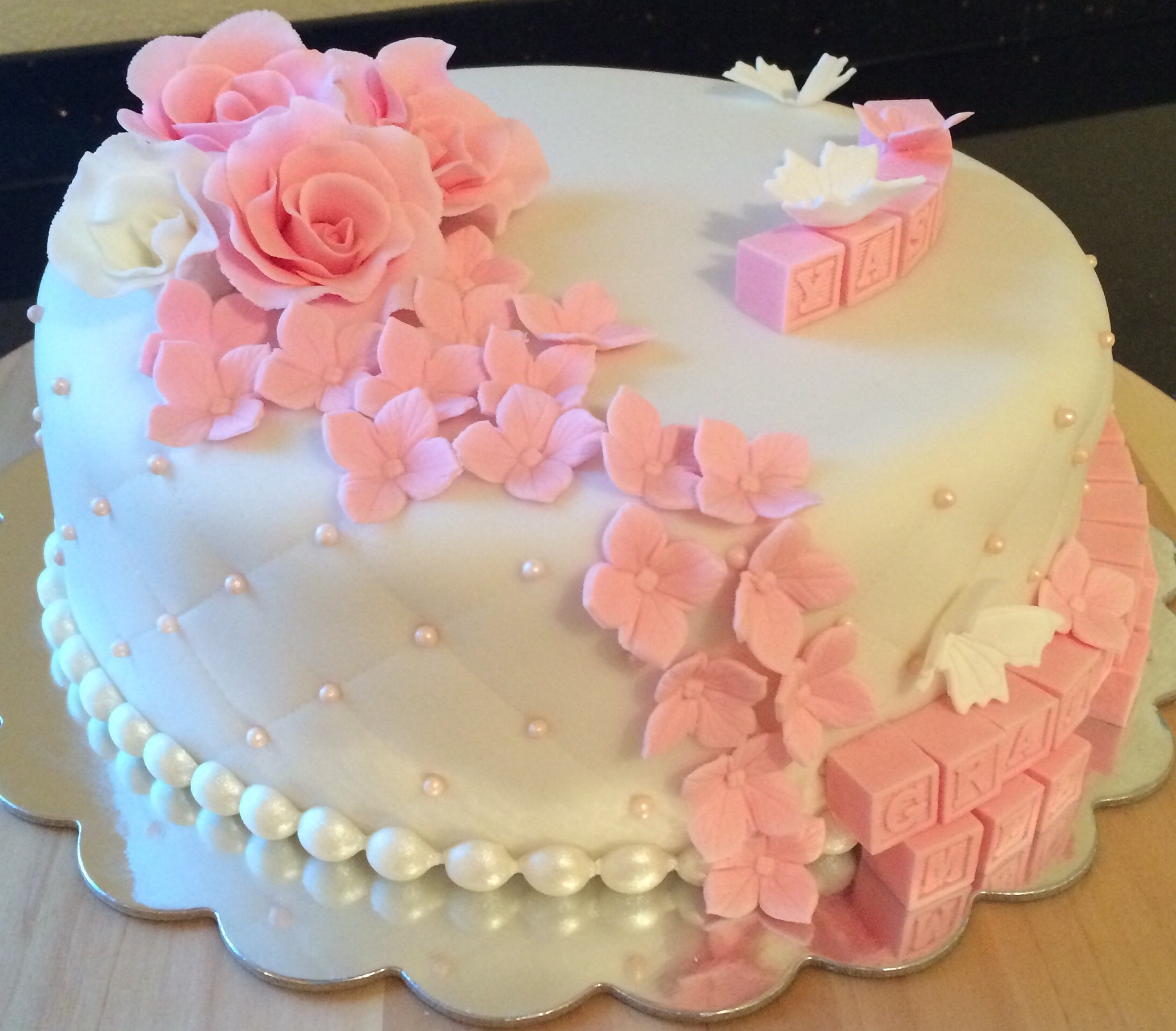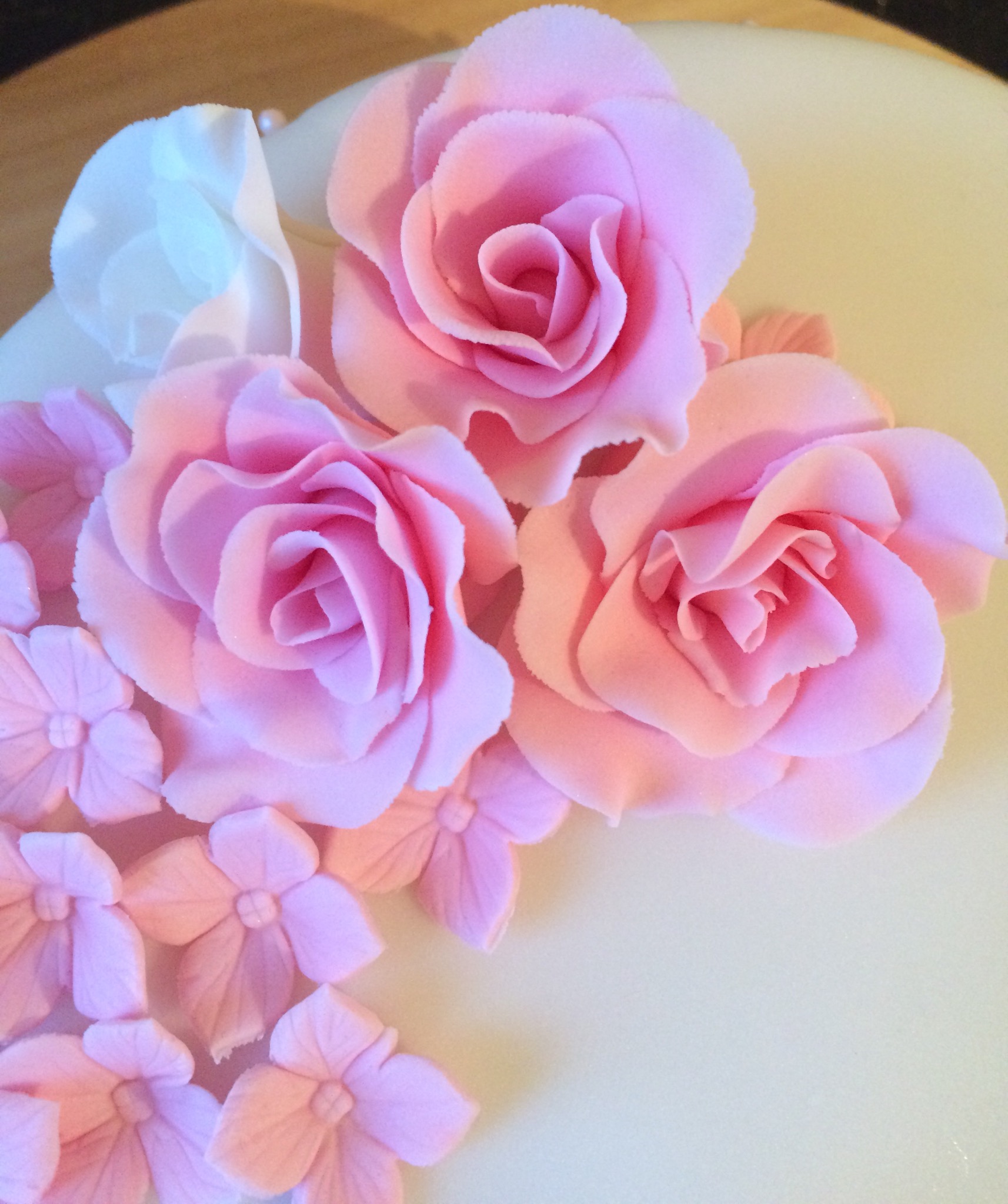 Det ferdige resultatet, pyntet med smørkrem sprøytet med Wilton 2D tip, perler og sukkerpastablomster og -sommerfugler: