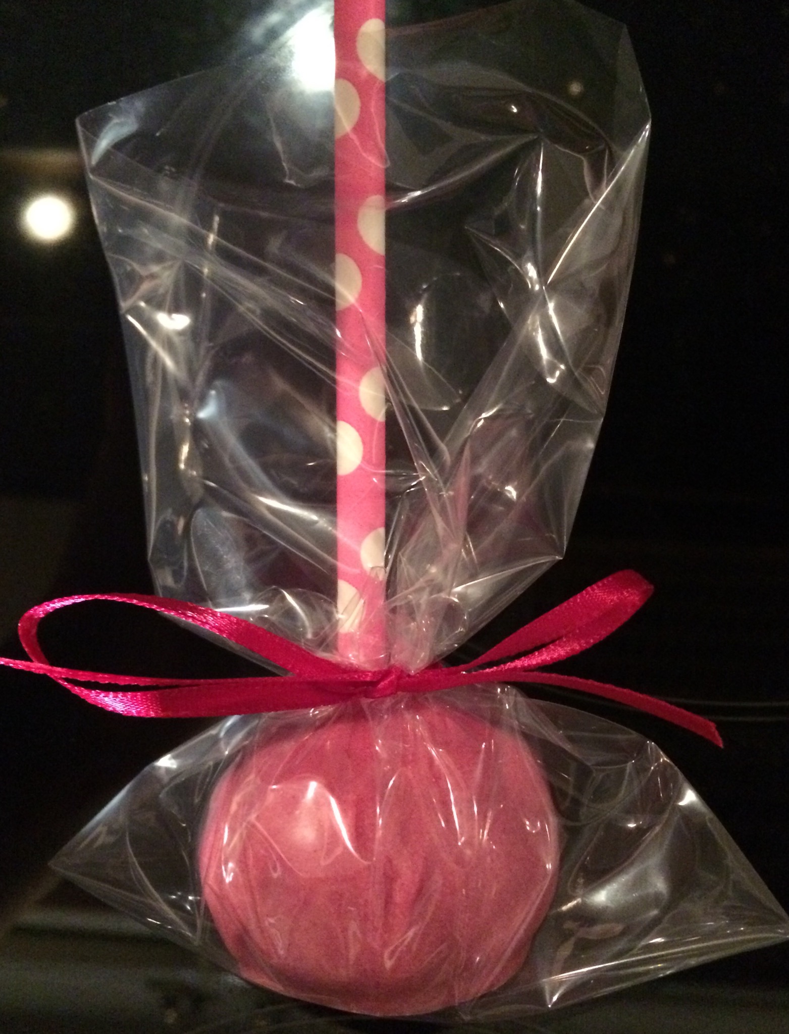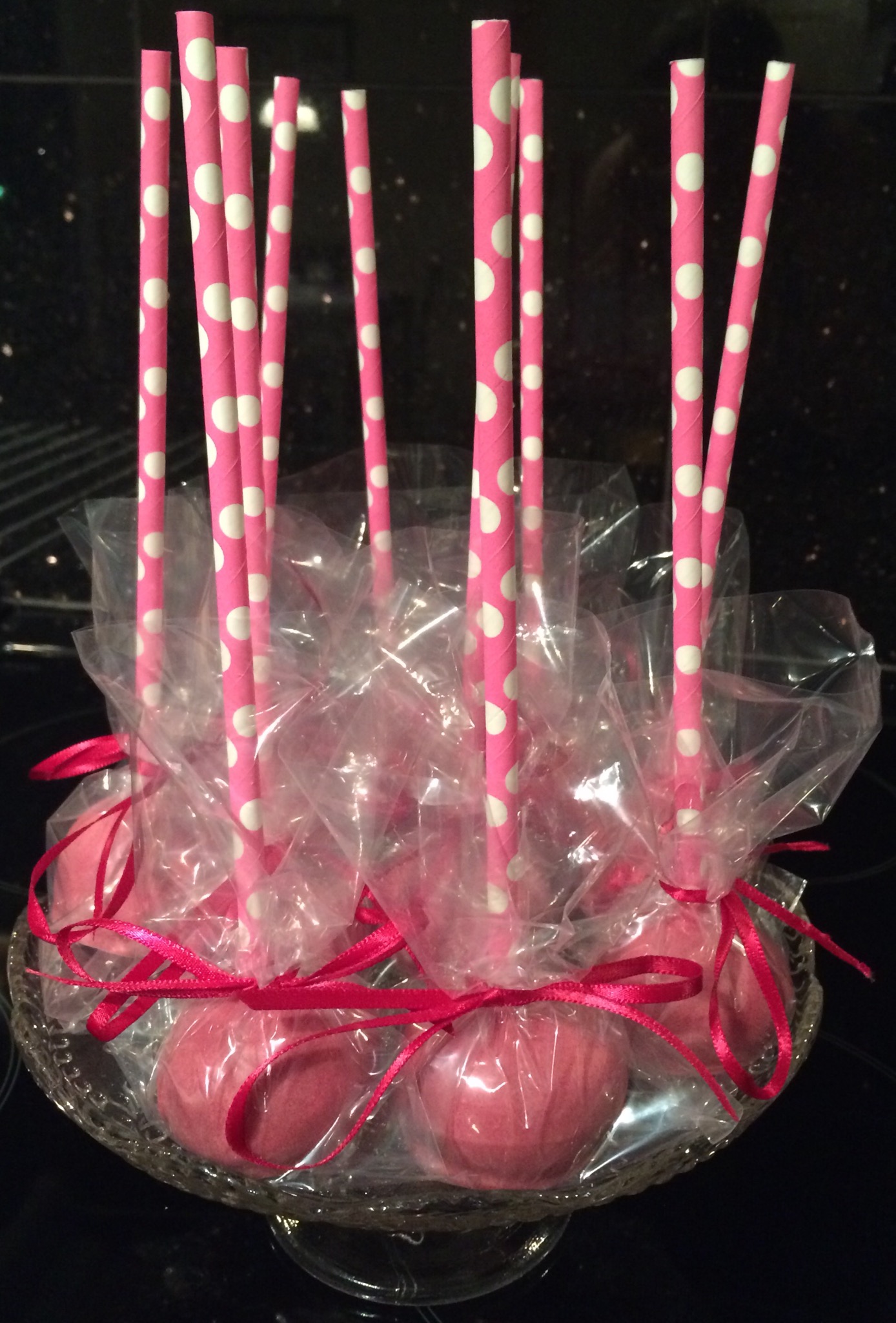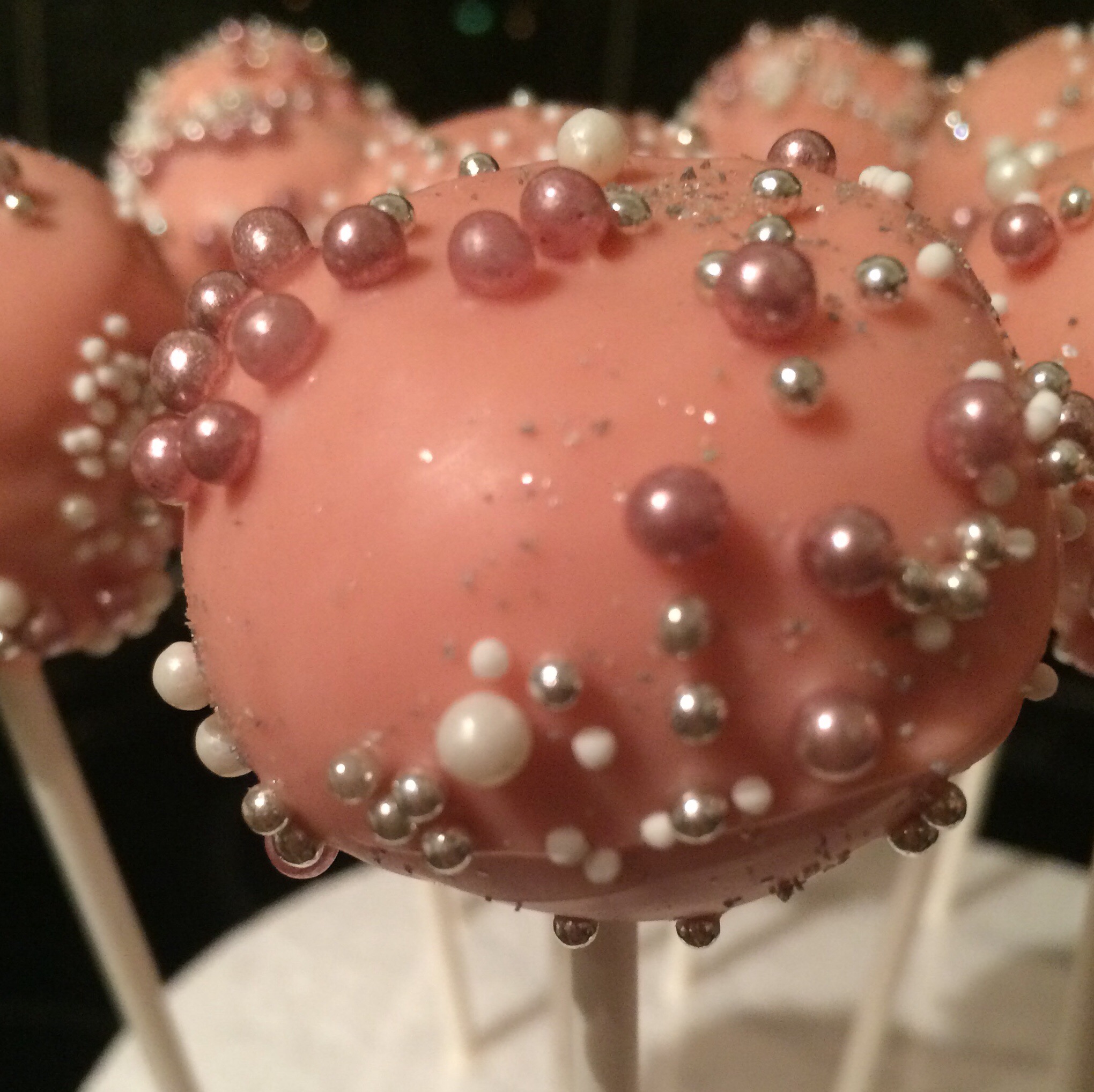 Og til sist hadde de lyst på cakepops, her har jeg laget to utgaver, den ene er sjokolade og kokos, den andre er vanilje. Begge typer er dekket av candymelts jeg har farget i to rosafarger, den ene typen har også en del perler og glitter: