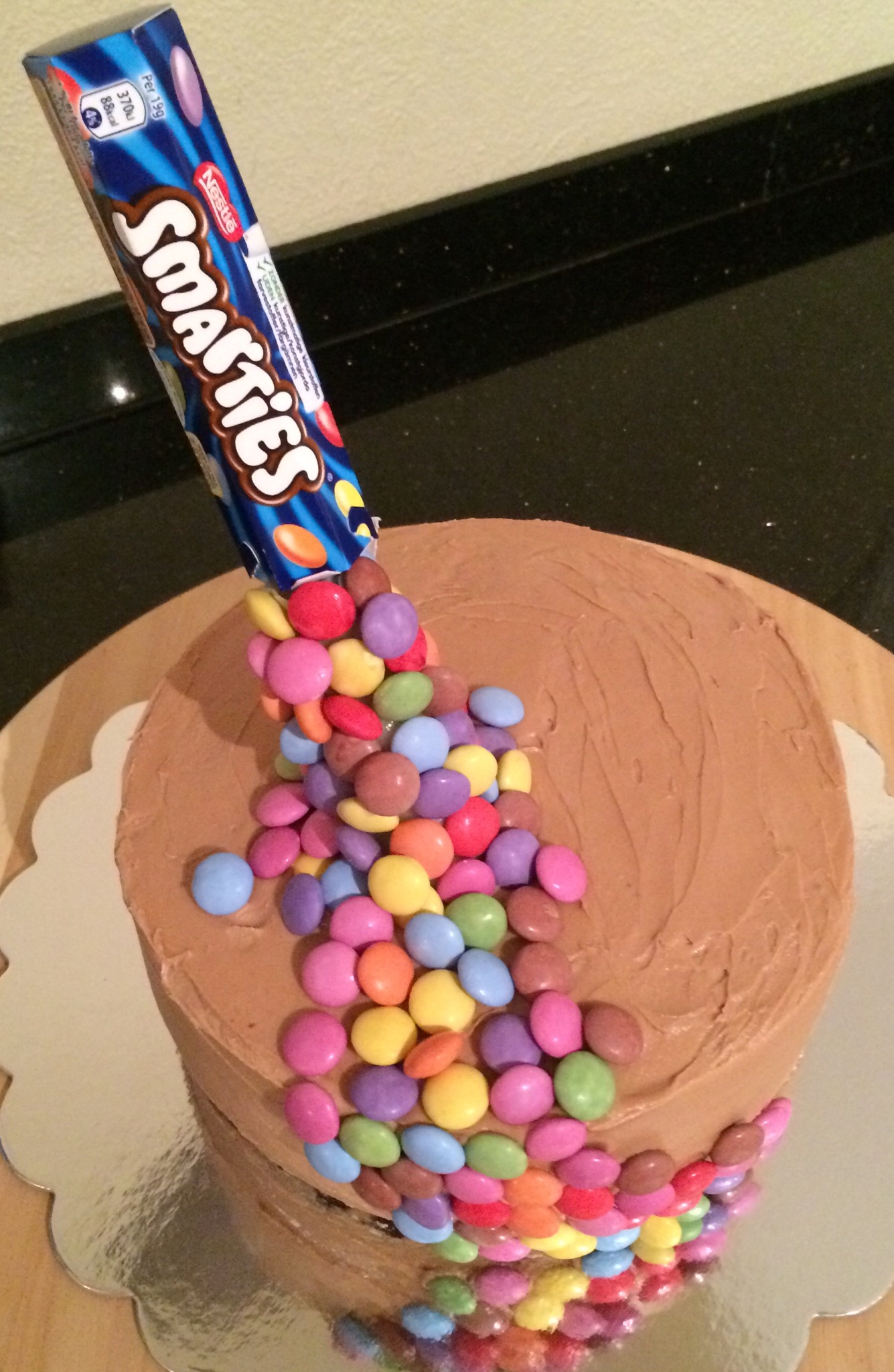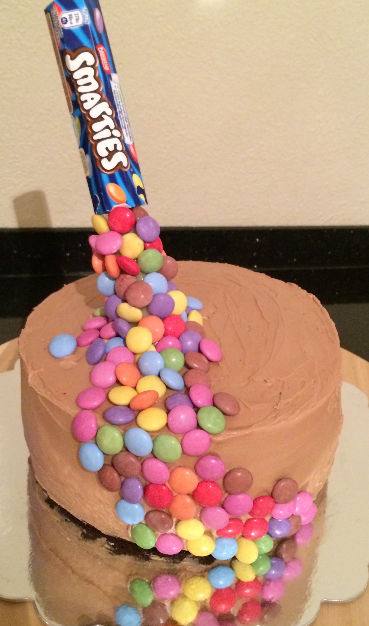 Pynten er veldig enkel, et Smartiesrør som heller Smarties utover kaken, tilsynelatende svevende over kaken. Det er selvsagt så enkelt som en grillpinne med et marsipankledd sugerør som holder røret oppe, og Smartiesene er festet med litt spiselig lim. Artig effekt 🙂