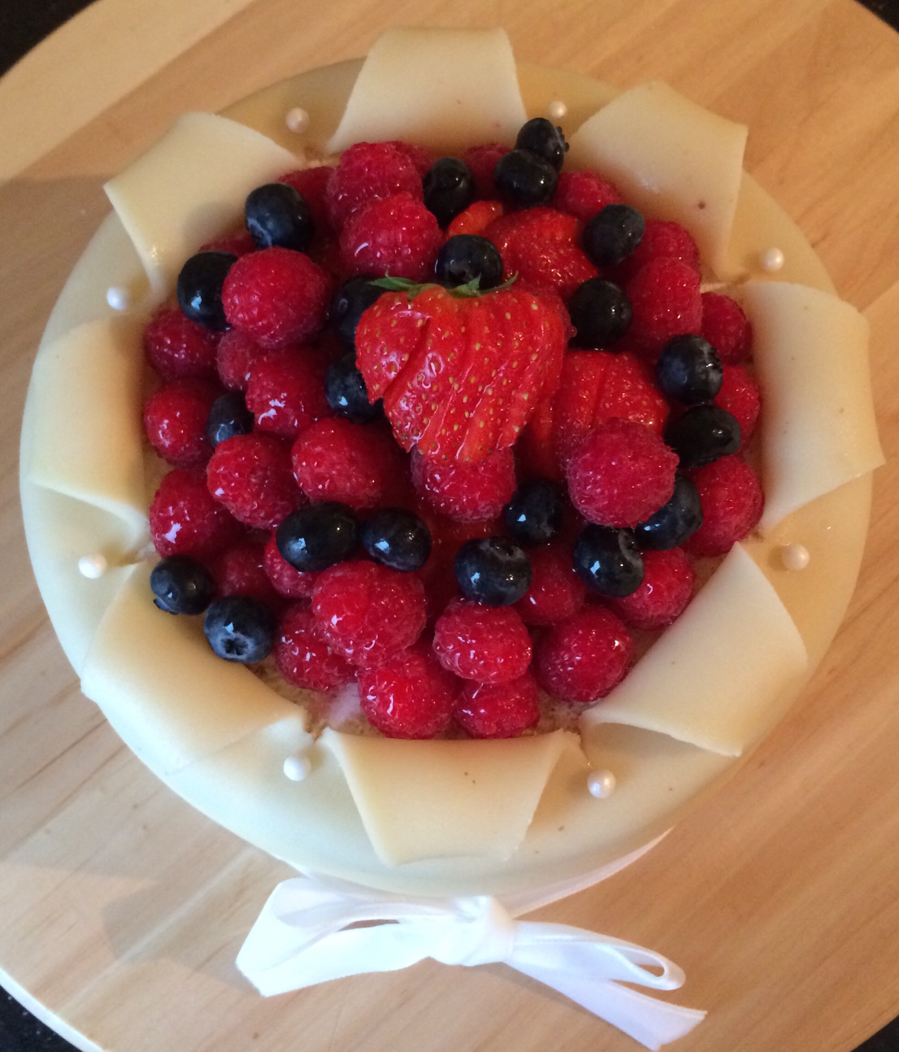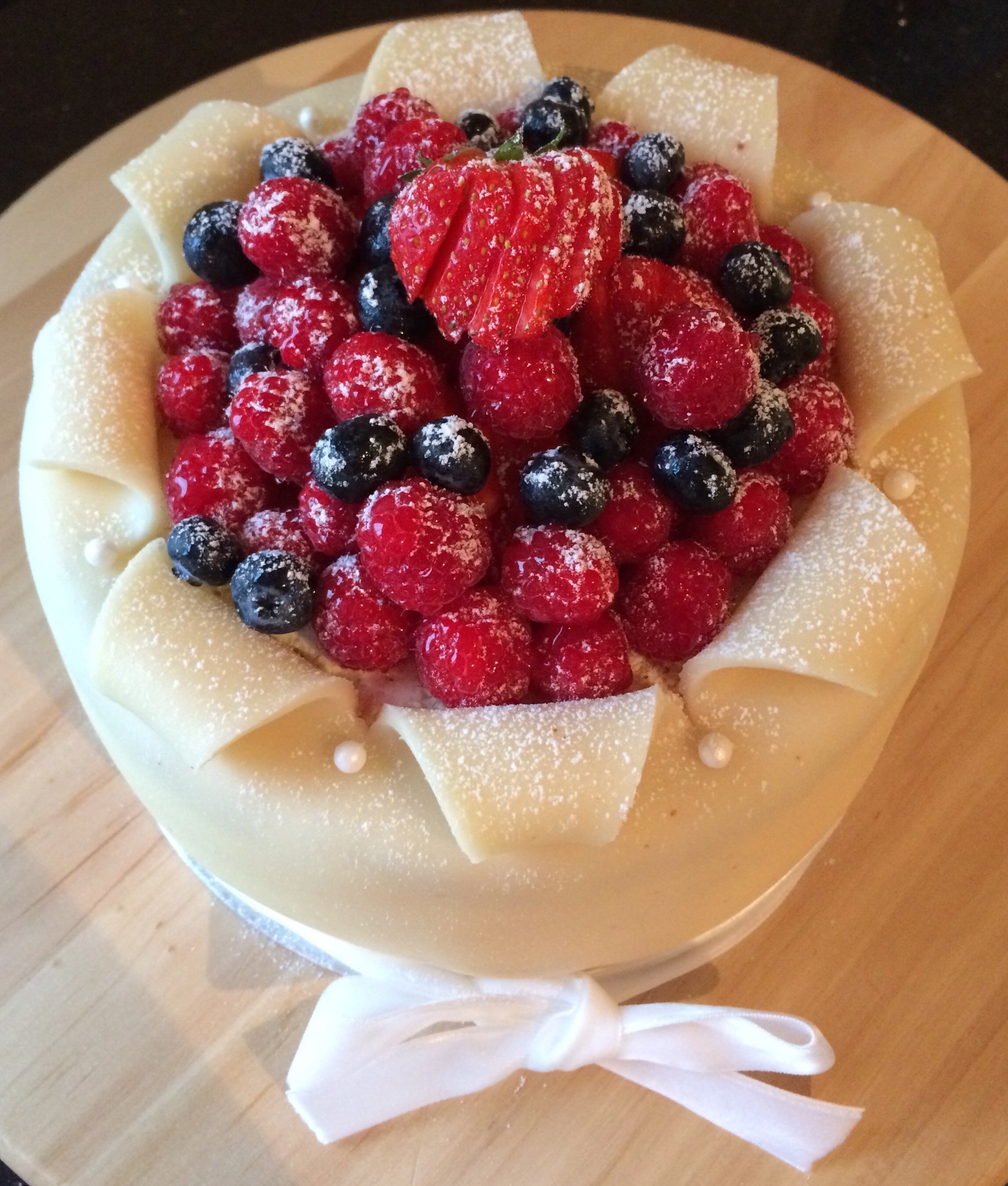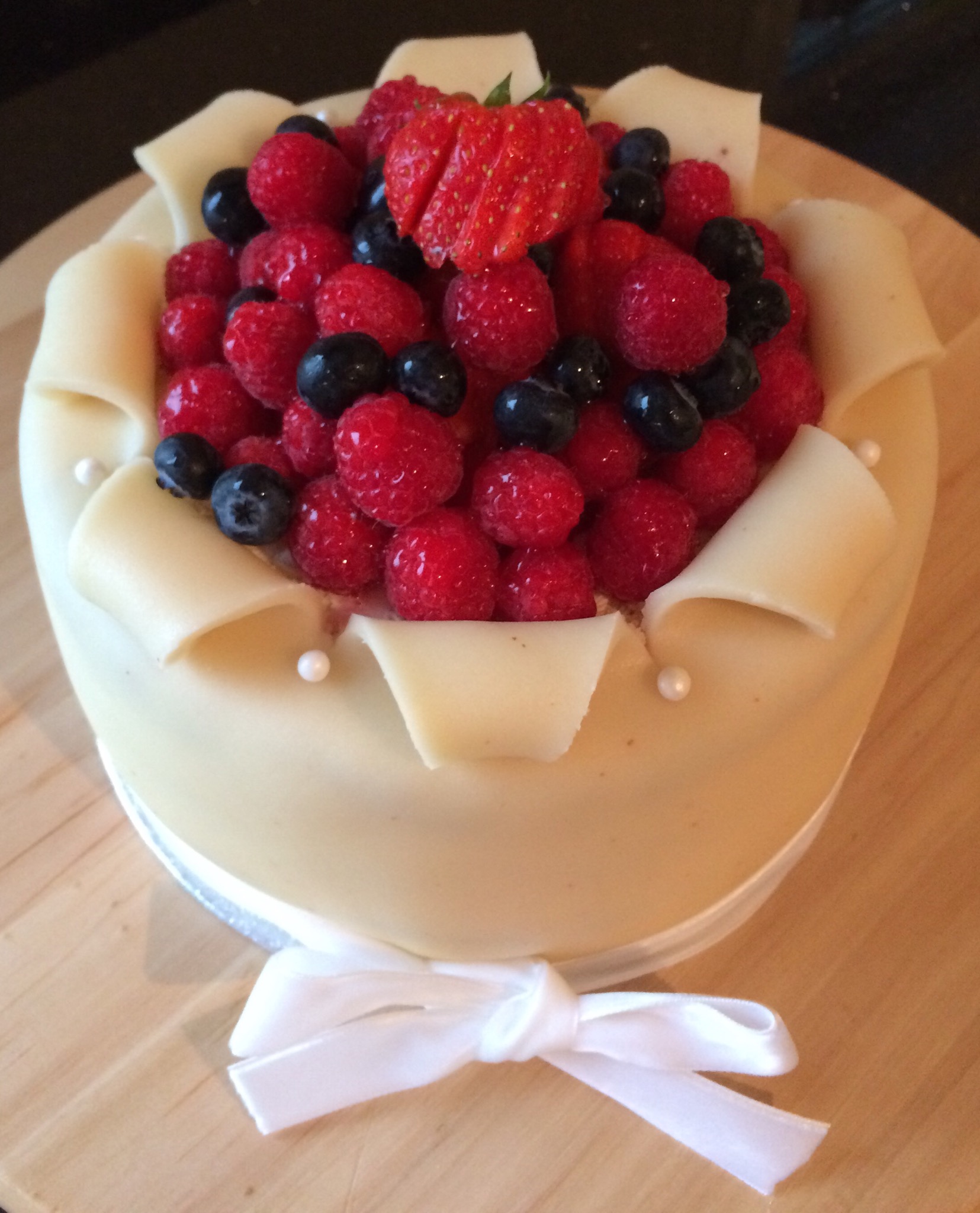 Utseendemessig en enkel kake, jeg har skåret til en åpning på toppen med flippene pent rullet bakover, og fylt med en haug bringebær, blåbær og jordbær. Noen små sukkerperler mellom flippene og et fløyelsbånd rundt kaken nederst. Enkelt og elegant 🙂