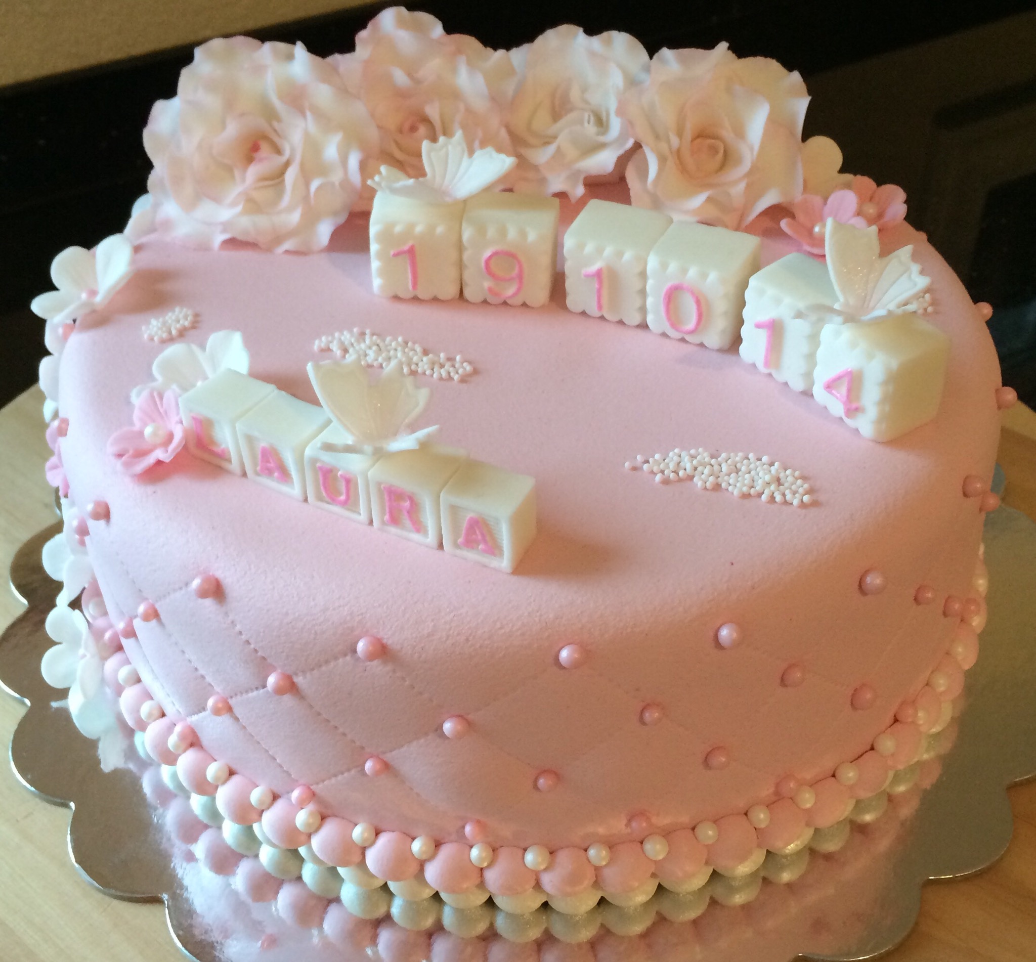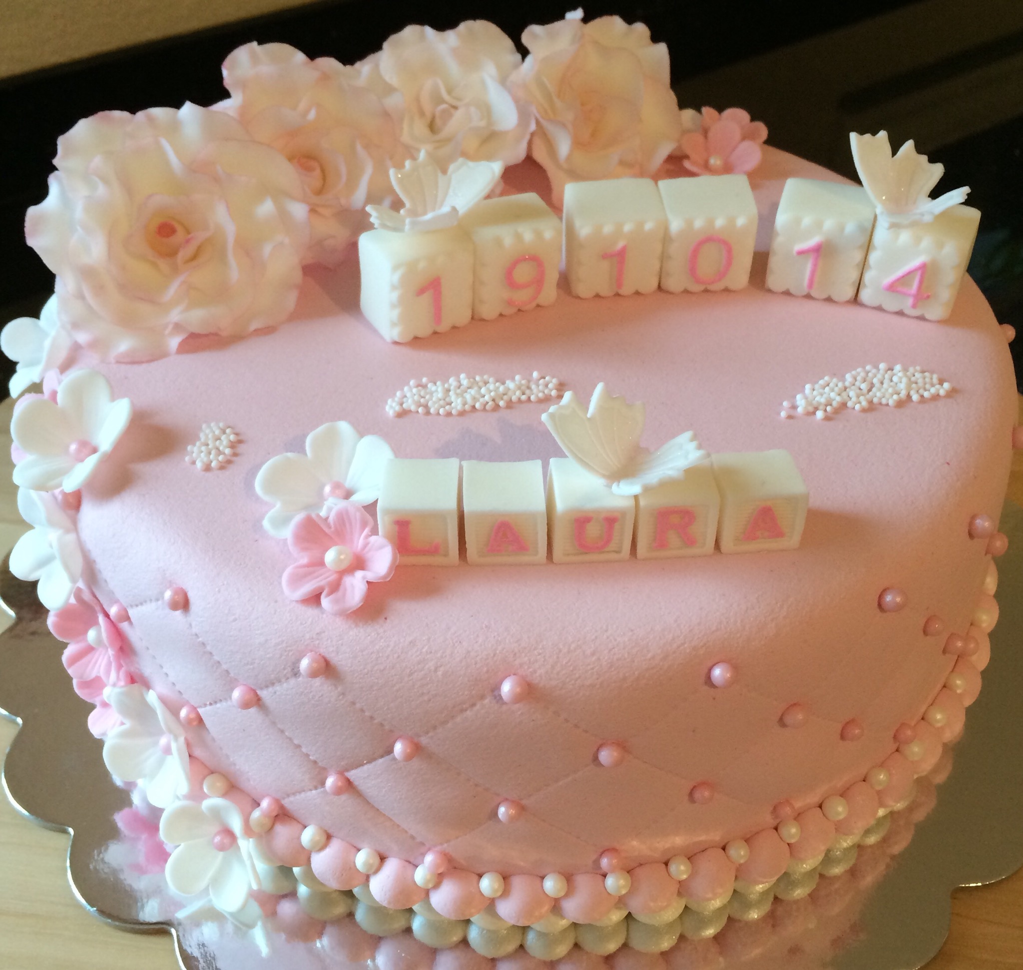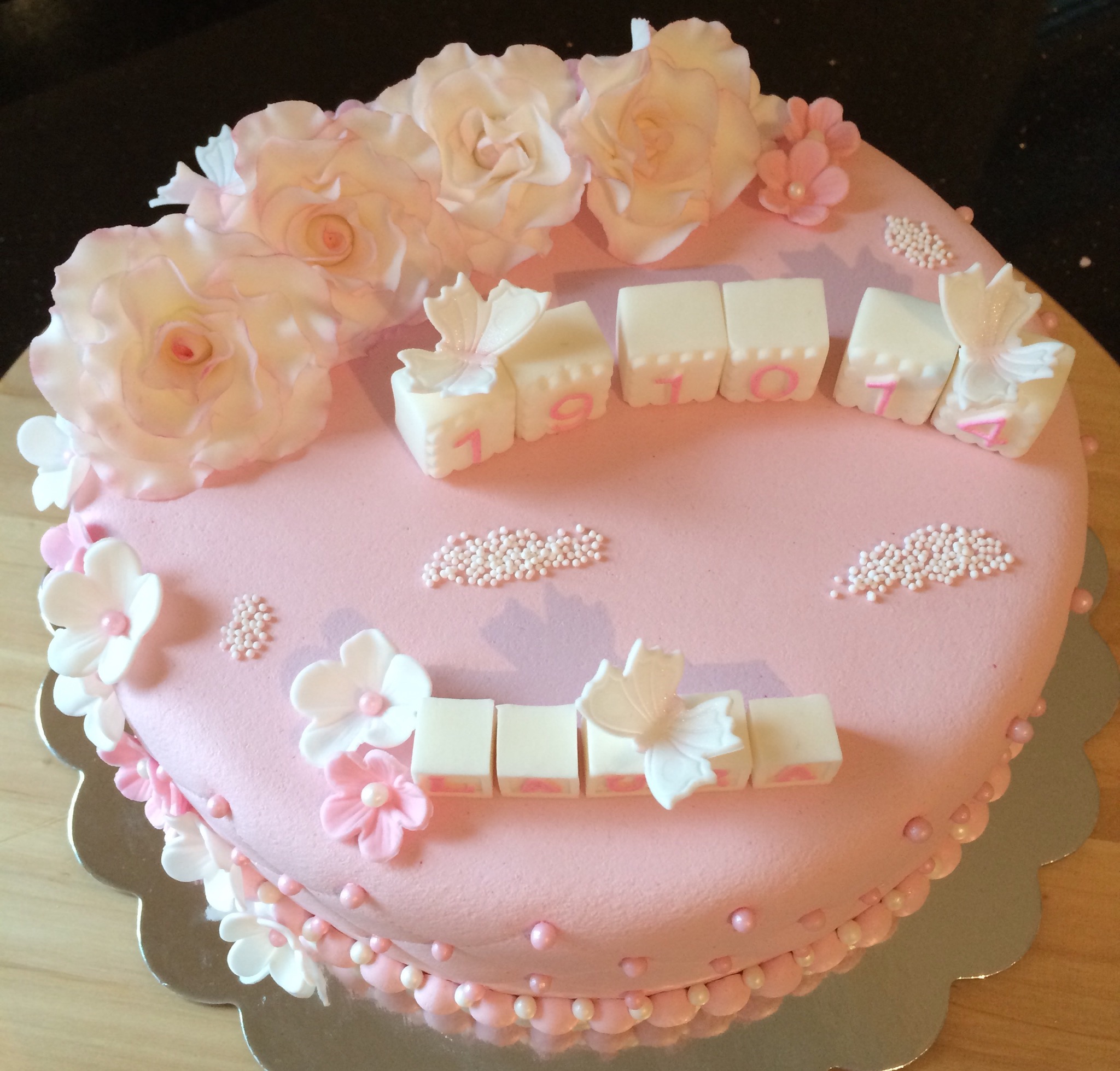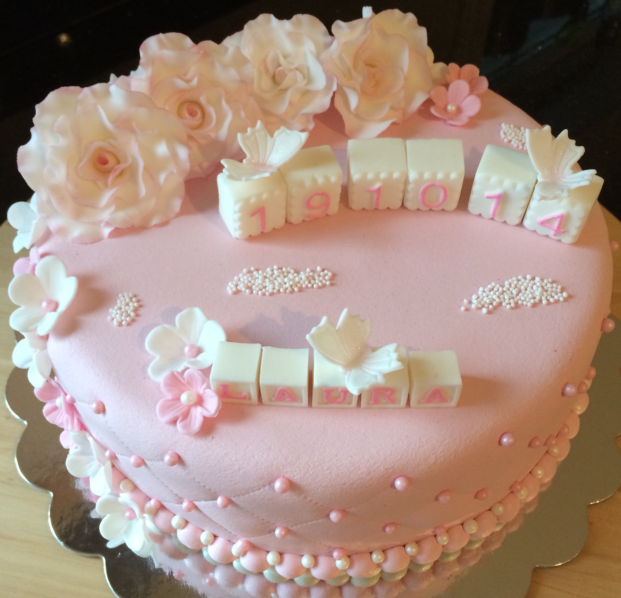 Utseendemessig er kaken deilig babyrosa, med hvit og rosa pynt. Pynten er dominert av hvite roser som jeg dustet med rosa for variasjonens skyld (synes også det gjorde dem mer «levende»), småblomster, noen sommerfugler, klosser til navn og dato, og litt perler. Feminint og søtt 🙂