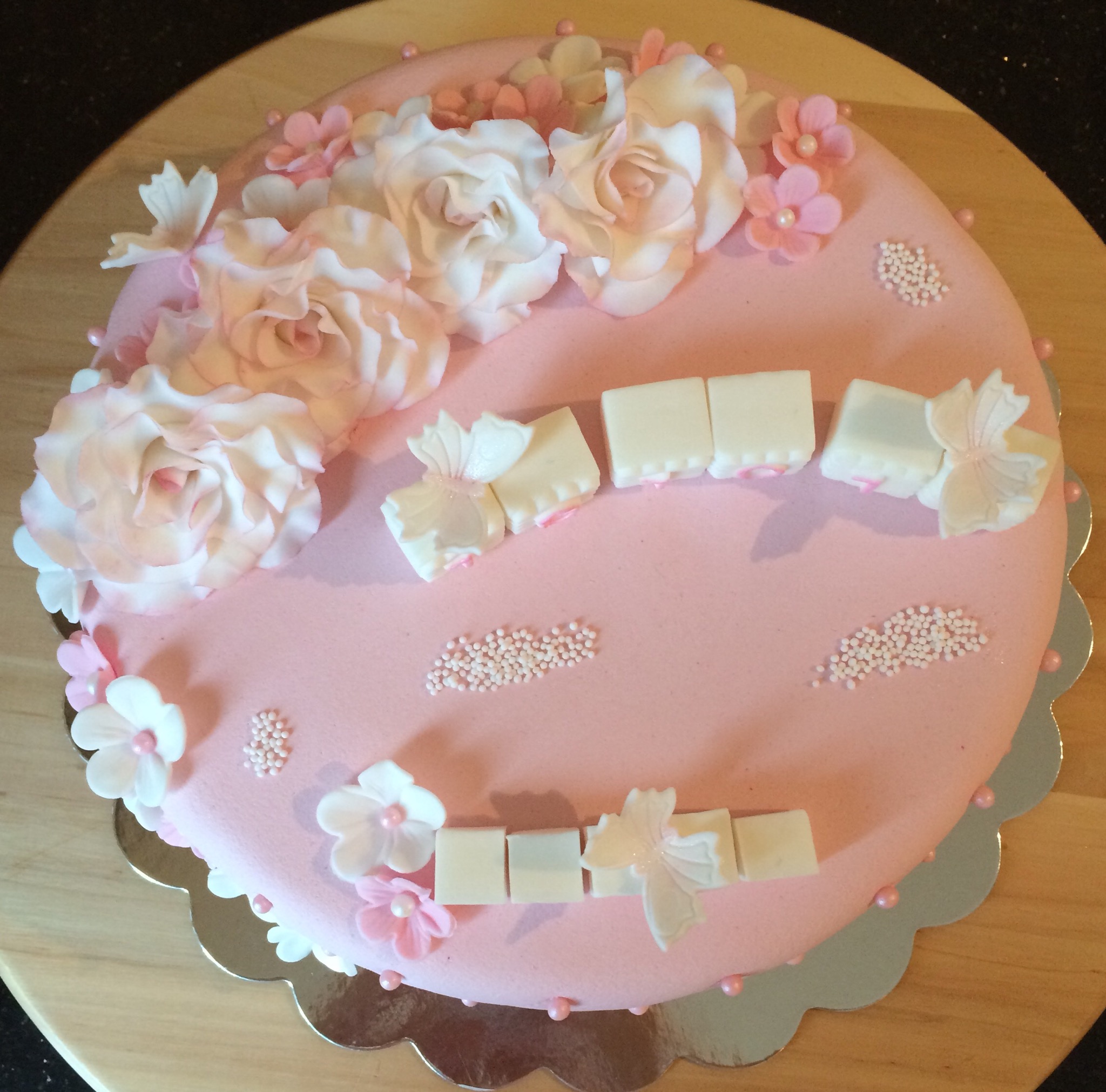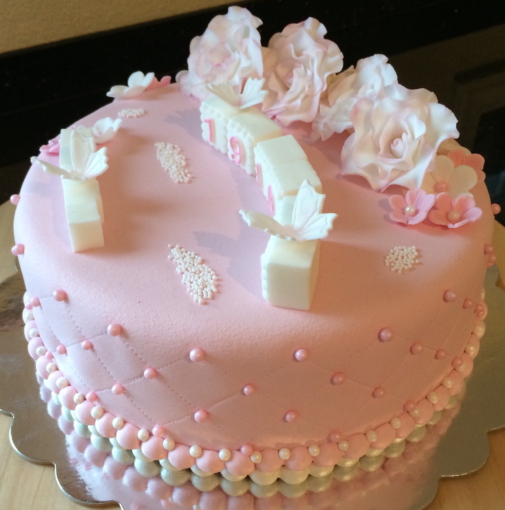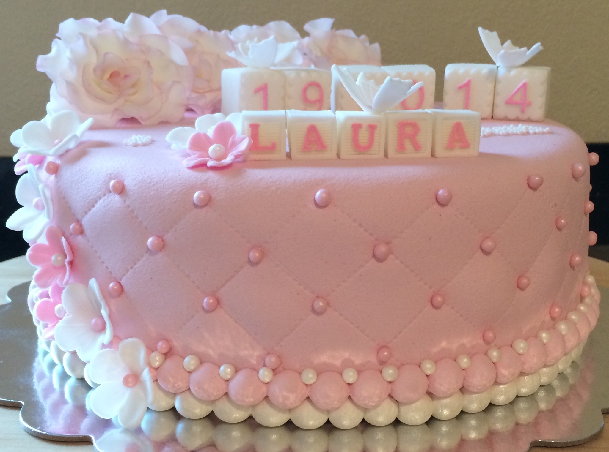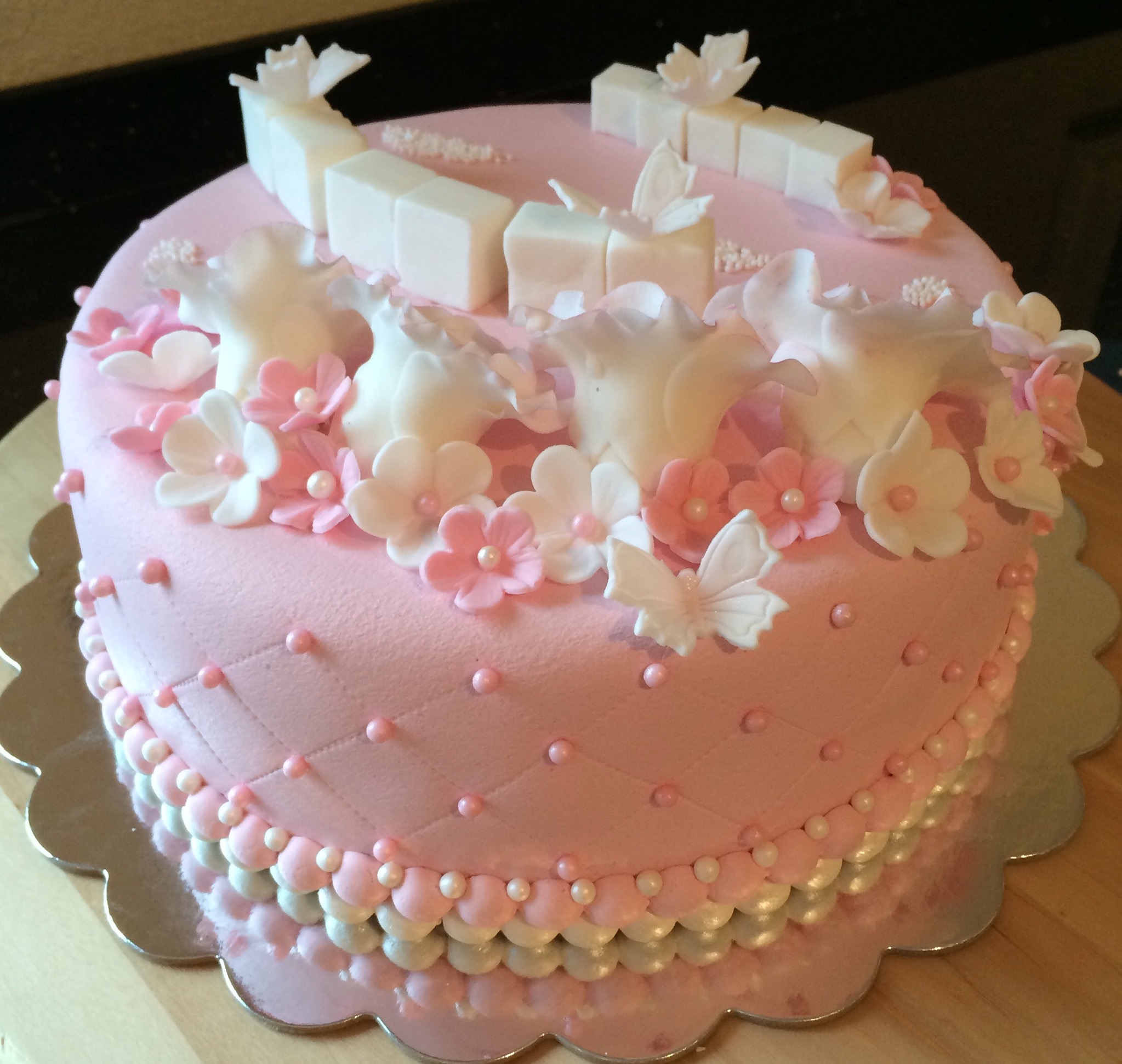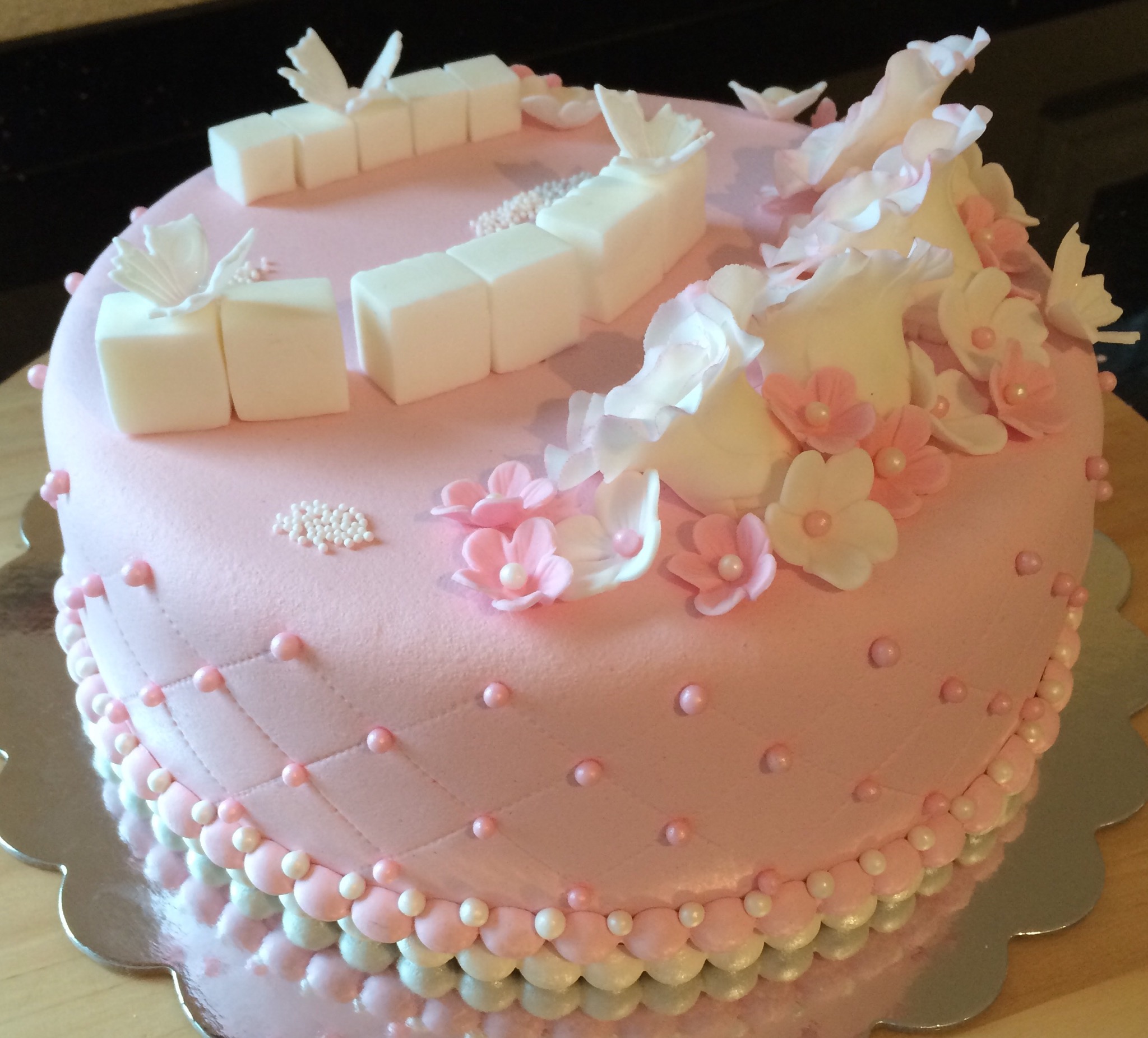 Utseendemessig er kaken deilig babyrosa, med hvit og rosa pynt. Pynten er dominert av hvite roser som jeg dustet med rosa for variasjonens skyld (synes også det gjorde dem mer «levende»), småblomster, noen sommerfugler, klosser til navn og dato, og litt perler. Feminint og søtt 🙂