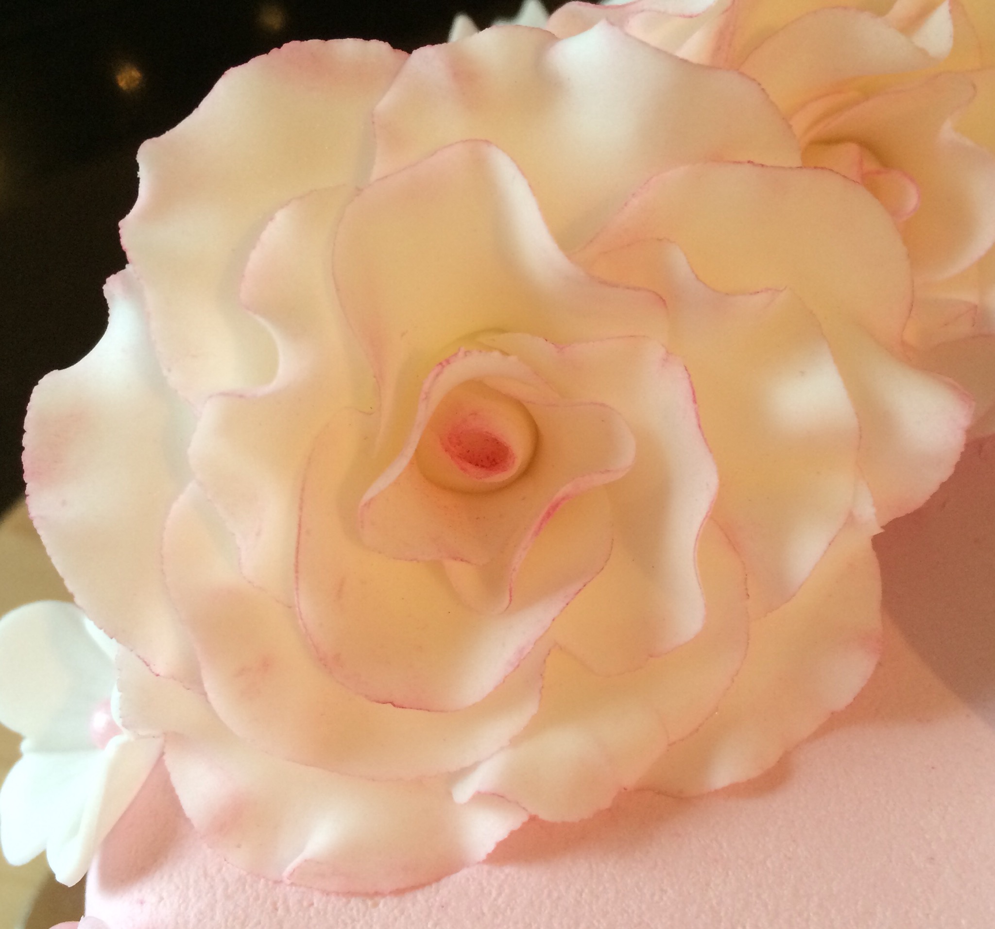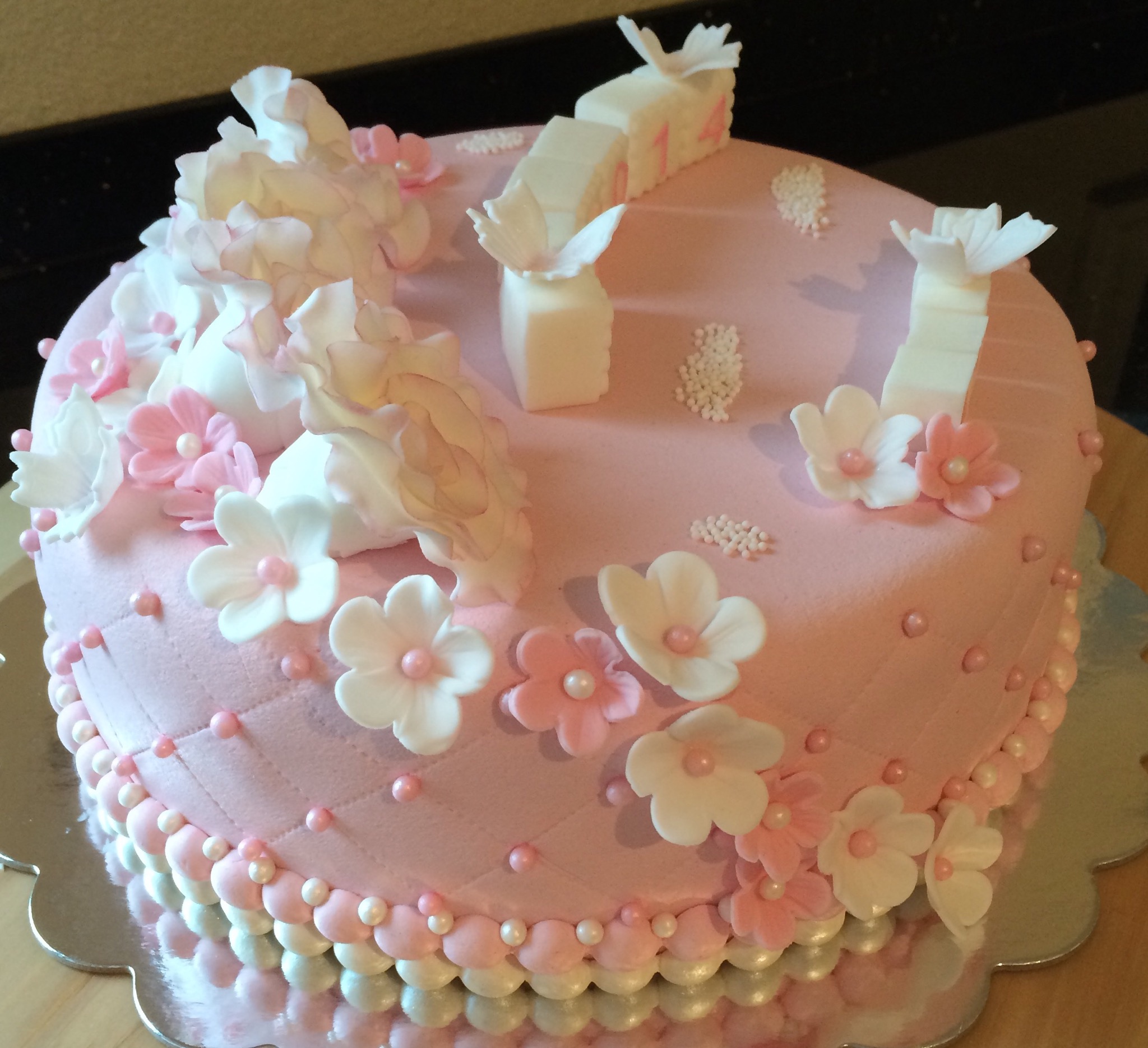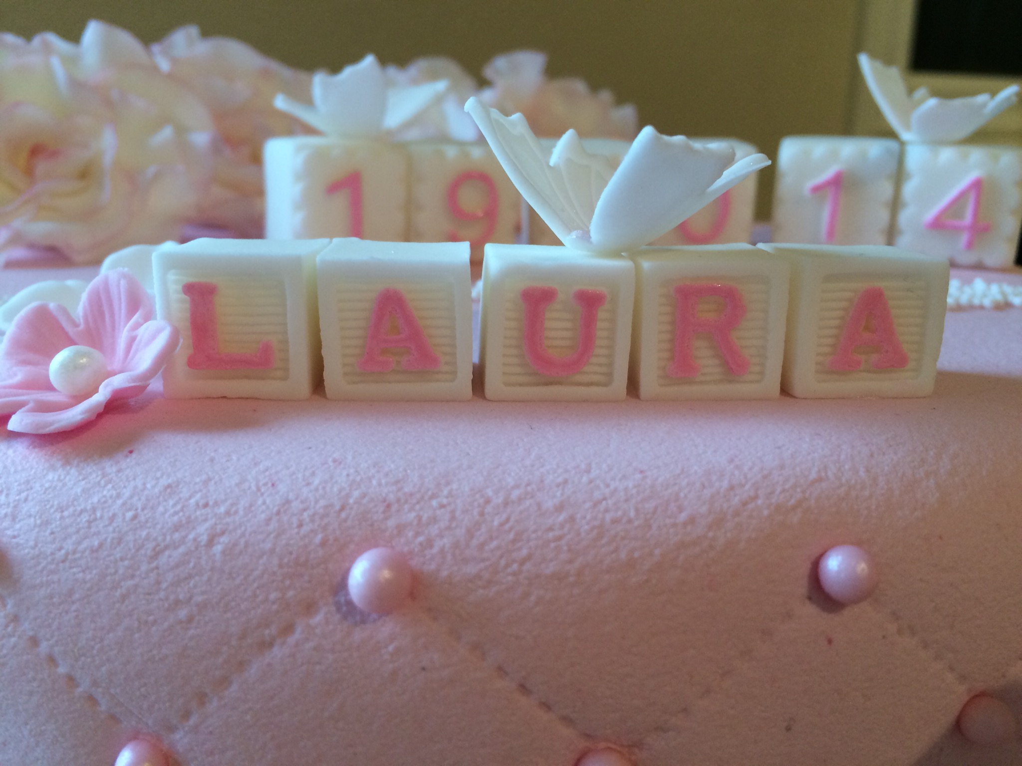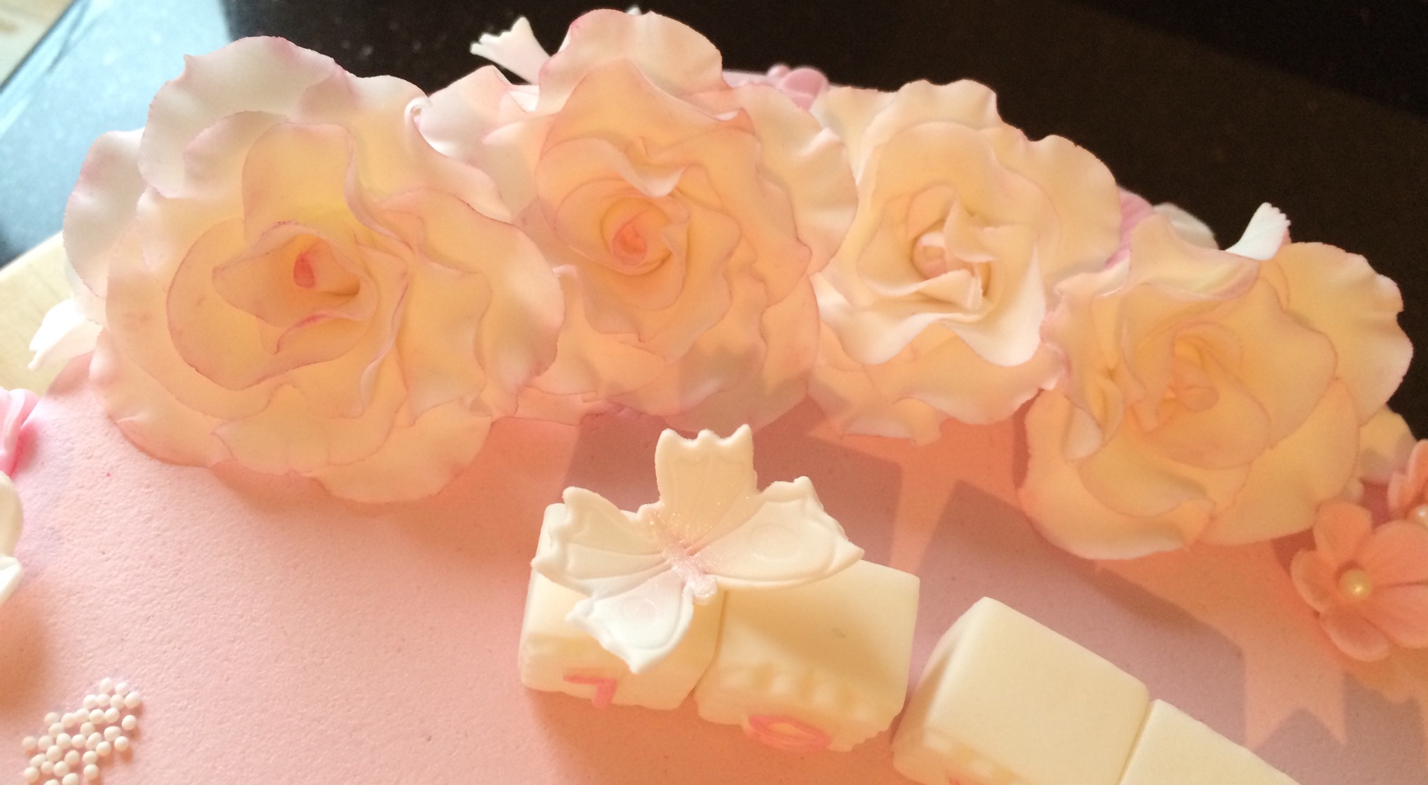 Utseendemessig er kaken deilig babyrosa, med hvit og rosa pynt. Pynten er dominert av hvite roser som jeg dustet med rosa for variasjonens skyld (synes også det gjorde dem mer «levende»), småblomster, noen sommerfugler, klosser til navn og dato, og litt perler. Feminint og søtt 🙂