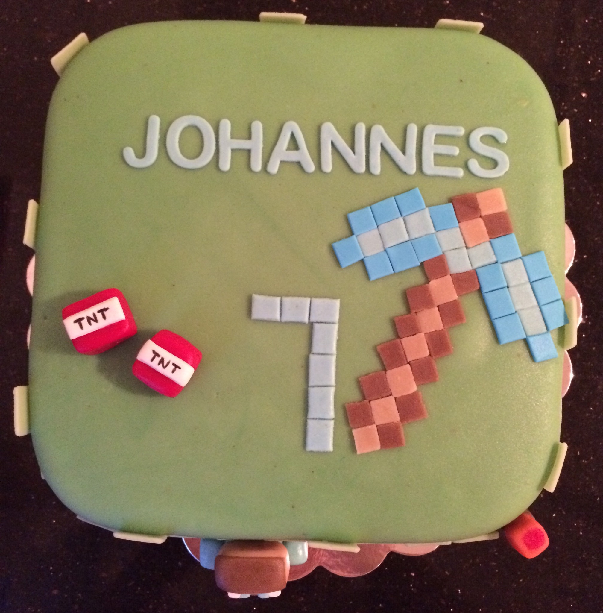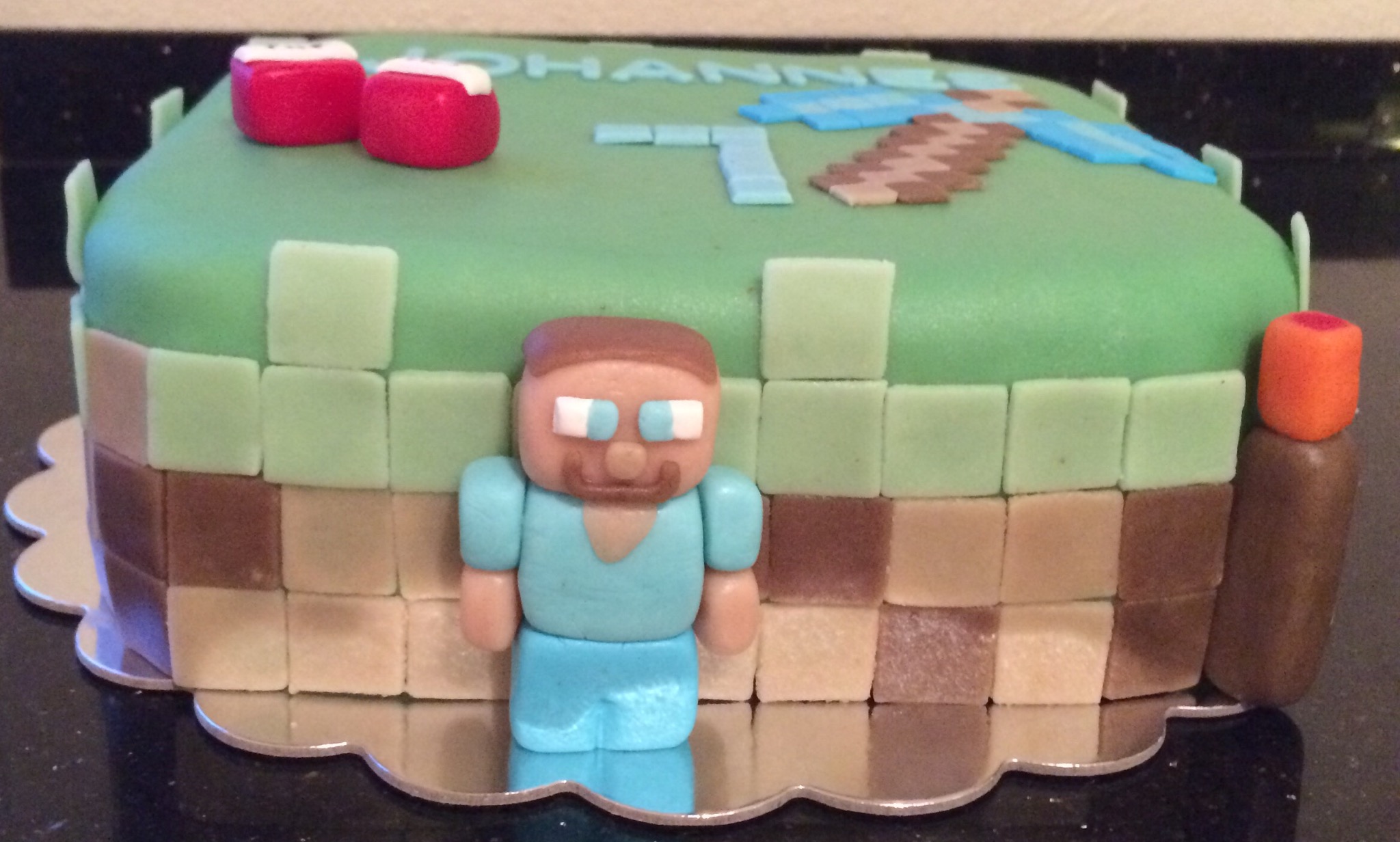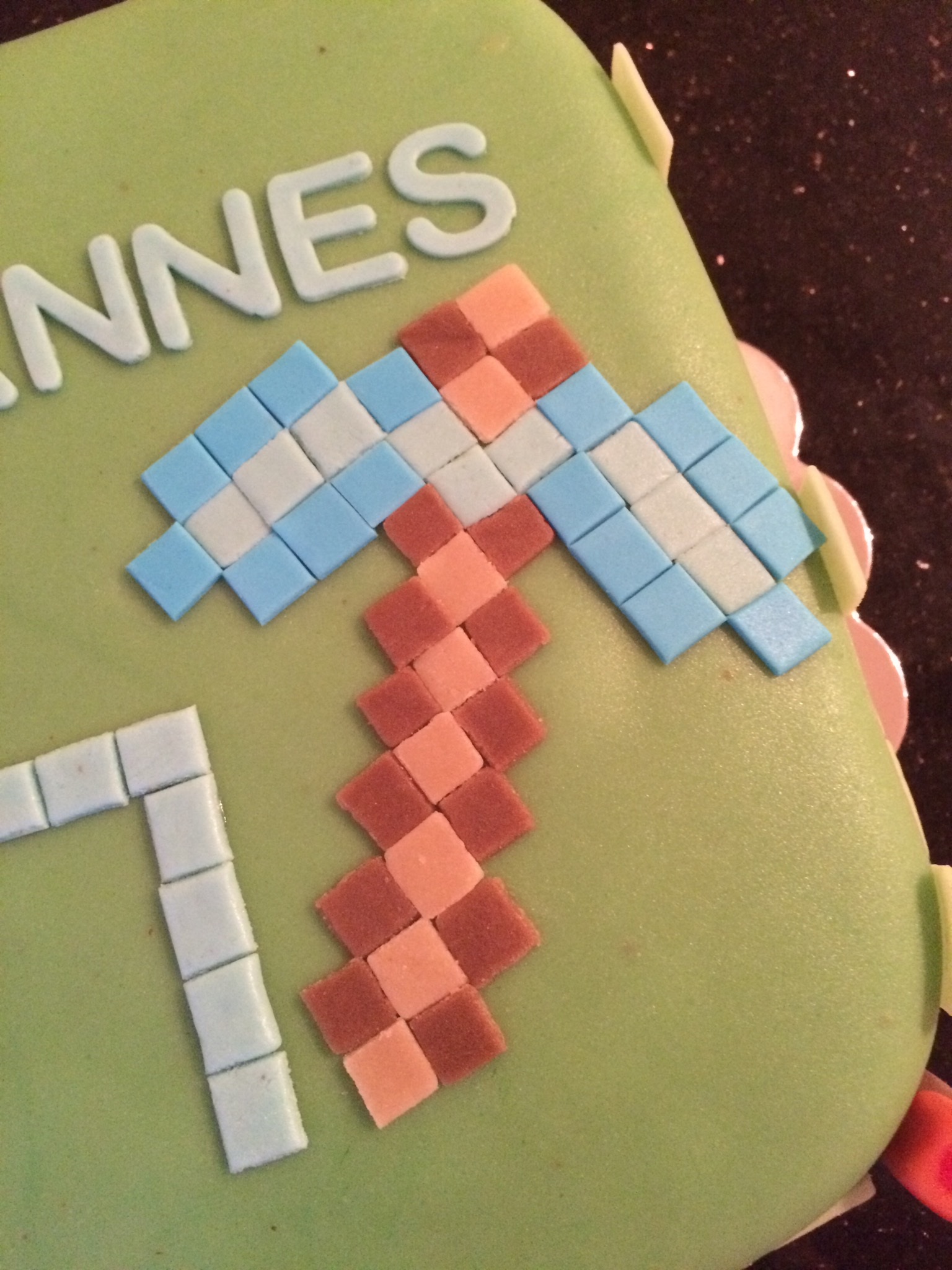 I dag har jeg laget bursdagskake til Johannes som fyller syv år. Utfordringen var å lage en kake med Minecraft-tema. Eeeh ja, jeg visste ikke hva Minecraft er. Jeg har aldri vært noen stor data- og tvspiller. Og det er faktisk ganske vanskelig å finne på et design når man ikke har peiling på hva det er snakk om. Google gir selvsagt mange bilder til inspirasjon, men når man ikke vet hvor viktig de ulike elementene er, er det litt gjettelek å velge det man vil fremheve. Men uten å vite helt hva jeg siktet etter, tror jeg at jeg ble fornøyd med resultatet 🙂