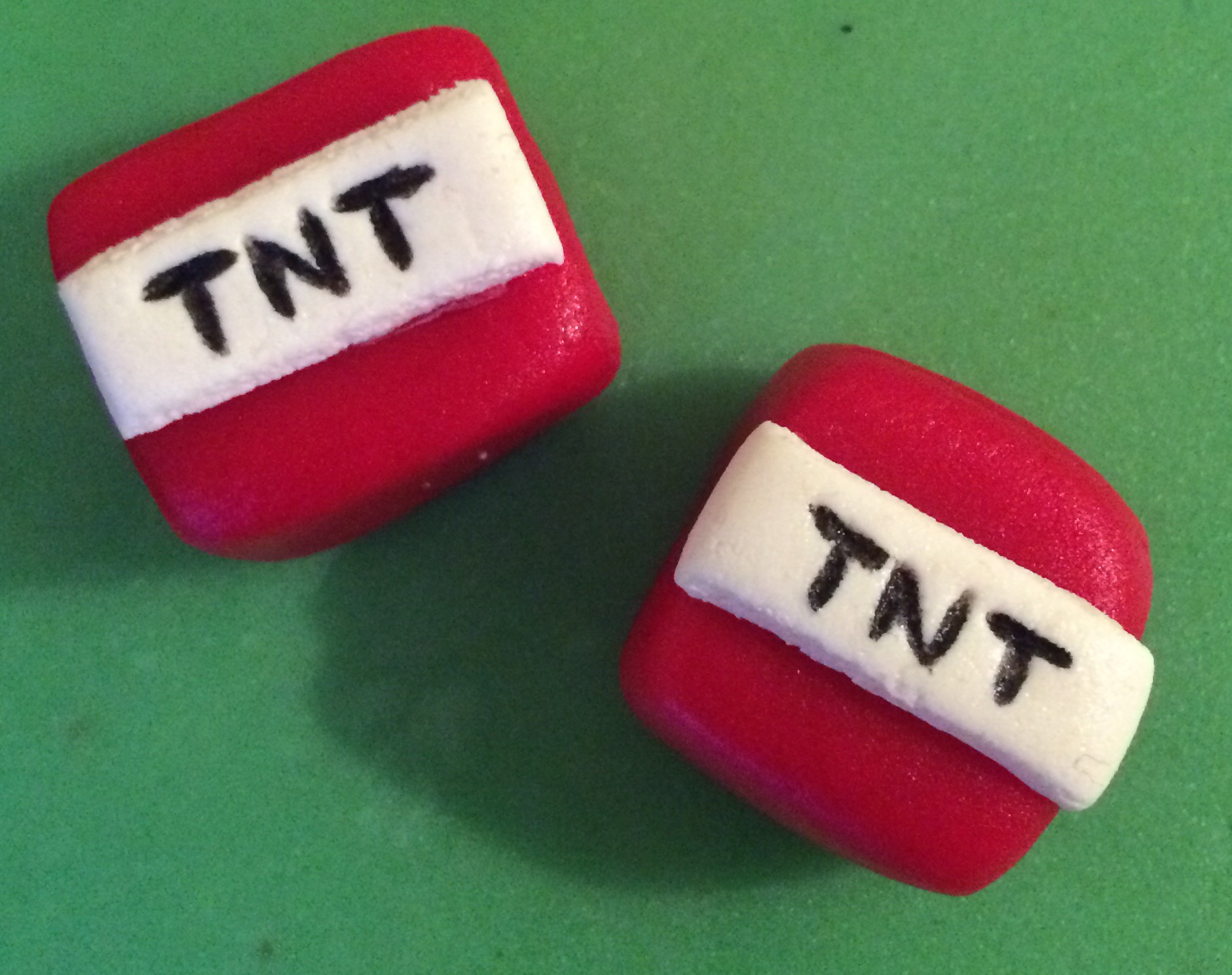 Når det gjelder utseende på kaken har jeg delvis latt meg inspirere av andre Minecraftkaker jeg fant på nett, delvis sett på bilder fra selve spillet, og til slutt «kvalitetssjekket» med min mann som er en spillgeek (sorry vennen). Man hører som barn at man blir firkantet i øynene av å se mye på tv. Det er løgn. Det man blir firkantet i øynene av er å lage Minecraftkaker med tilhørende (ingen overdrivelse) et par hundre firkanter. Utover hundrevis av firkanter er kaken pyntet med en pickaxe, tnt-bokser, en fakkel og en avatar (?) fra spillet.