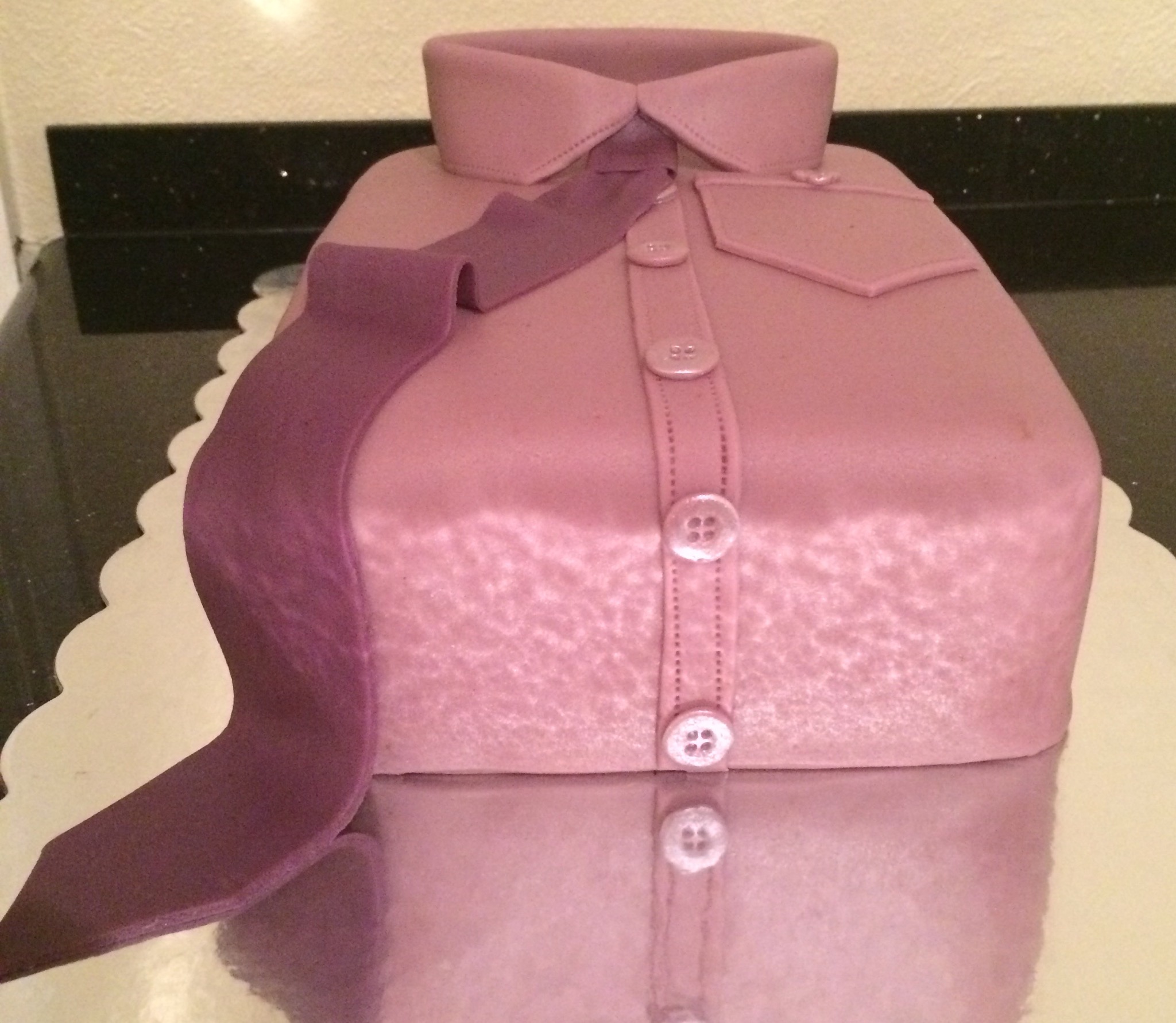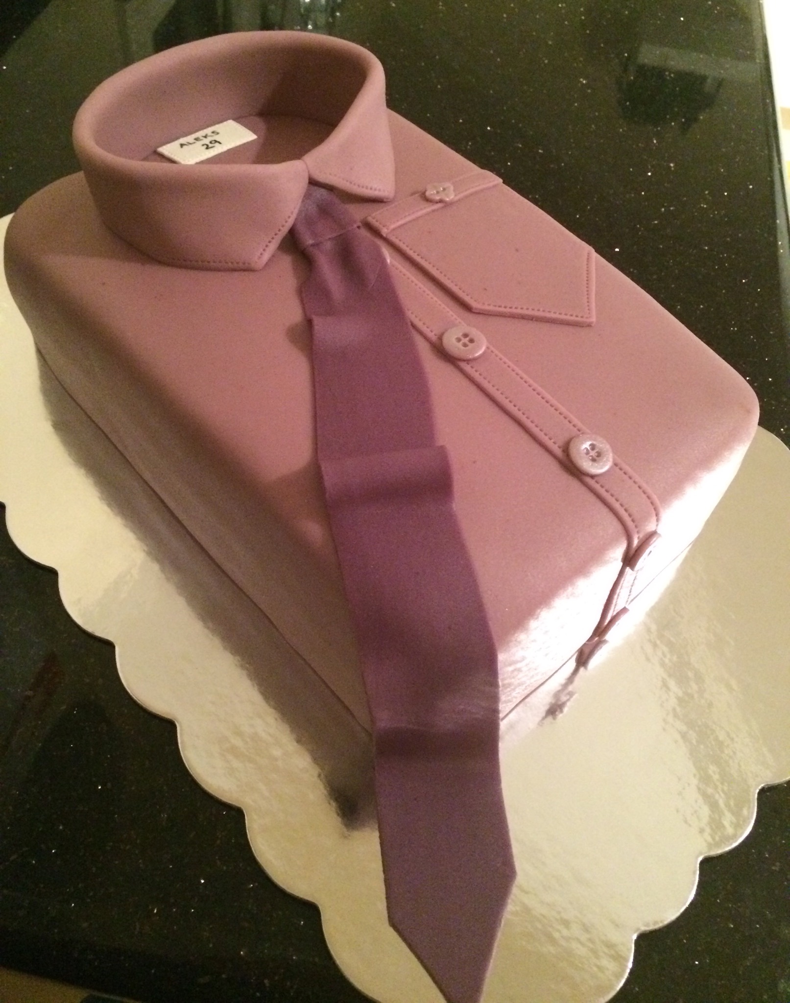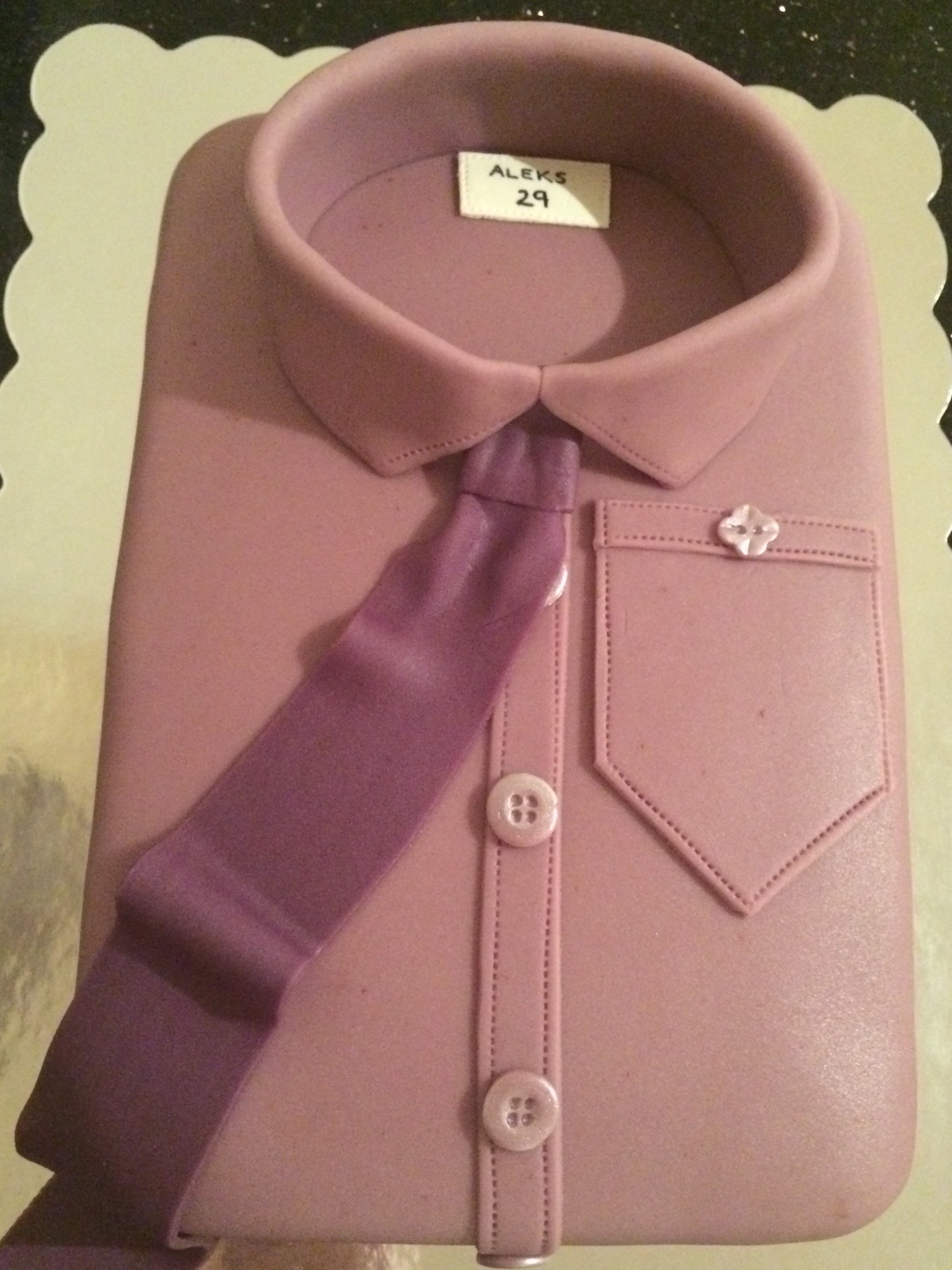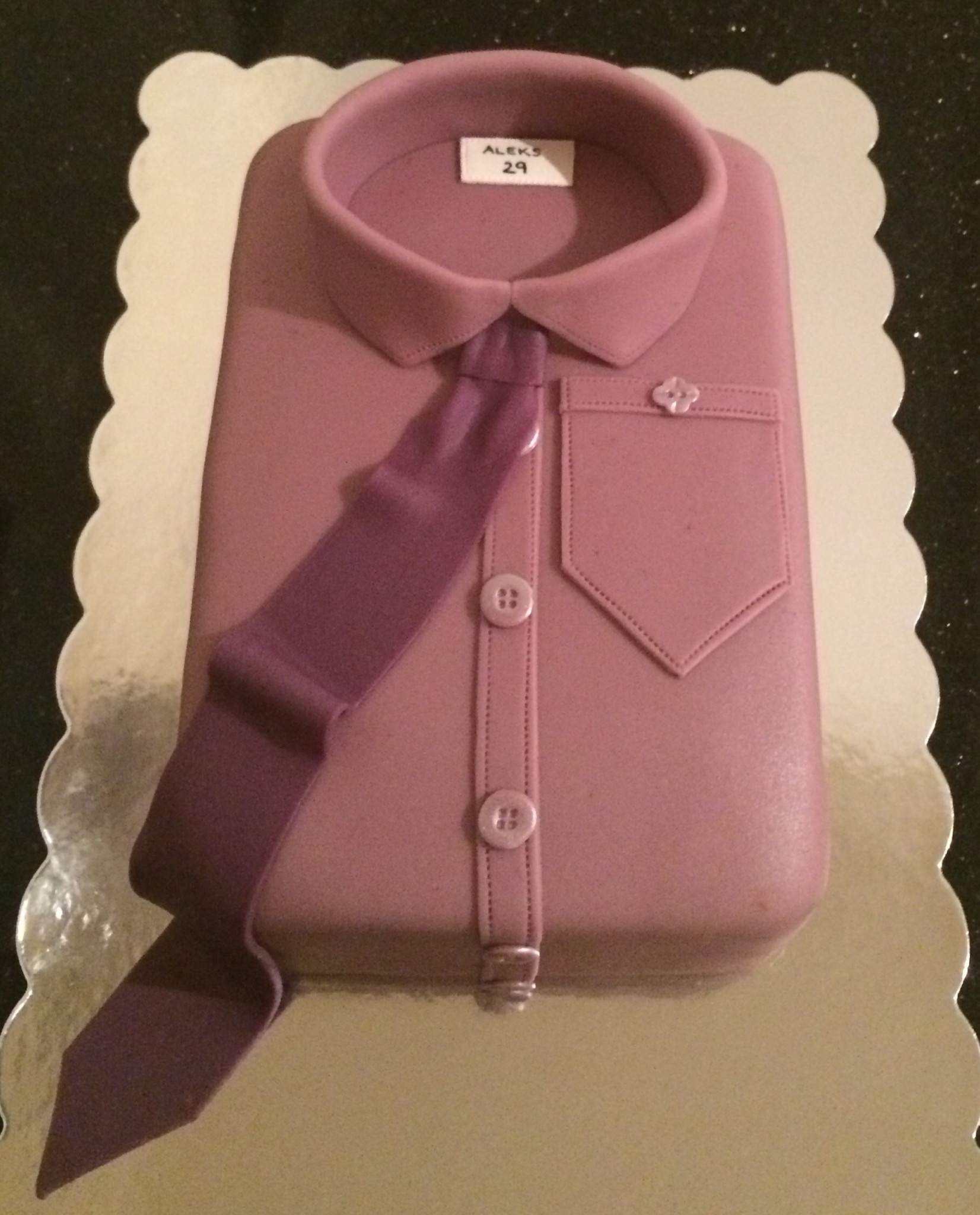 Designet her er ganske åpenbart. En pent sammenbrettet skjorte med slips. Knappene er laget i en silikonform og sprayet med perlemorskimmer, resten av detaljene er skåret ut for hånd. Sømmen er laget med et taggete skjærehjul. På en liten merkelapp i nakken står det Aleks 29, siden det er 29 år som feires i dag 🙂
