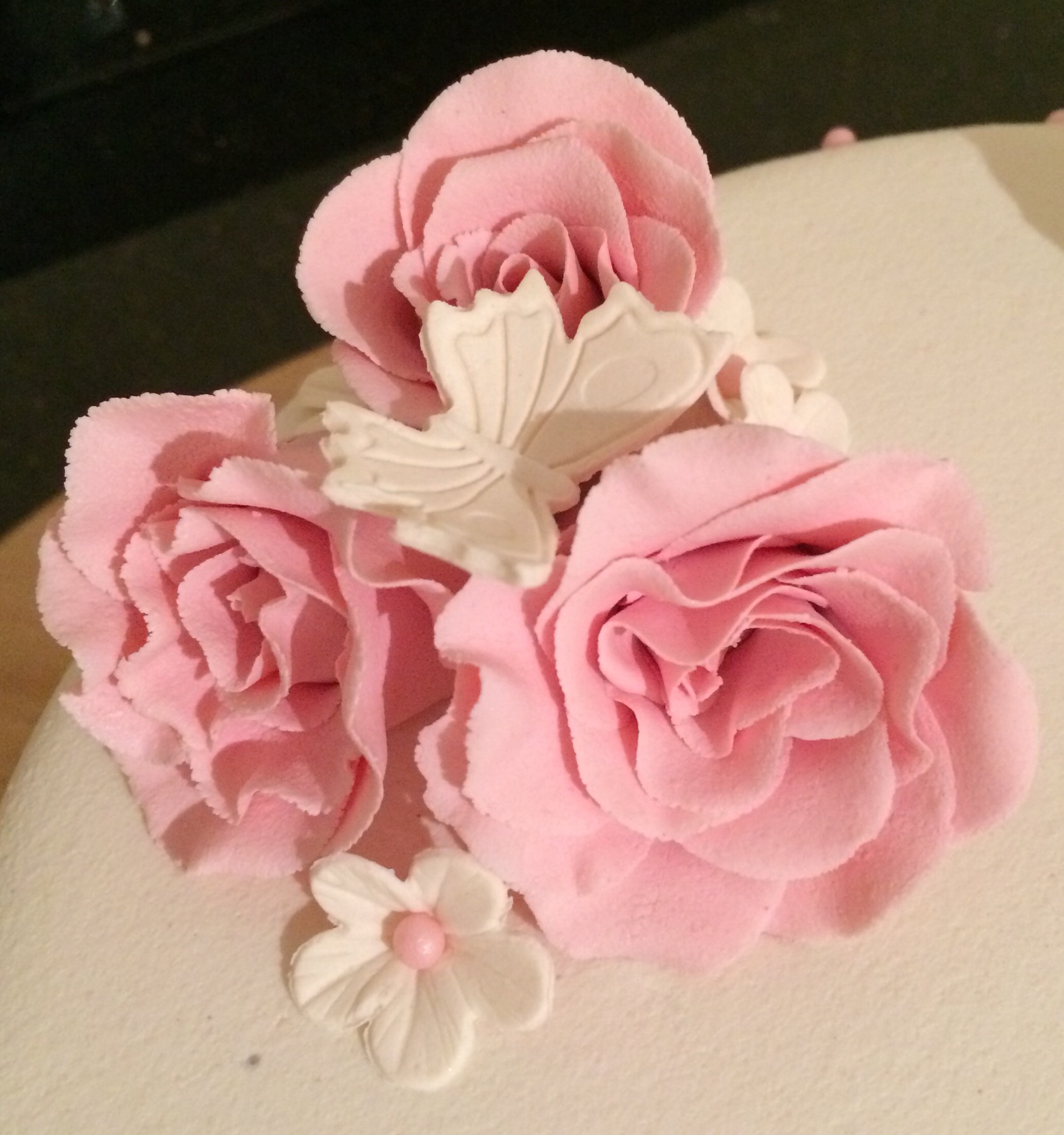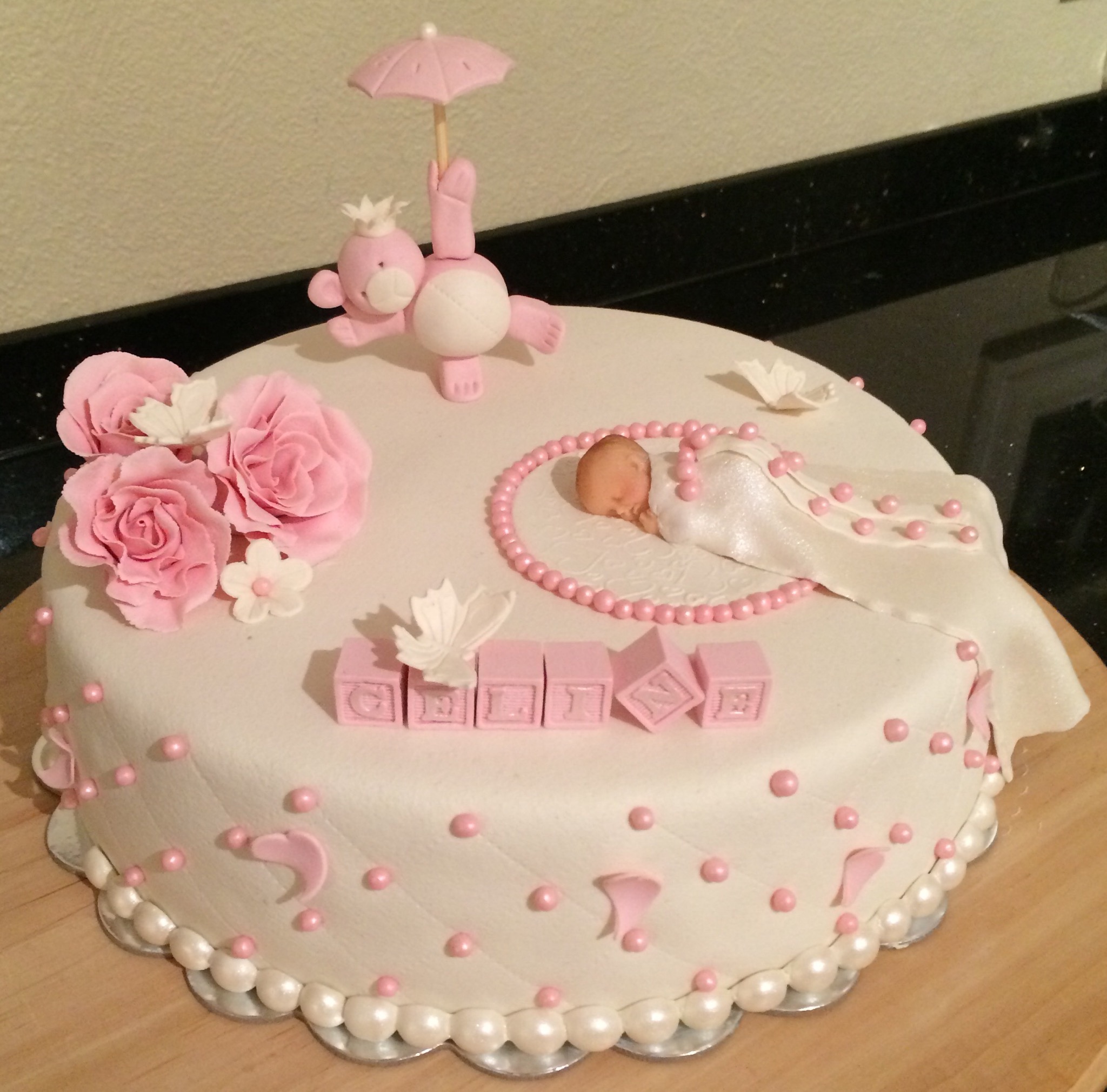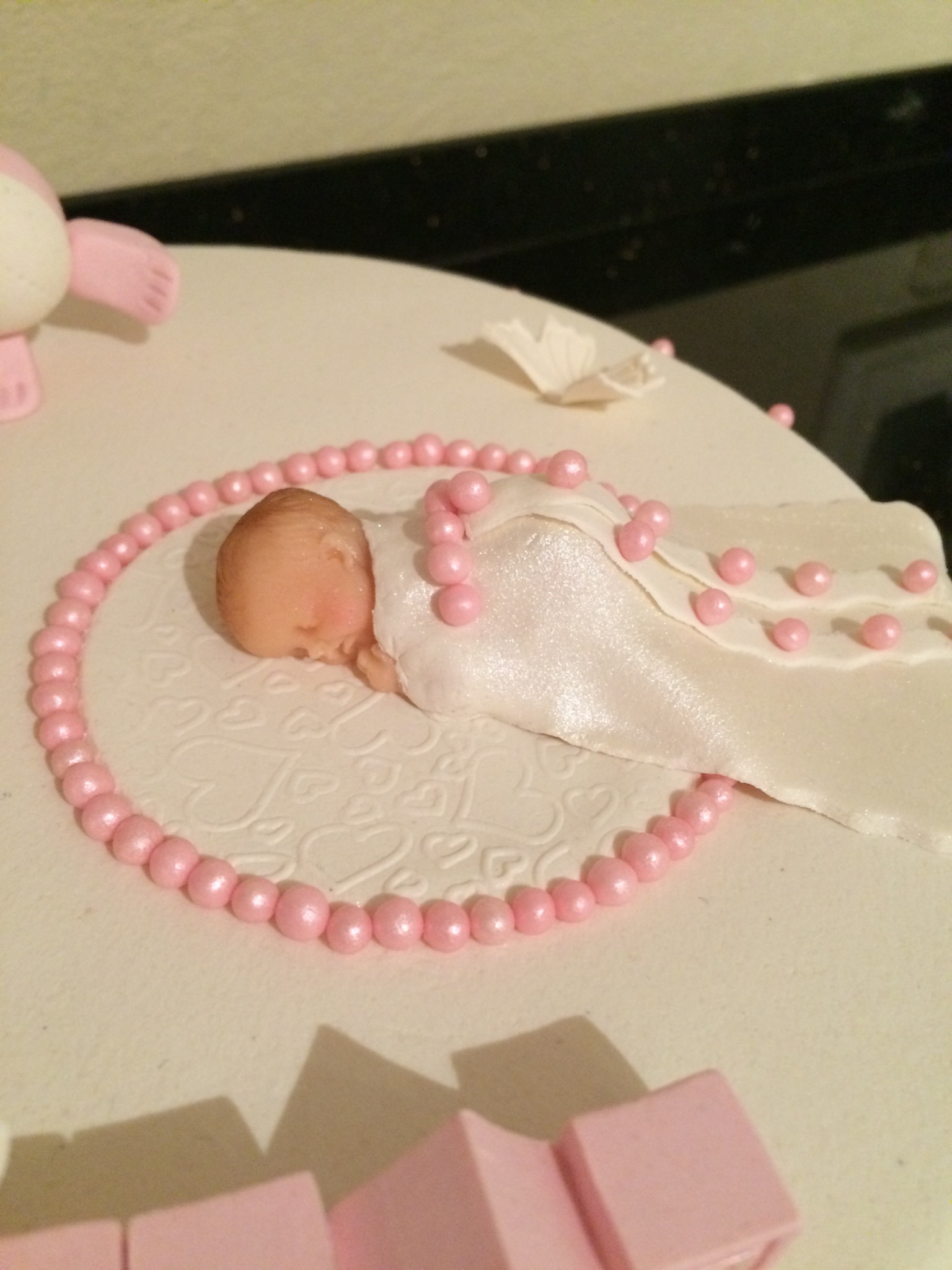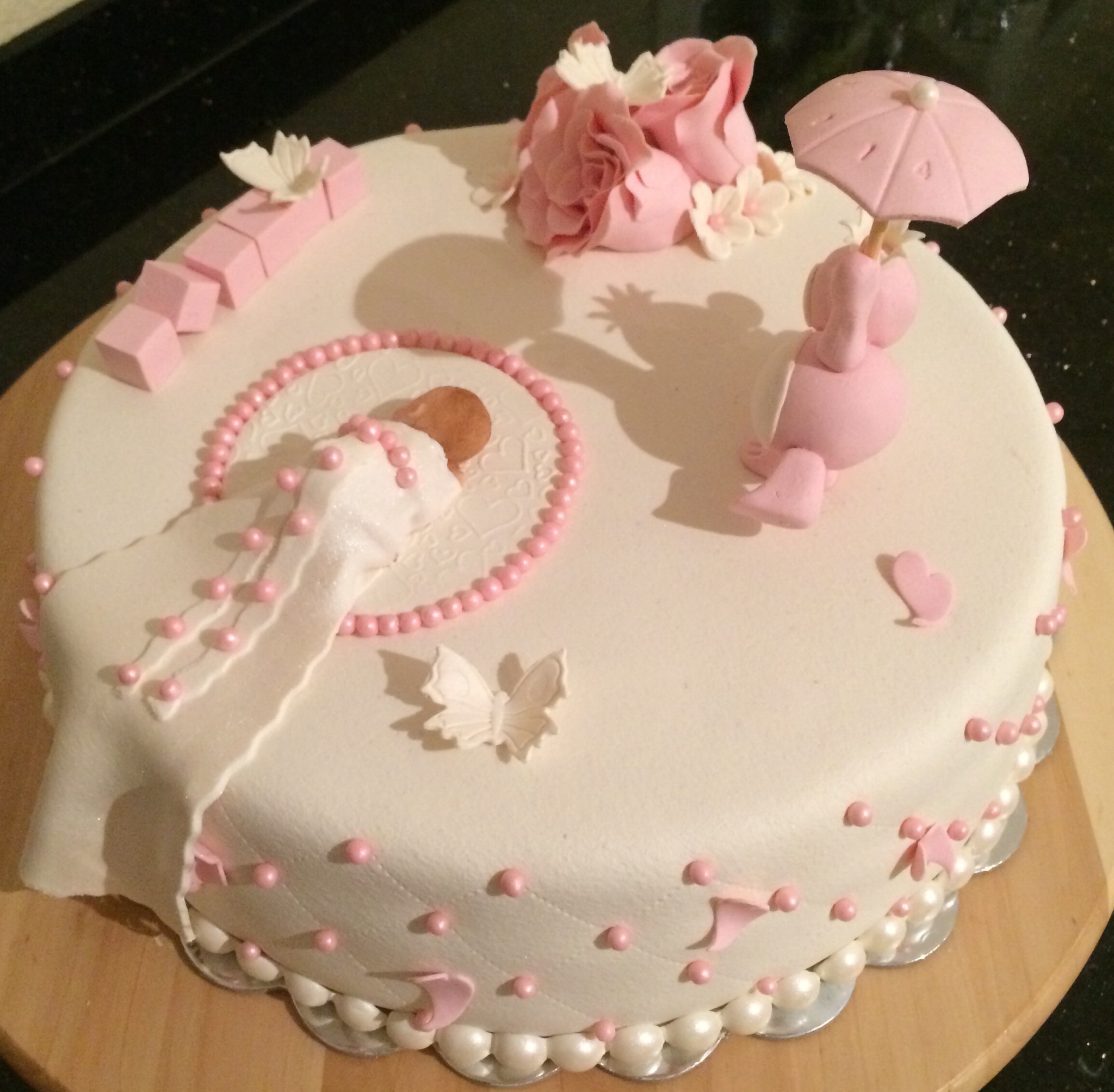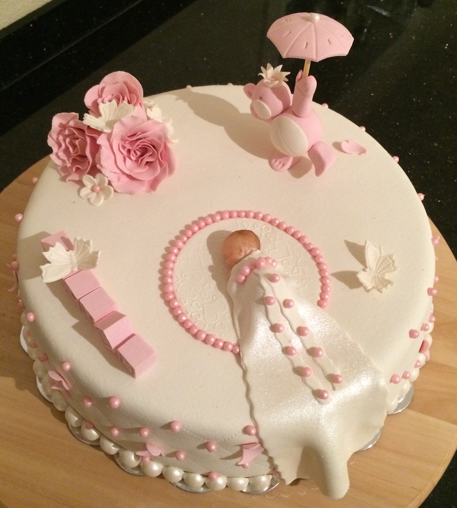 Søndagens andre dåpskake ble laget til lille Celine som også feires i dag. Mammaen hennes ønsket en kake liknende kaken jeg laget til Patrick en tid tilbake, men så klart i jentefarger. Og selvsagt kunne jeg lage det 🙂