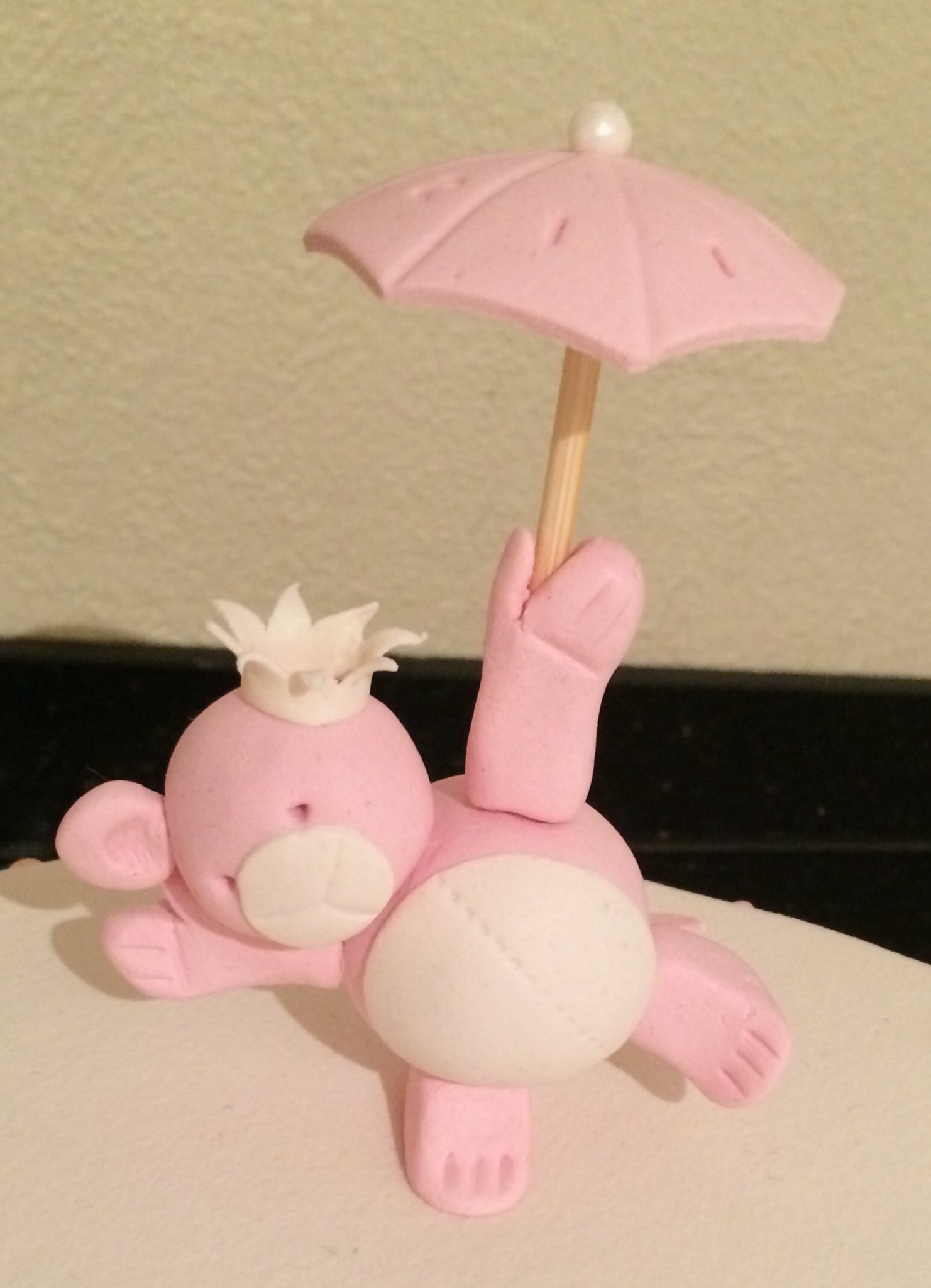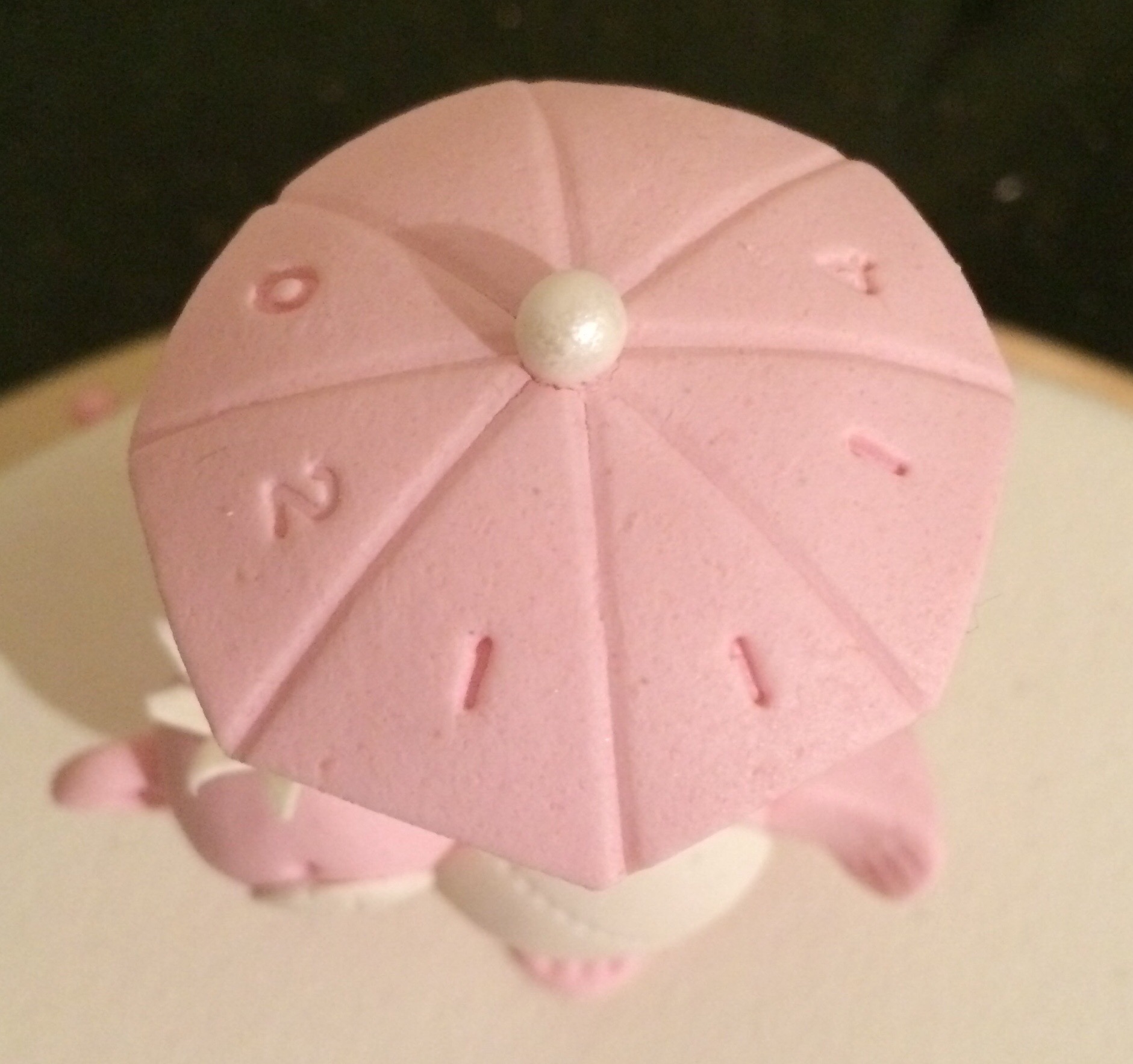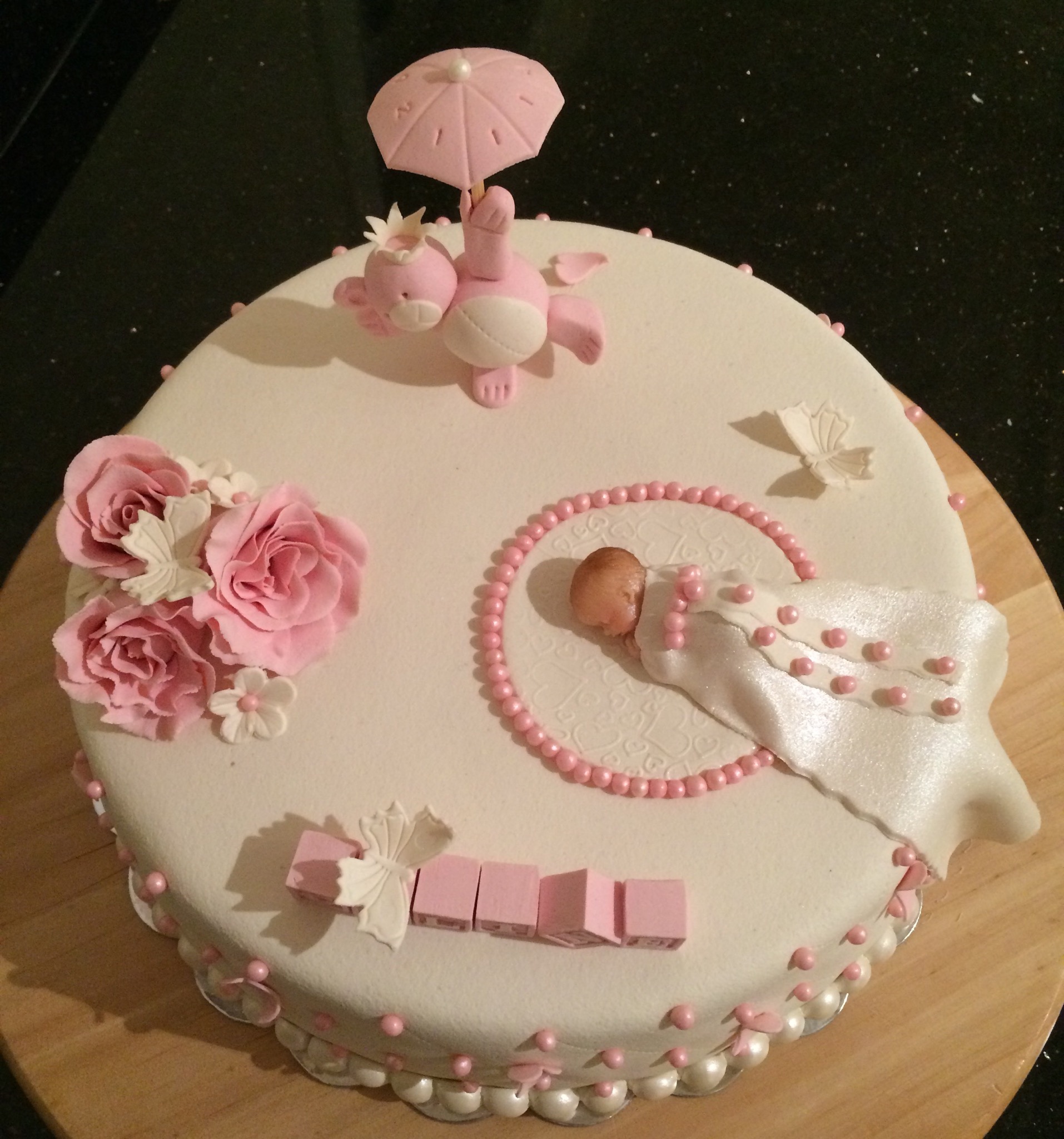 Kaken er pyntet med baby i dåpskjolen, en teddybjørn som holder en paraply preget med dagens dato, roser og småblomster, og ellers navneklosser, rutemønster og perler. Jeg er en skikkelig sucker for pasteller og perler 😉 Her kommer noen bilder: