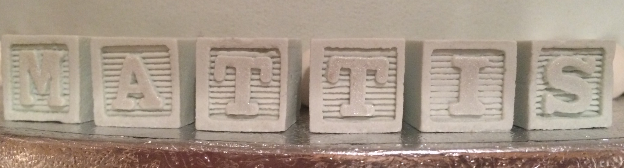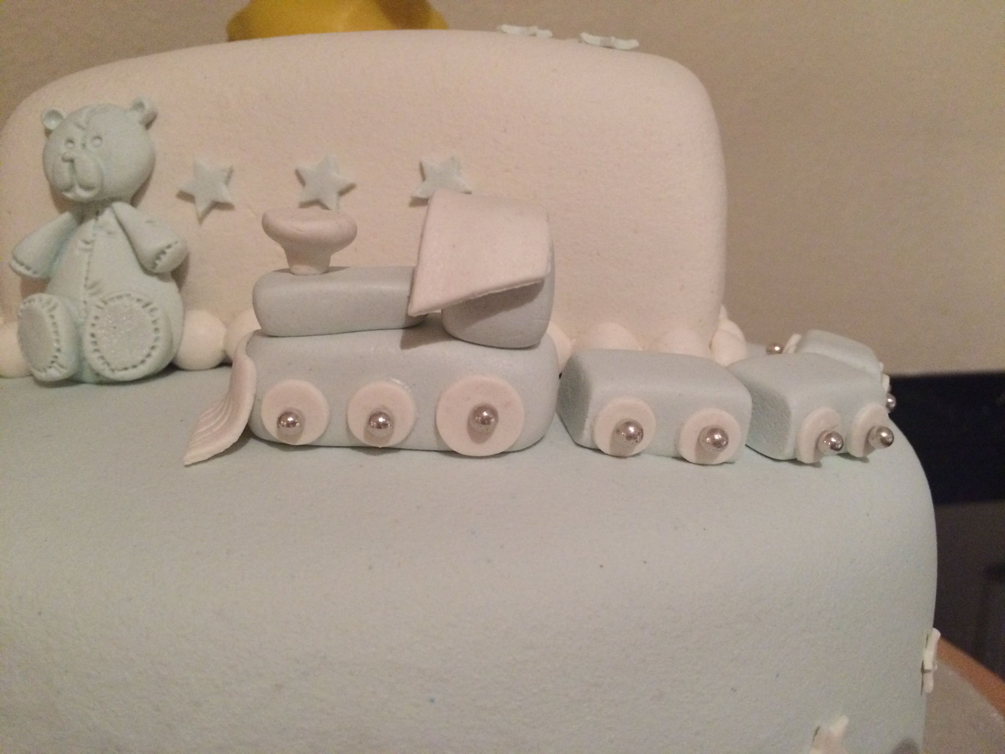Designmessig tok jeg utgangspunkt i bildet av den ønskede kaken, som hadde et lite tog, navneklosser og stjerner. Så jeg laget dette, samt badeanden på toppen i knallgul marsipan. Veldig kjekt med nye utfordringer på modelleringsfronten 🙂