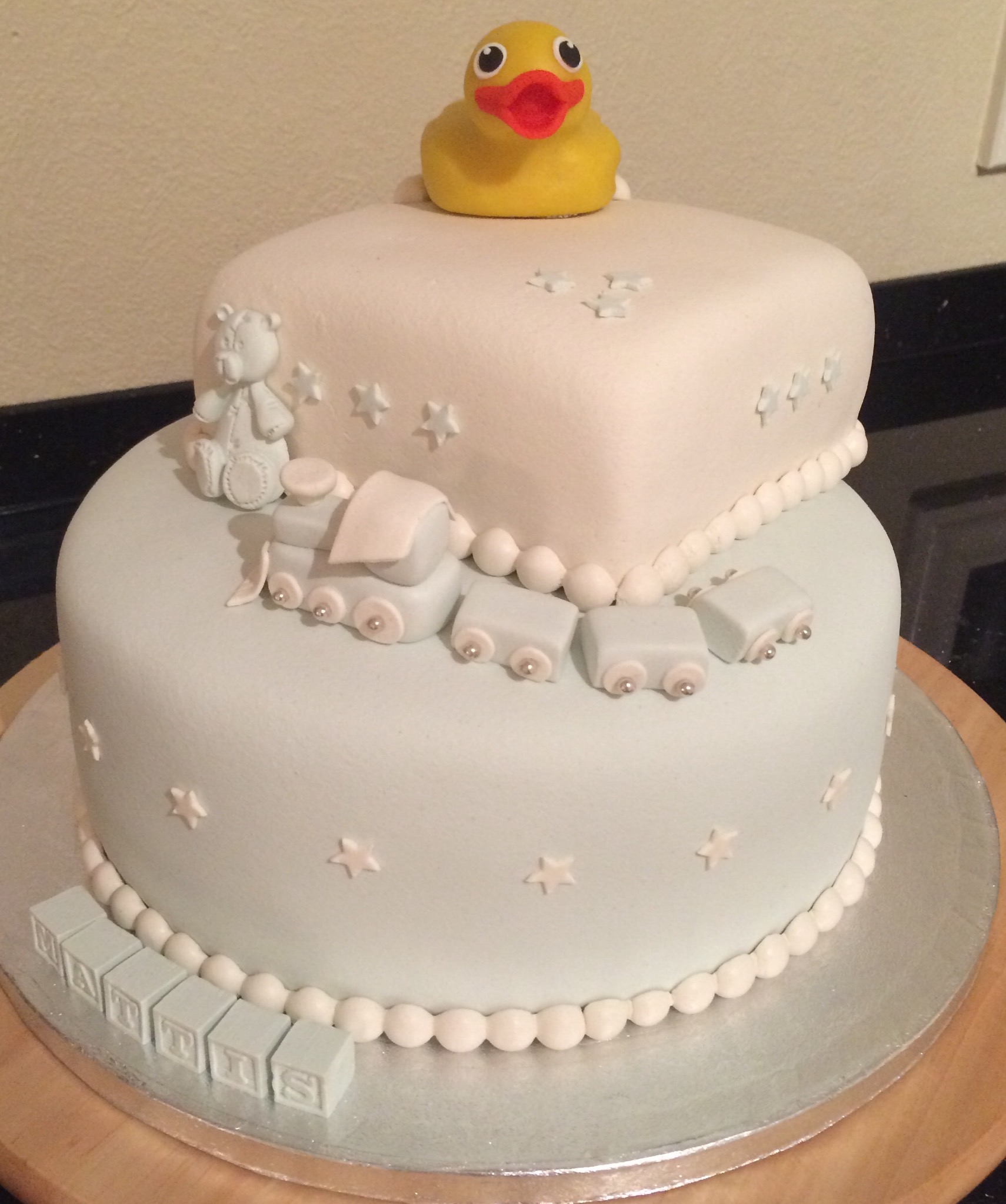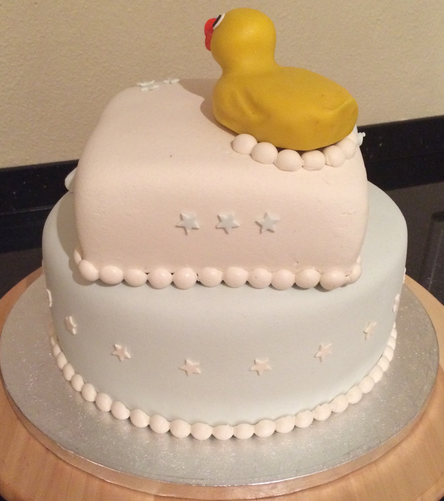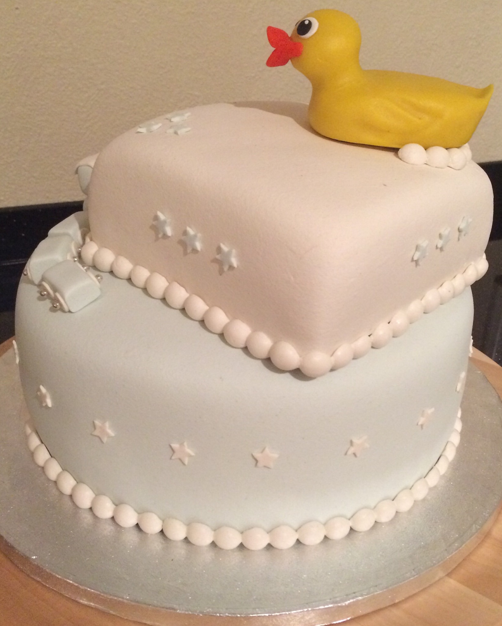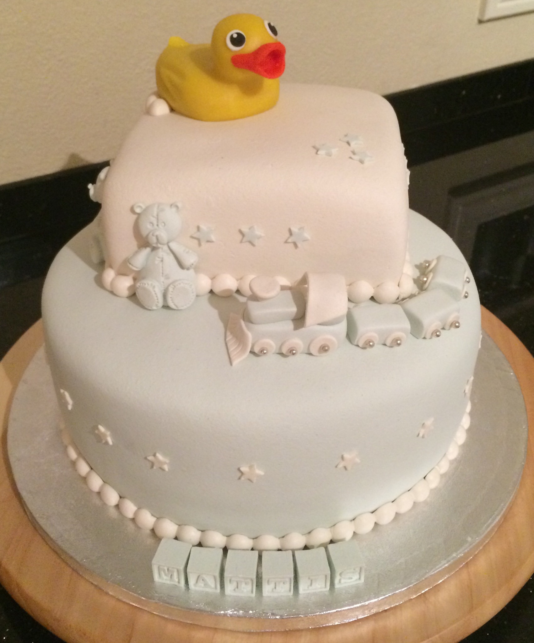 Nå kommer noen innlegg som perler på en snor om helgens kaker. Først ut var en kake til navnefest for lille Mattis. Mammaen hans hadde et bilde av kaken hun ønsket seg, funnet på Passion4vintage. Hun hadde også lyst på en knallgul badeand på toppen som kontrast til den ellers duse kaken. Som sagt så gjort!