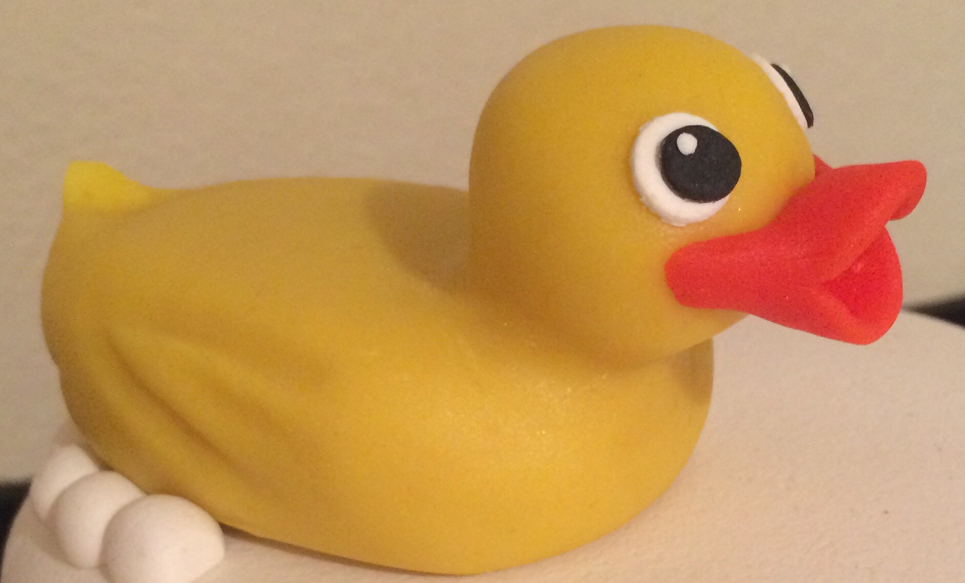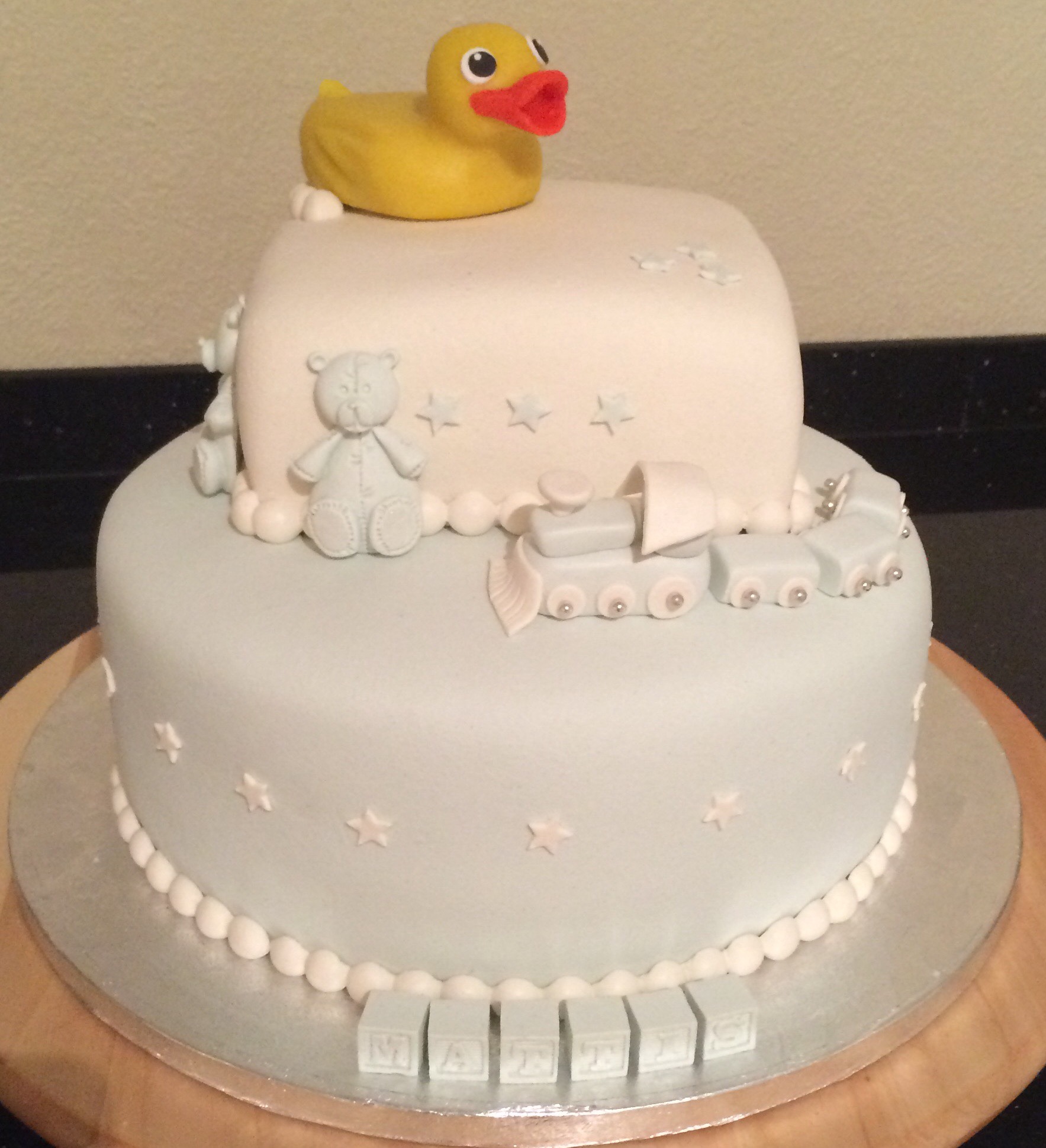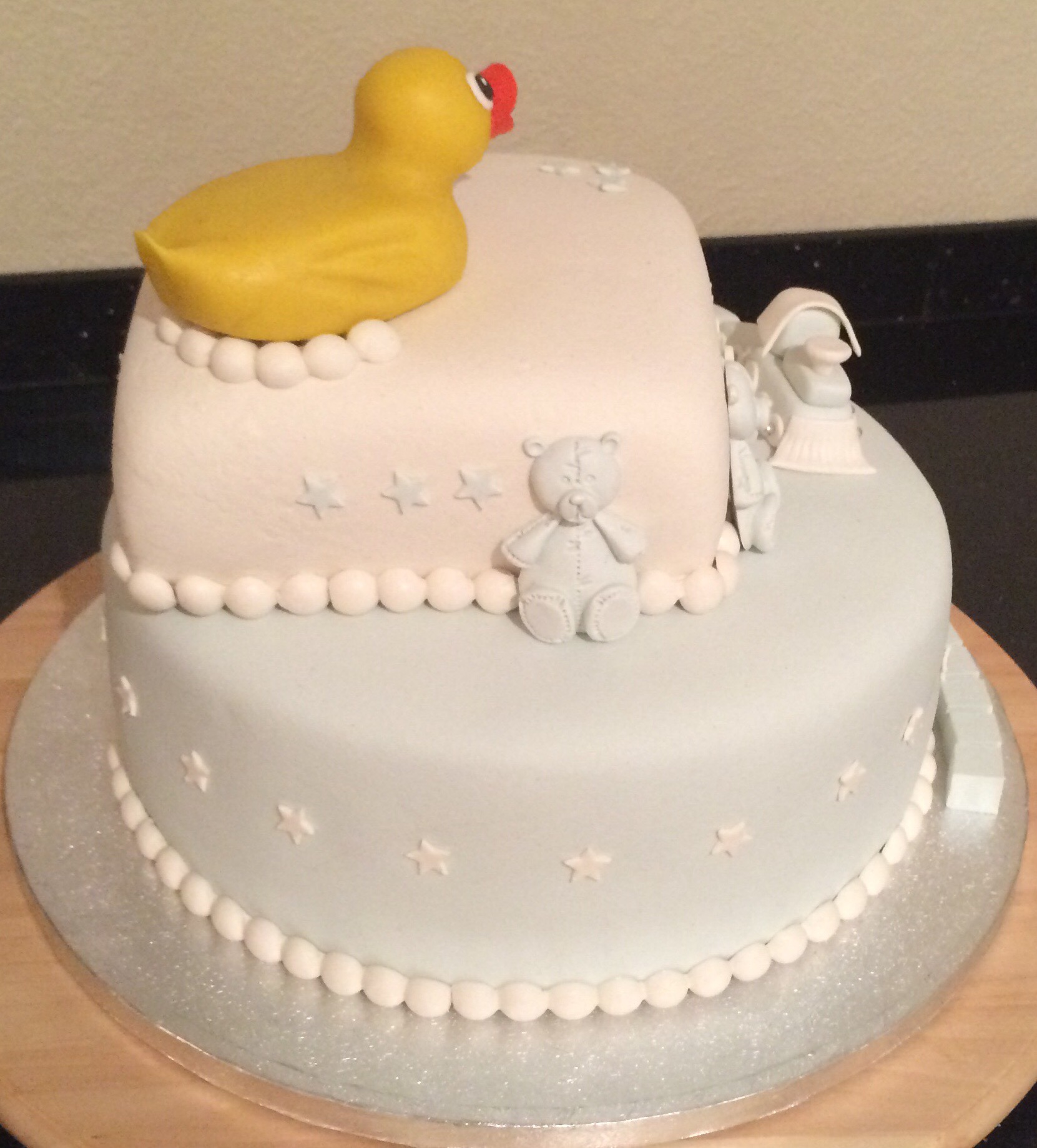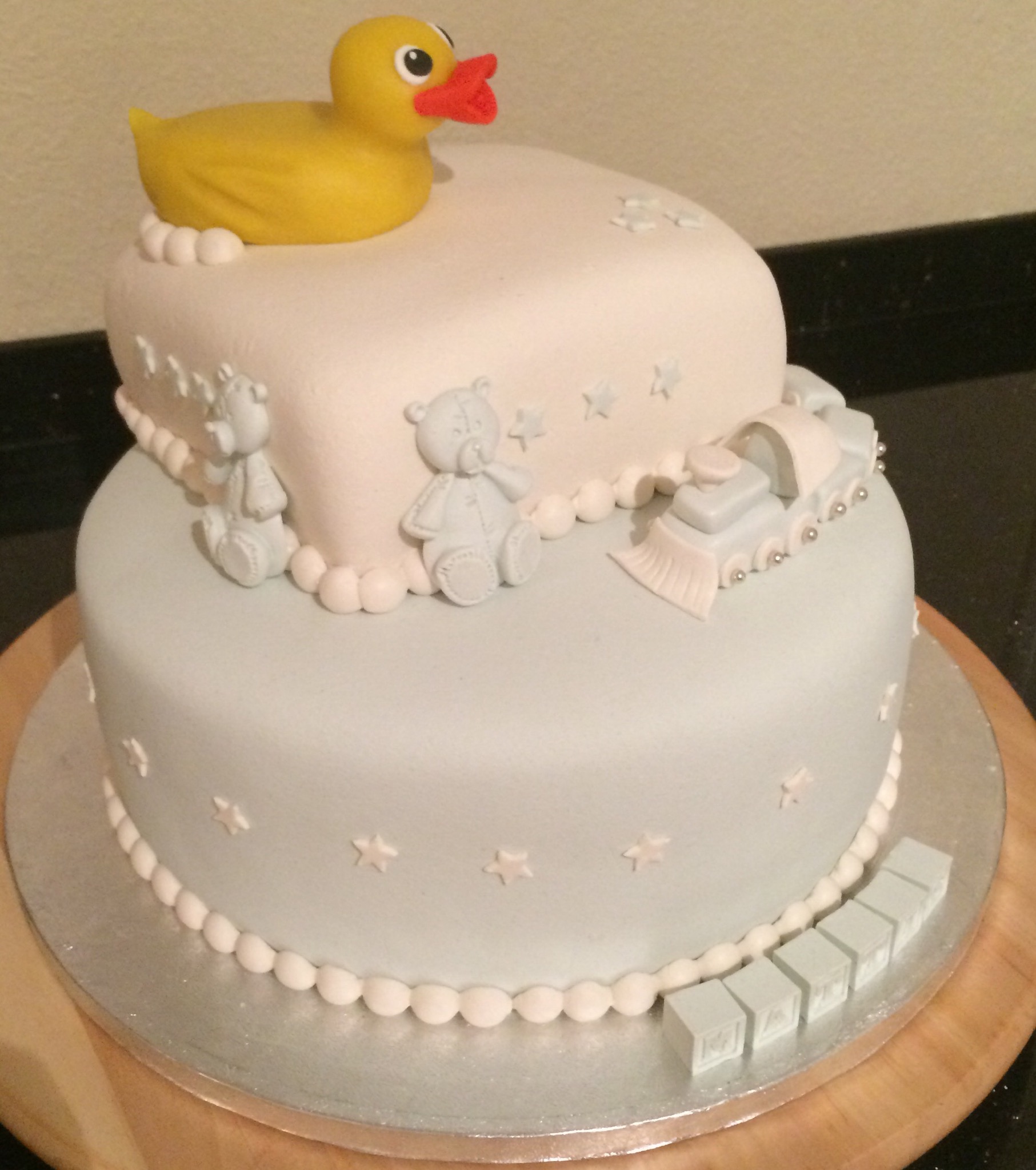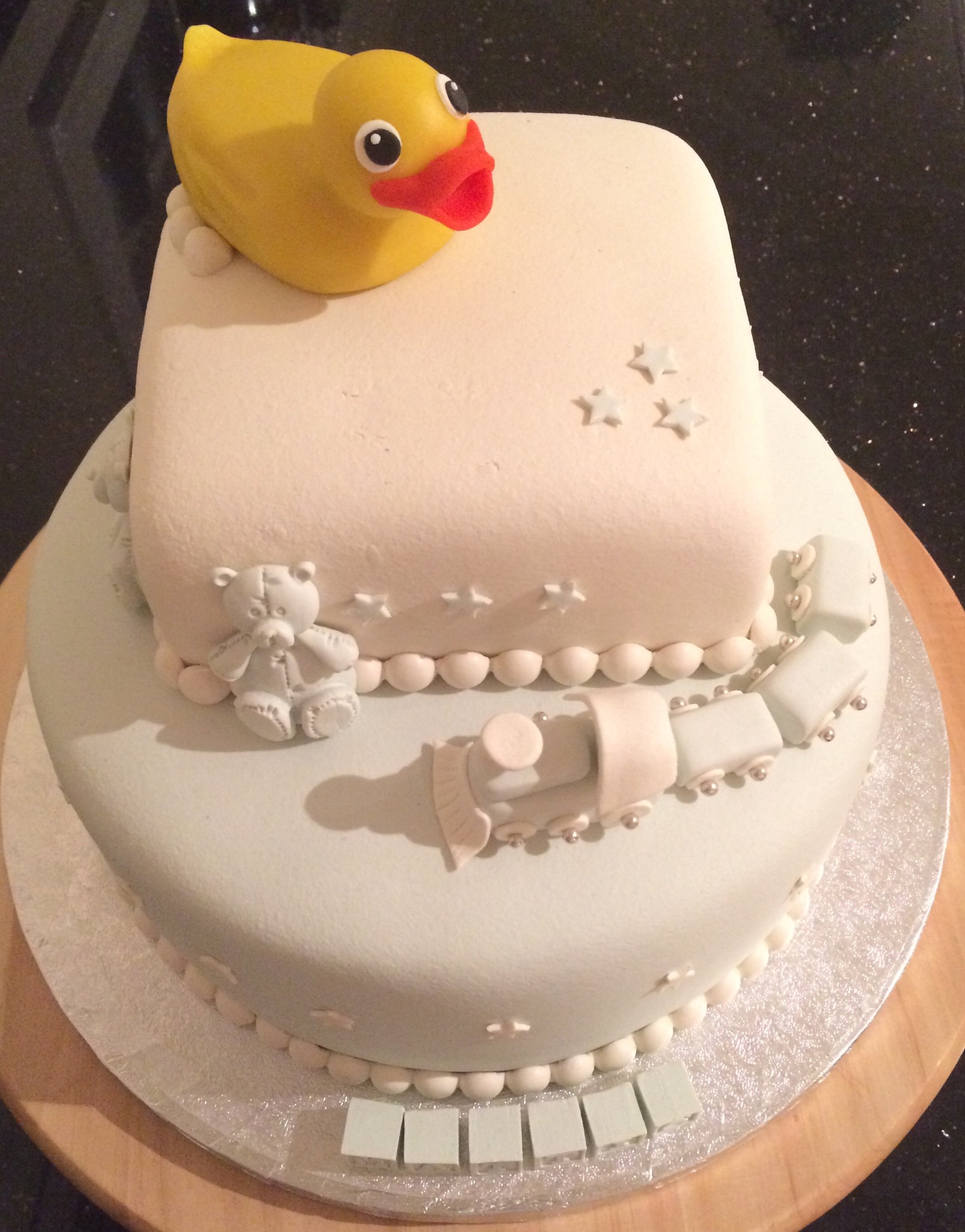 Nå kommer noen innlegg som perler på en snor om helgens kaker. Først ut var en kake til navnefest for lille Mattis. Mammaen hans hadde et bilde av kaken hun ønsket seg, funnet på Passion4vintage. Hun hadde også lyst på en knallgul badeand på toppen som kontrast til den ellers duse kaken. Som sagt så gjort!