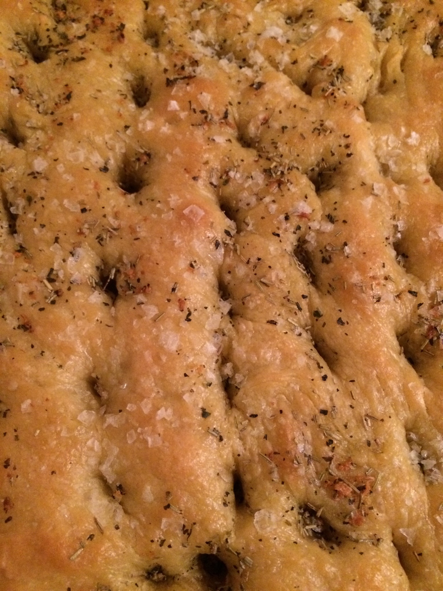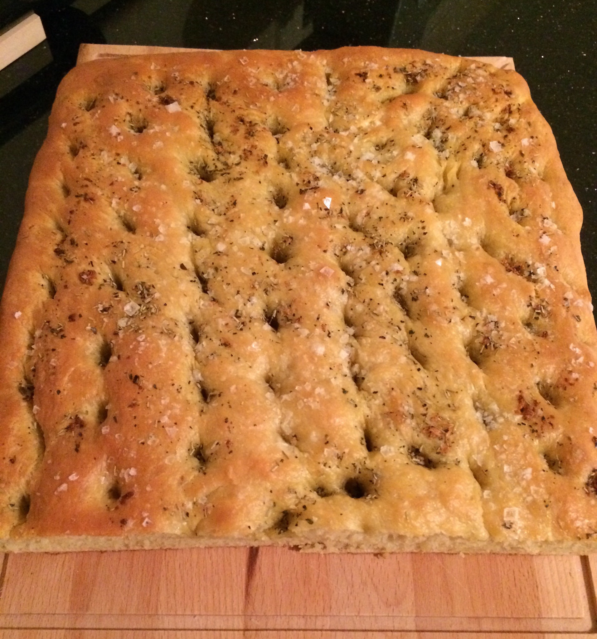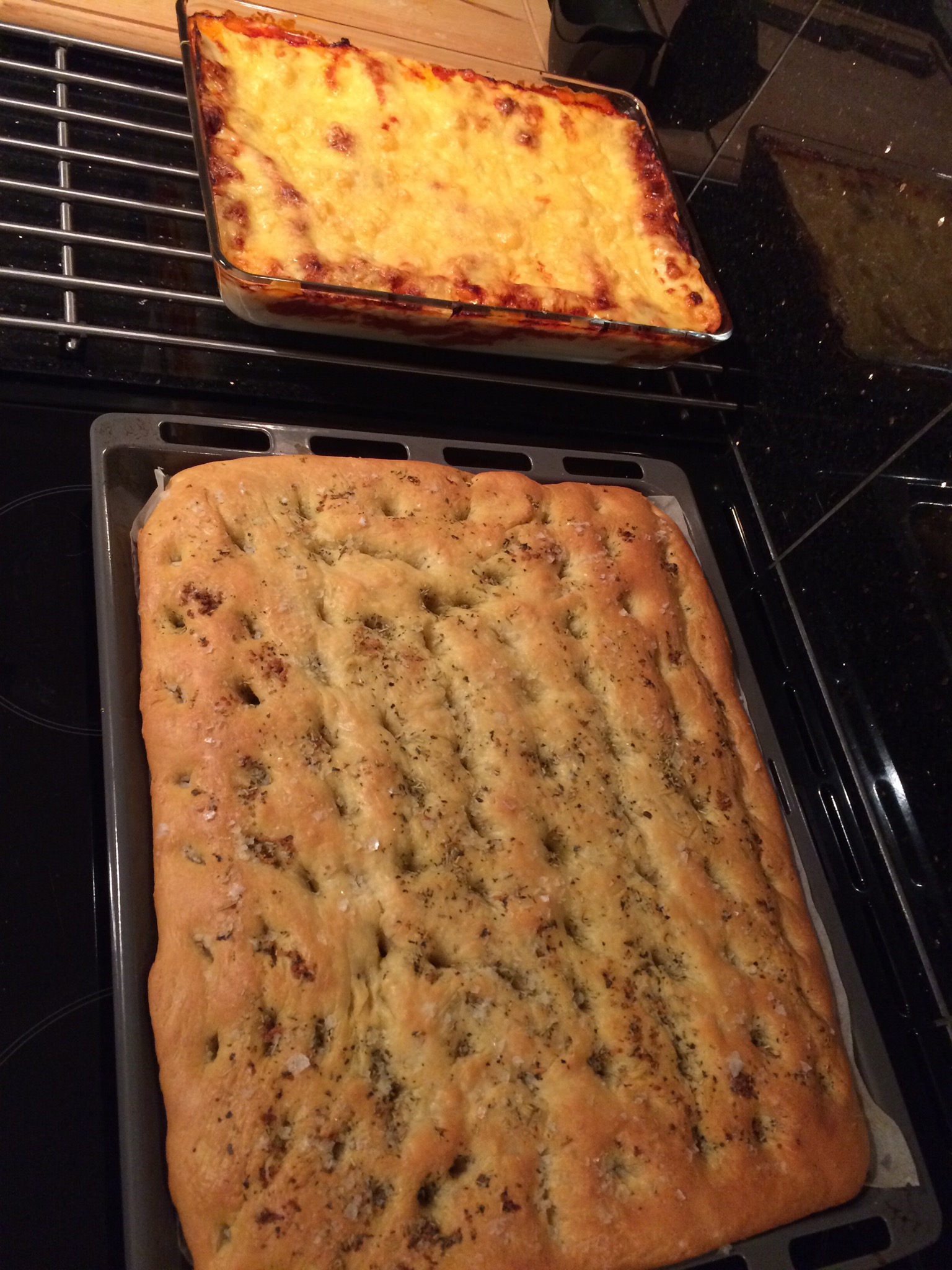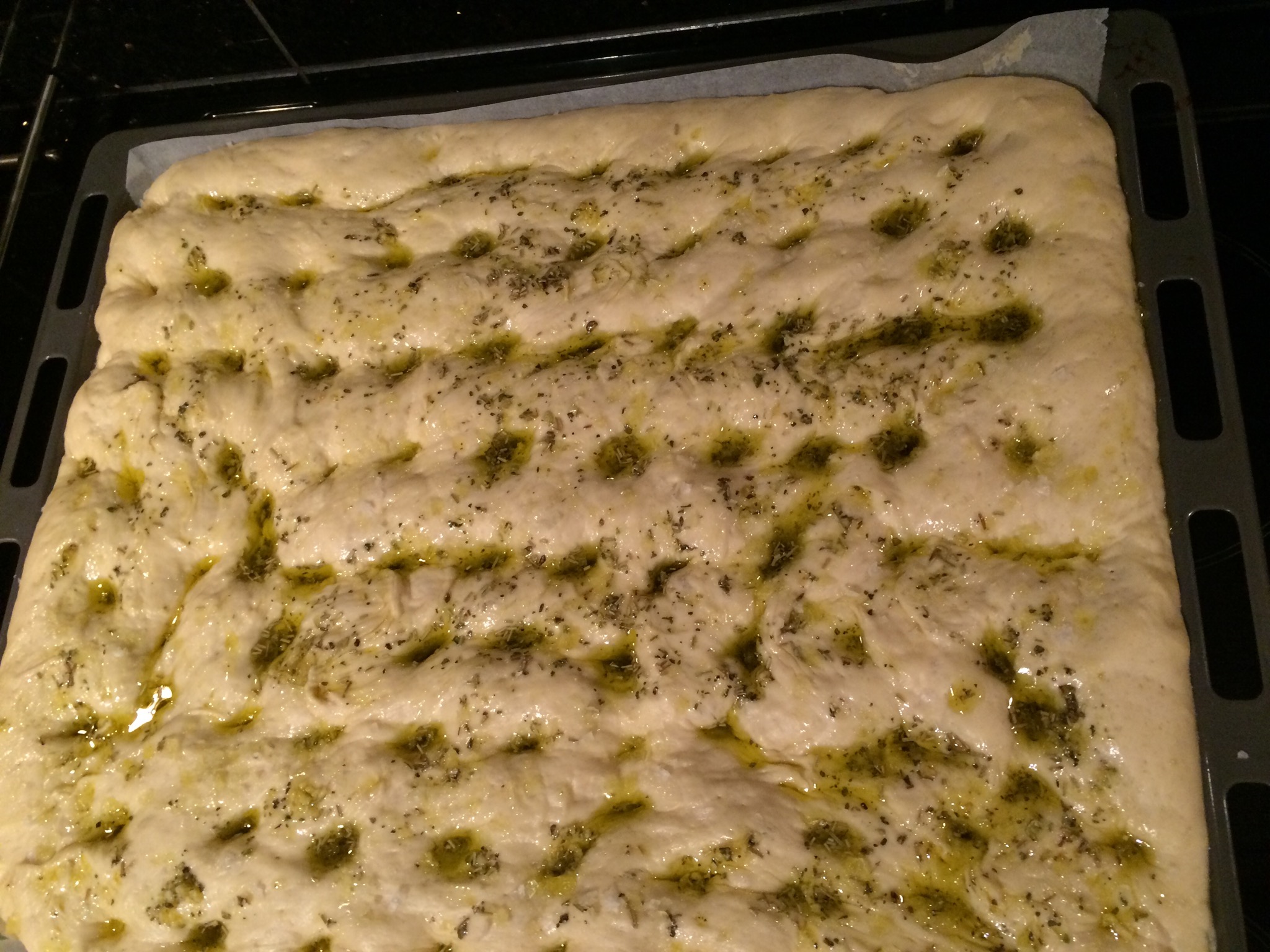Ikke bare kaker som forlater kjøkkenet her i huset. I går laget jeg en stor porsjon deilig foccacia. Jeg ELSKER foccacia! Oljen, krydderet, saltet – perfekt! Som tidligere skrevet har jeg veldig begrenset tålmodighet til gjærbakst og tilhørende klin, så foccacia er helt supert, rett fra bakebollen til stekebrettet uten noe knaing og kliss. Og ikke ulevelig lang hevetid heller 😉 Jeg brukte denne oppskriften fra Trines matblogg: