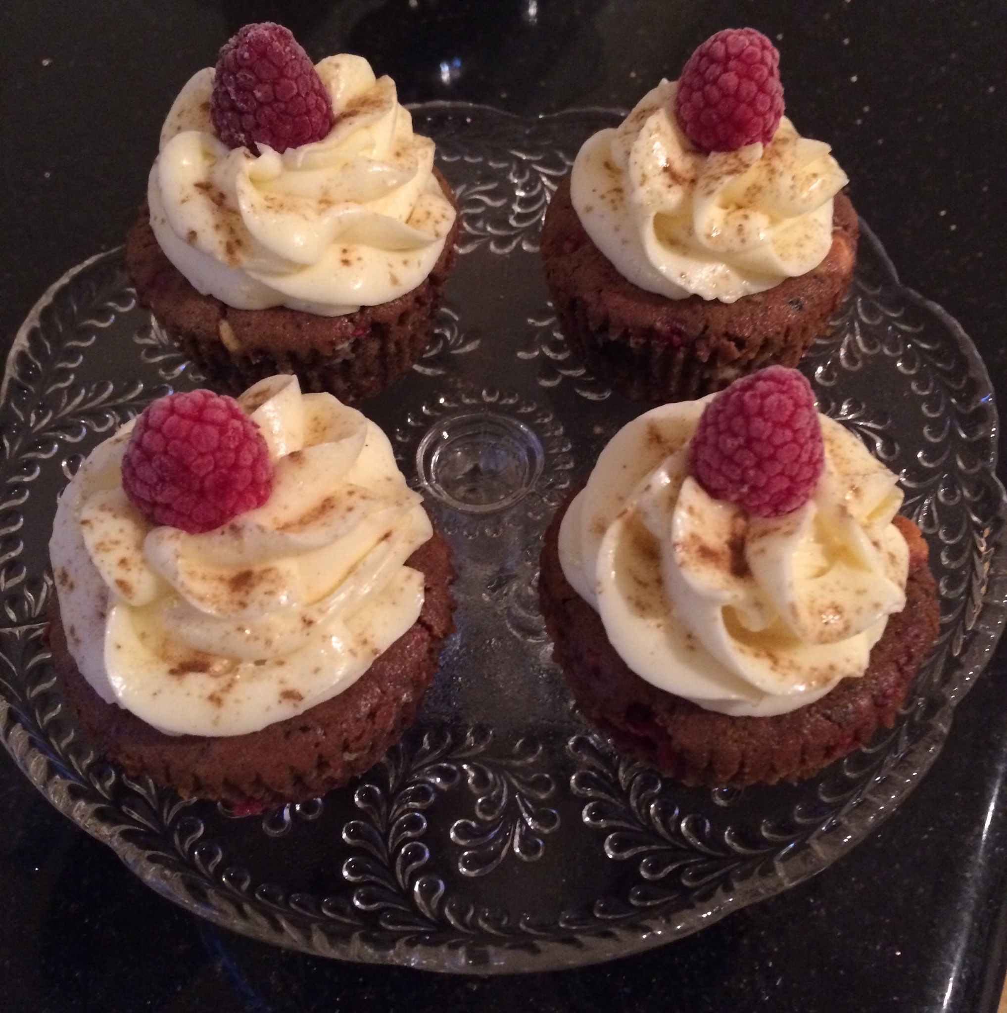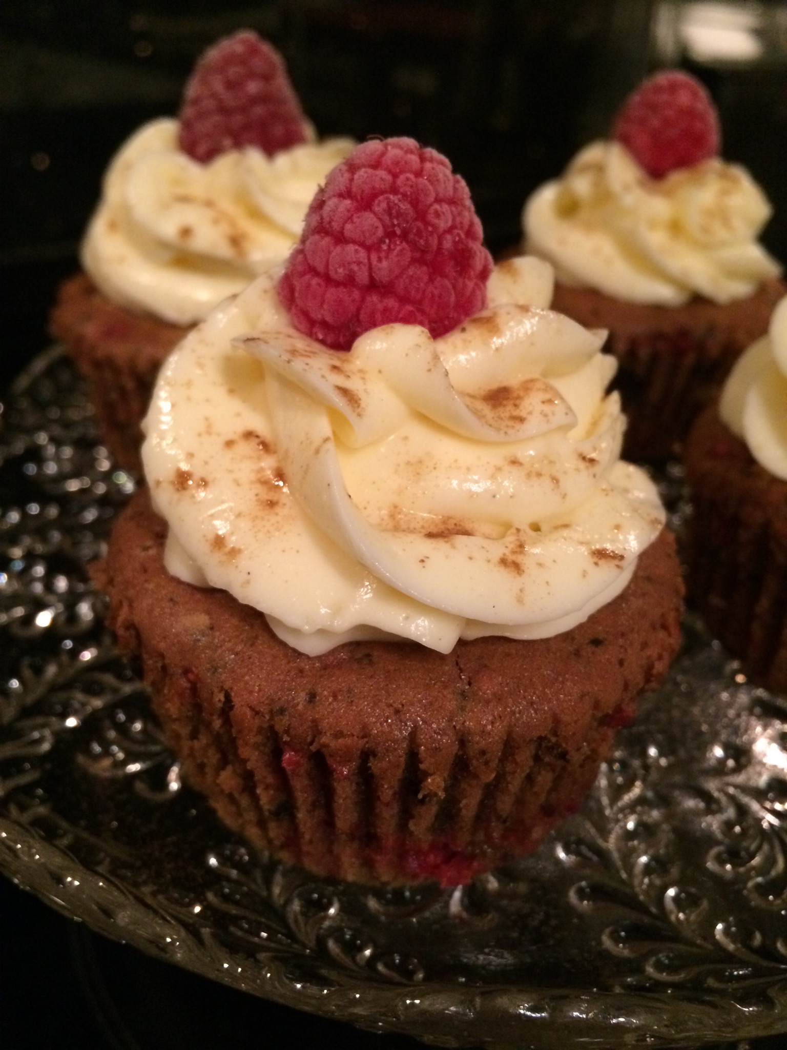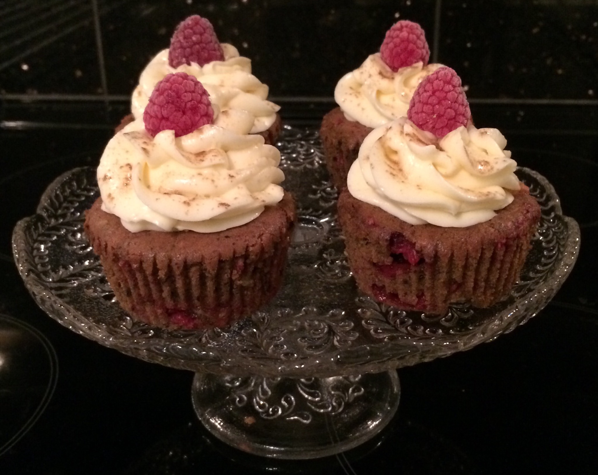 Jeg synes marengs på cupcakes blir i overkant søtt, så jeg laget dem med ostekrem i stedet. Pyntet med litt lakrispulver og et bringebær.
