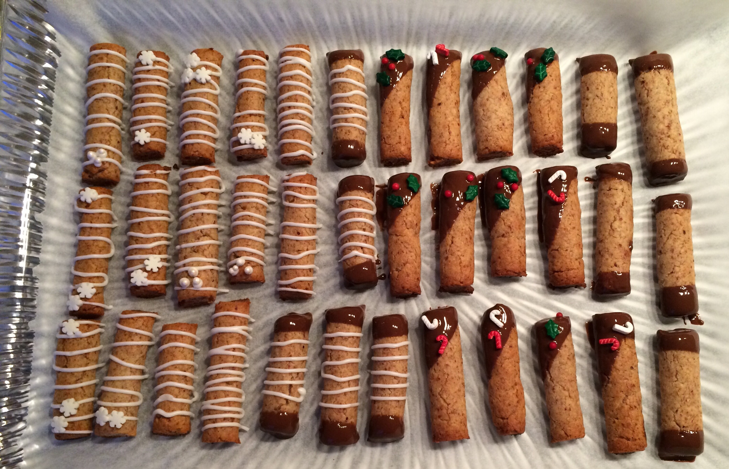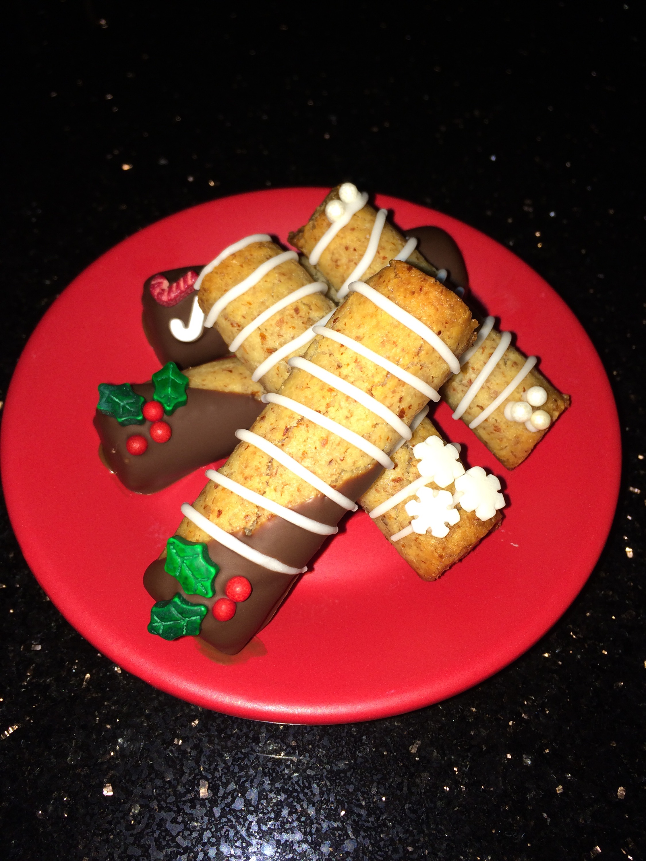 Mandlene kvernes, alt blandes sammen, og bør ligge i kjøleskap til neste dag for å sette seg. Deigen er best å jobbe med når den er romtemperert, så ta den ut litt før du går i gang. Trill pølser på tykkelse med en finger, kutt i passe lange stykker (eller lag ringer i kransekakeformer). Stengene stekes ved 200 grader i ca 8 minutter, ikke for lenge, de skal være seige. Pynt etter ønske. Jeg brukte smeltet sjokolade, royal icing og julete strø: