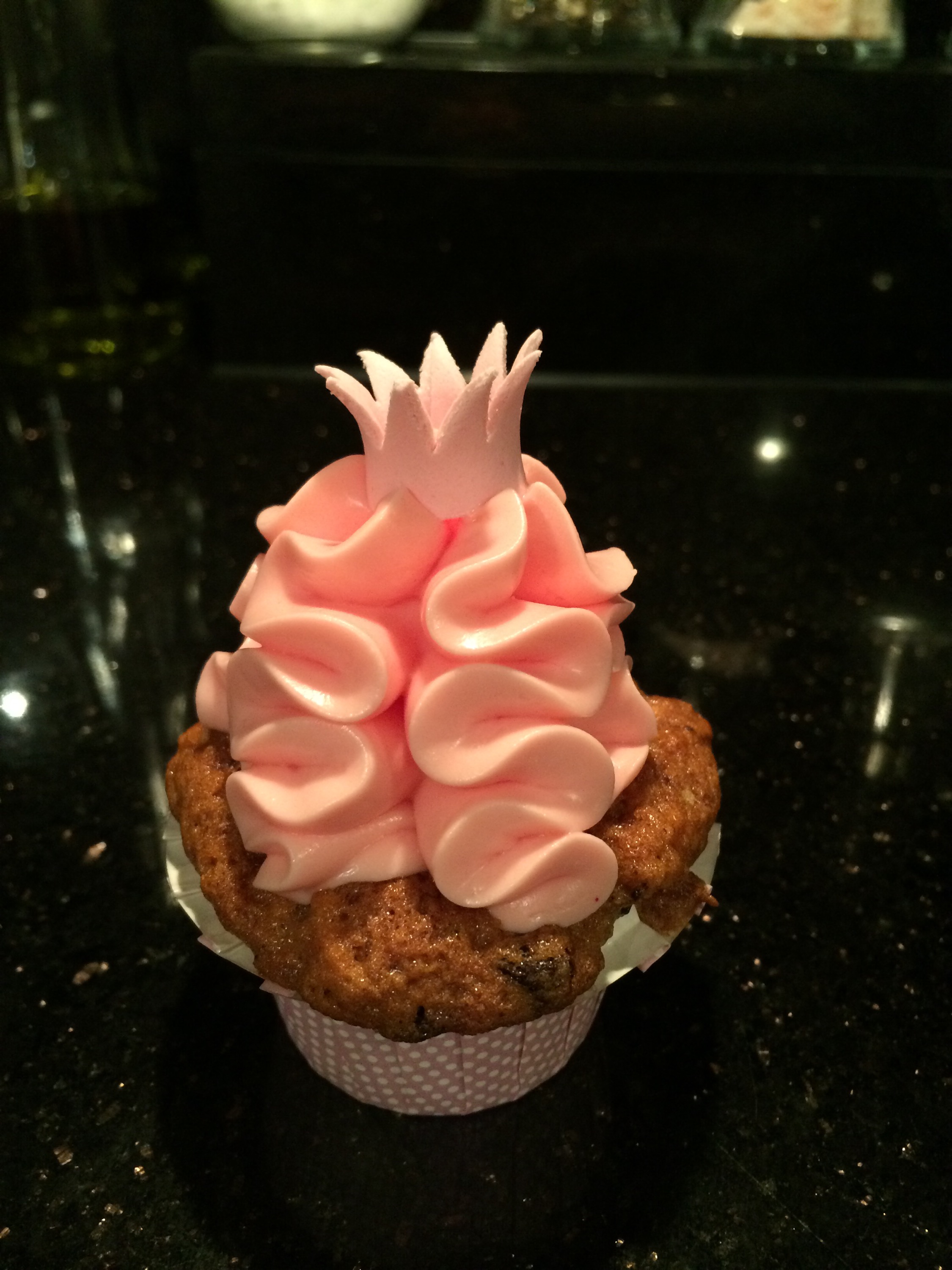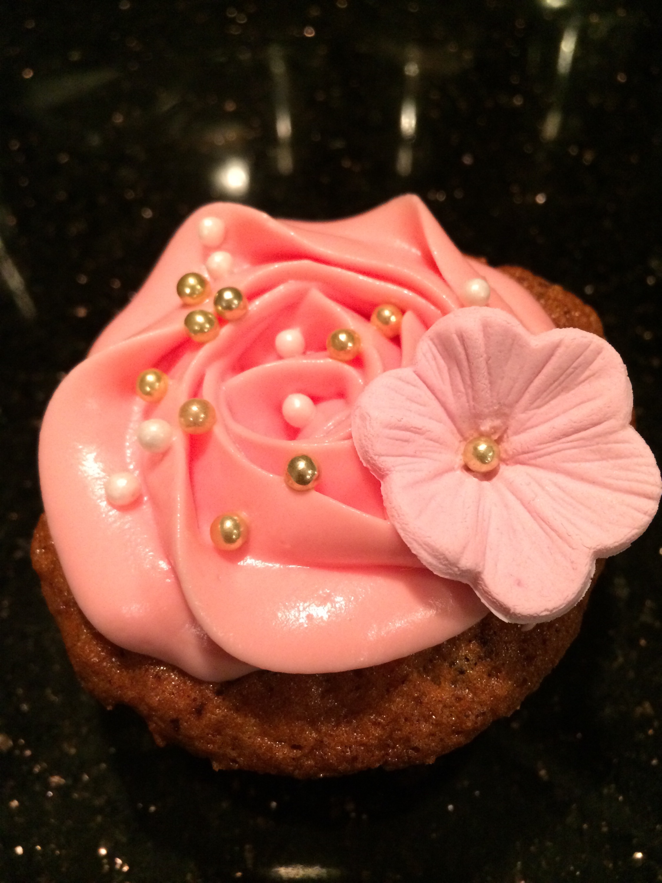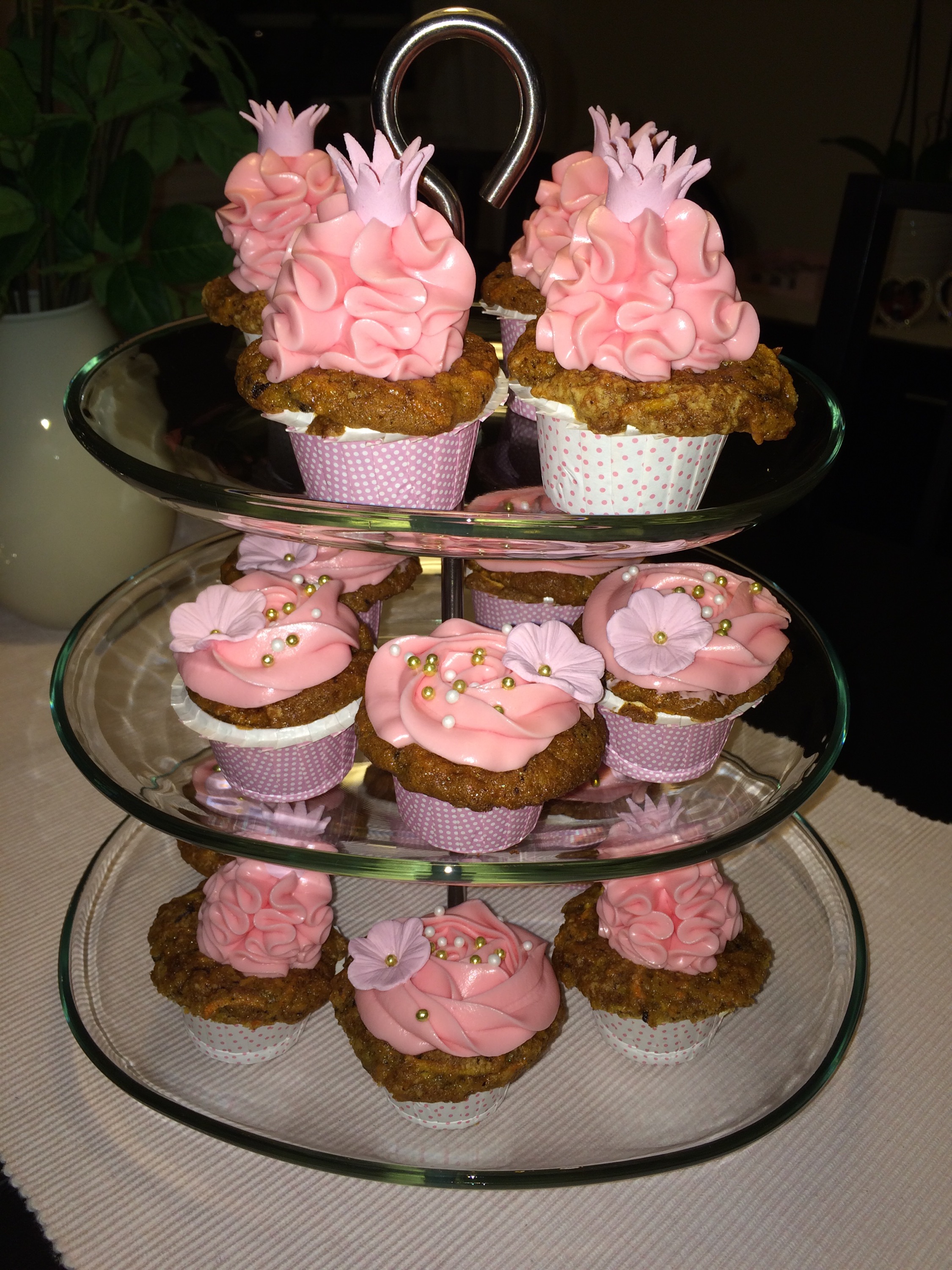 Nest ut ble gulrot-cupcakes ala ROOM med ostekrem. Jeg har laget den samme oppskriften i liten langpanne tidligere og visste at den var god på smak. Teksturmessig egner den seg nok bedre i kakeform, for jeg synes det var litt vanskelig å få fordelt røren i formene og steke jevnt pga gulroten og eplet. Men de ble nå bra med litt ostekrem pent sprøytet på toppen, og marsipanpynt og perler. Små prinsessekroner og blomster en liten snuppe verdig 🙂