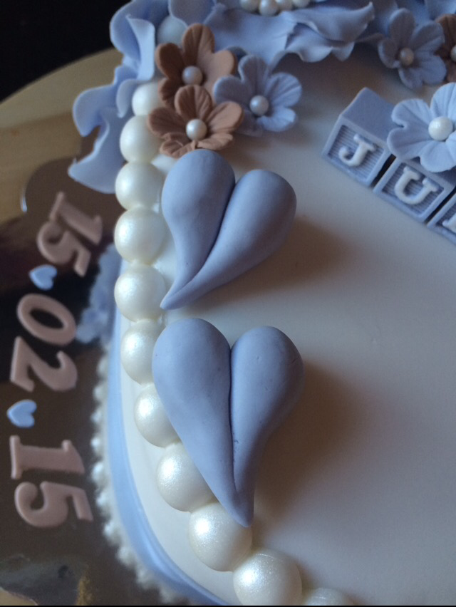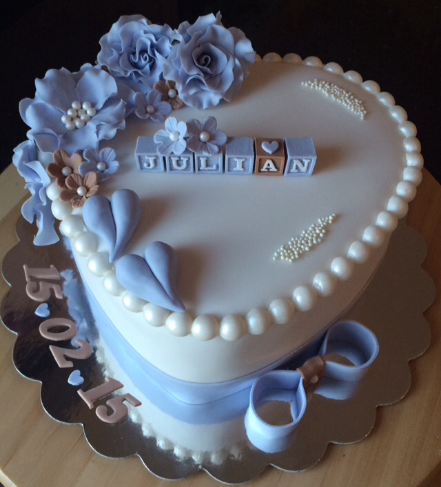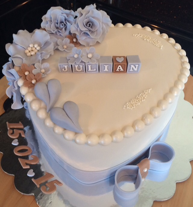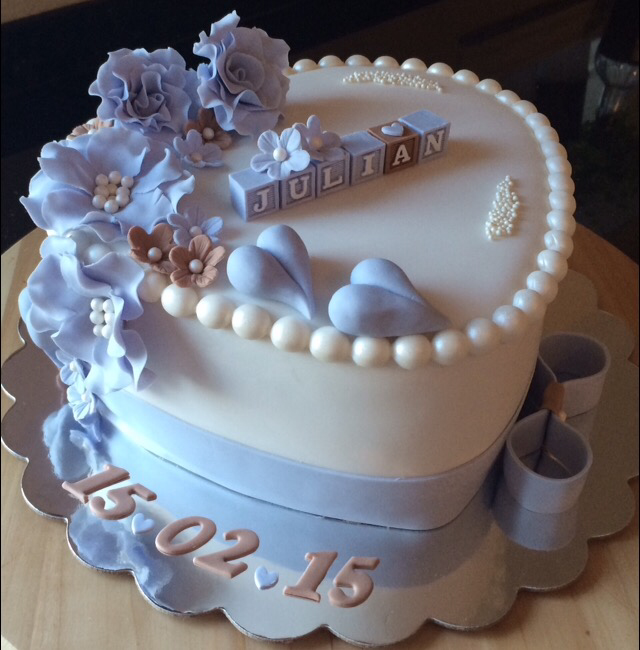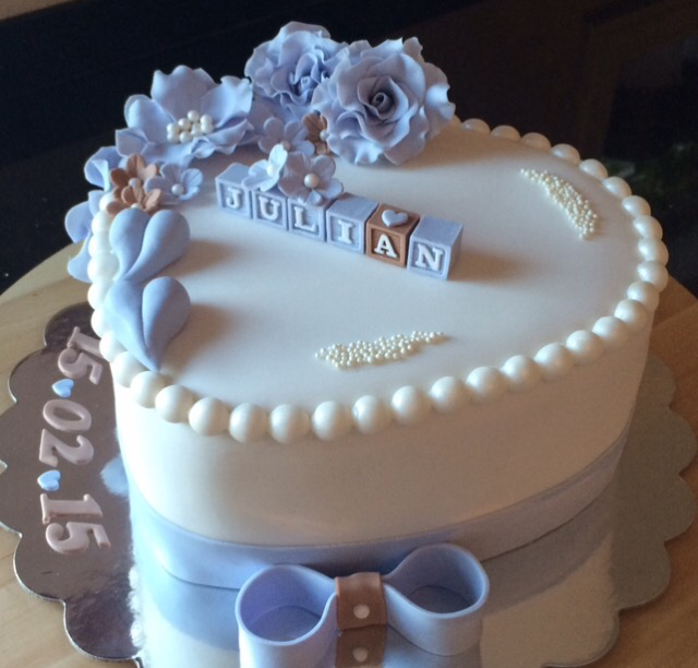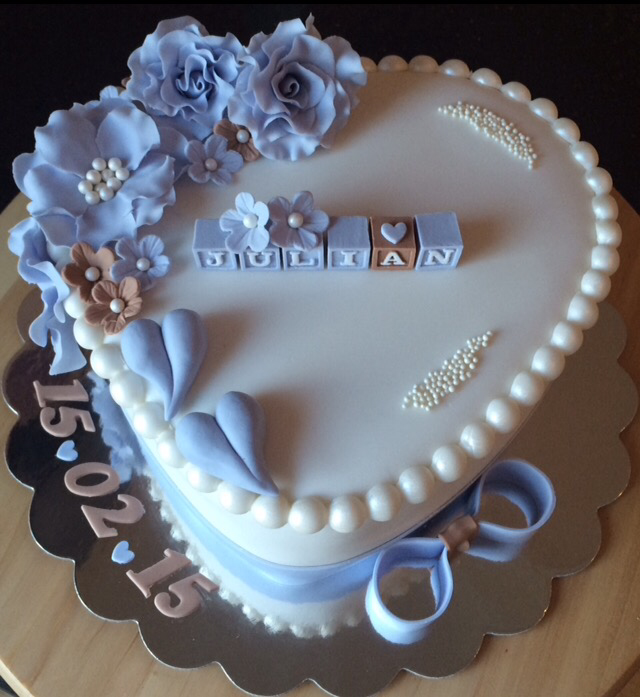 Søndagens dåpskake ble til den lille gutten til ei jeg hadde sommerjobb med for noen år siden. Hun ønsket seg en hjerteformet kake, og ville også ha hjerter som en del av pynten. Dette ble min første hjerteformede dåpskake, og det var som vanlig gøy å lage noe nytt 🙂