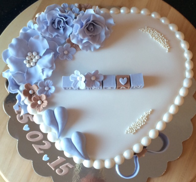 Når det gjelder utseende er kaken dominert av en lys gråblå farge med lysebrune innslag. Jeg laget noen litt tredimensjonale hjerter, samt roser, fantasiblomster og småblomster. Navneklosser og perler som på de fleste av dåpskakene mine. Nederst har jeg laget et kantbånd og en sløyfe. Ta en titt: