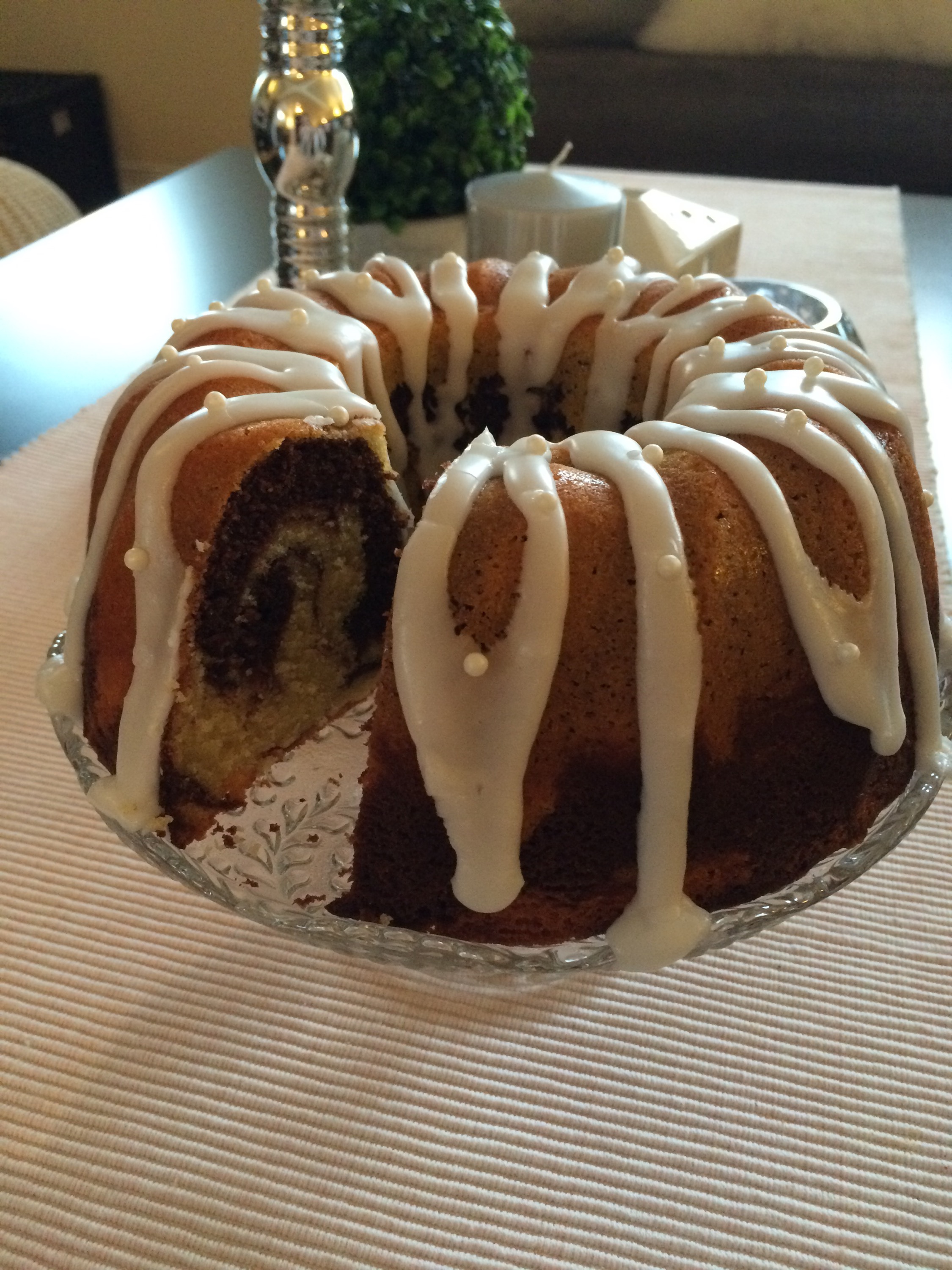 Jeg brukte denne oppskriften, ringlet litt tykk melisglasur over og pyntet med noen sukkerperler:
