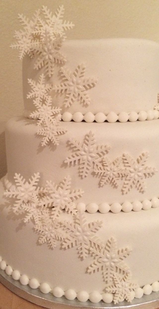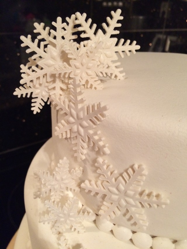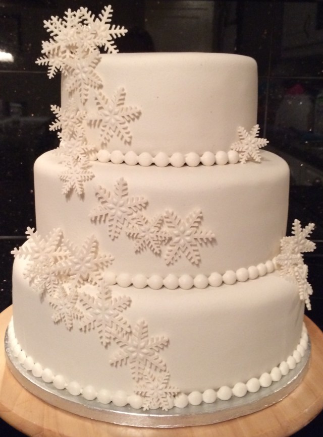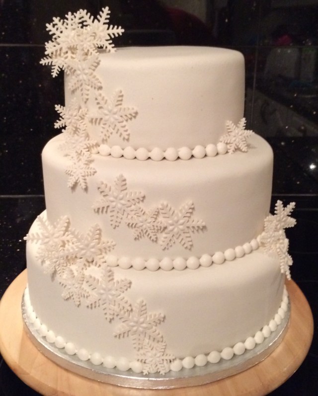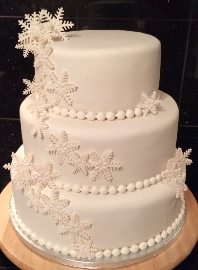 Herlighet, dette må være mitt mest forsinkede innlegg noen gang. For to uker siden laget jeg altså bryllupskake. Temaet for denne var vinterhvitt og skimrende snøfnugg – enkelt og elegant!